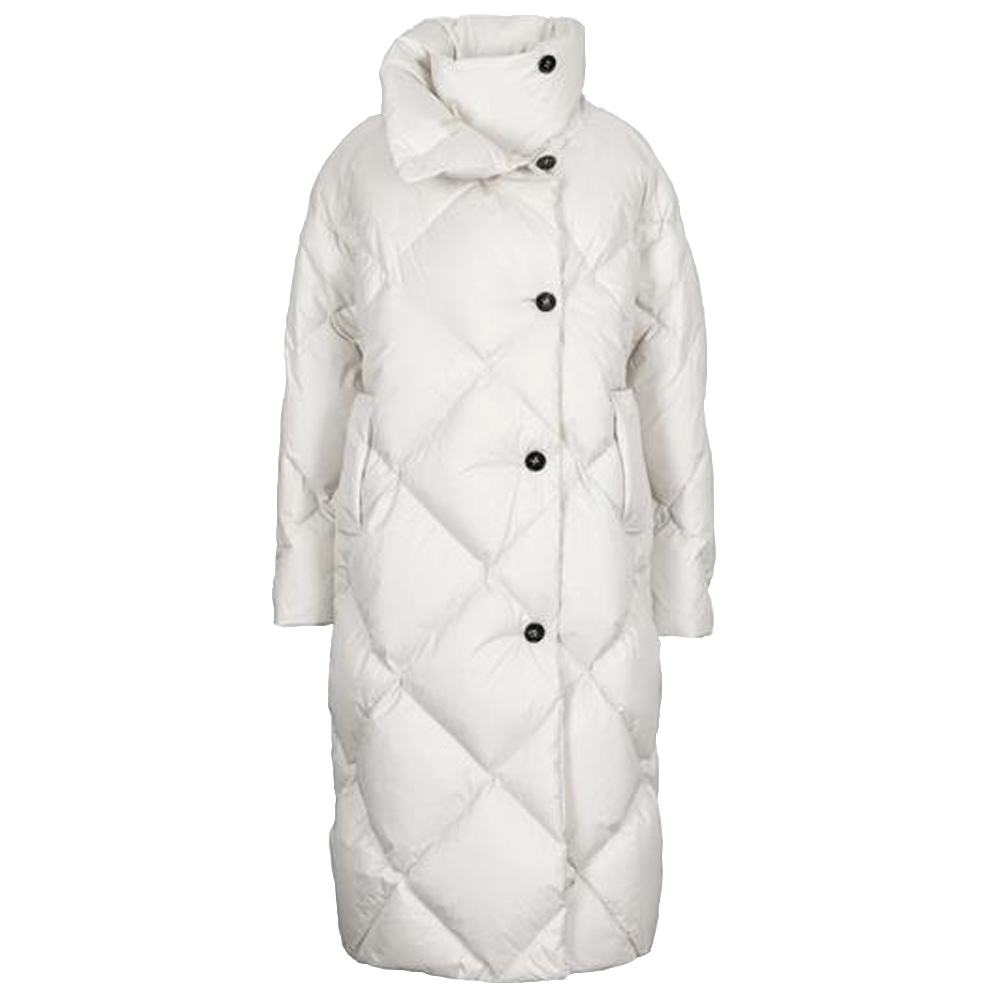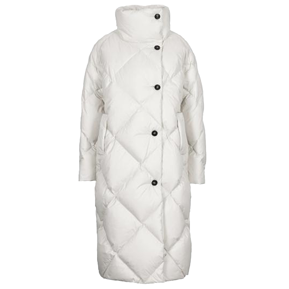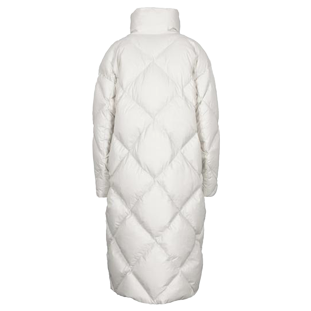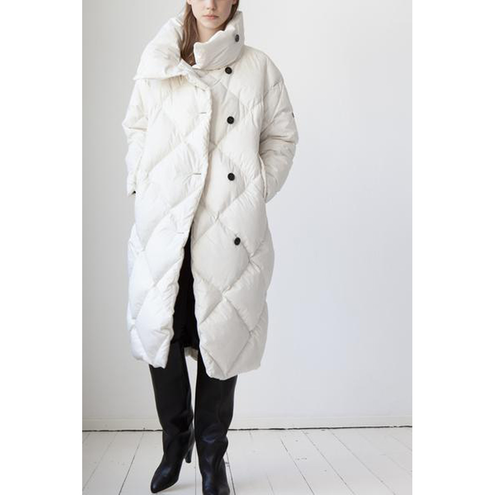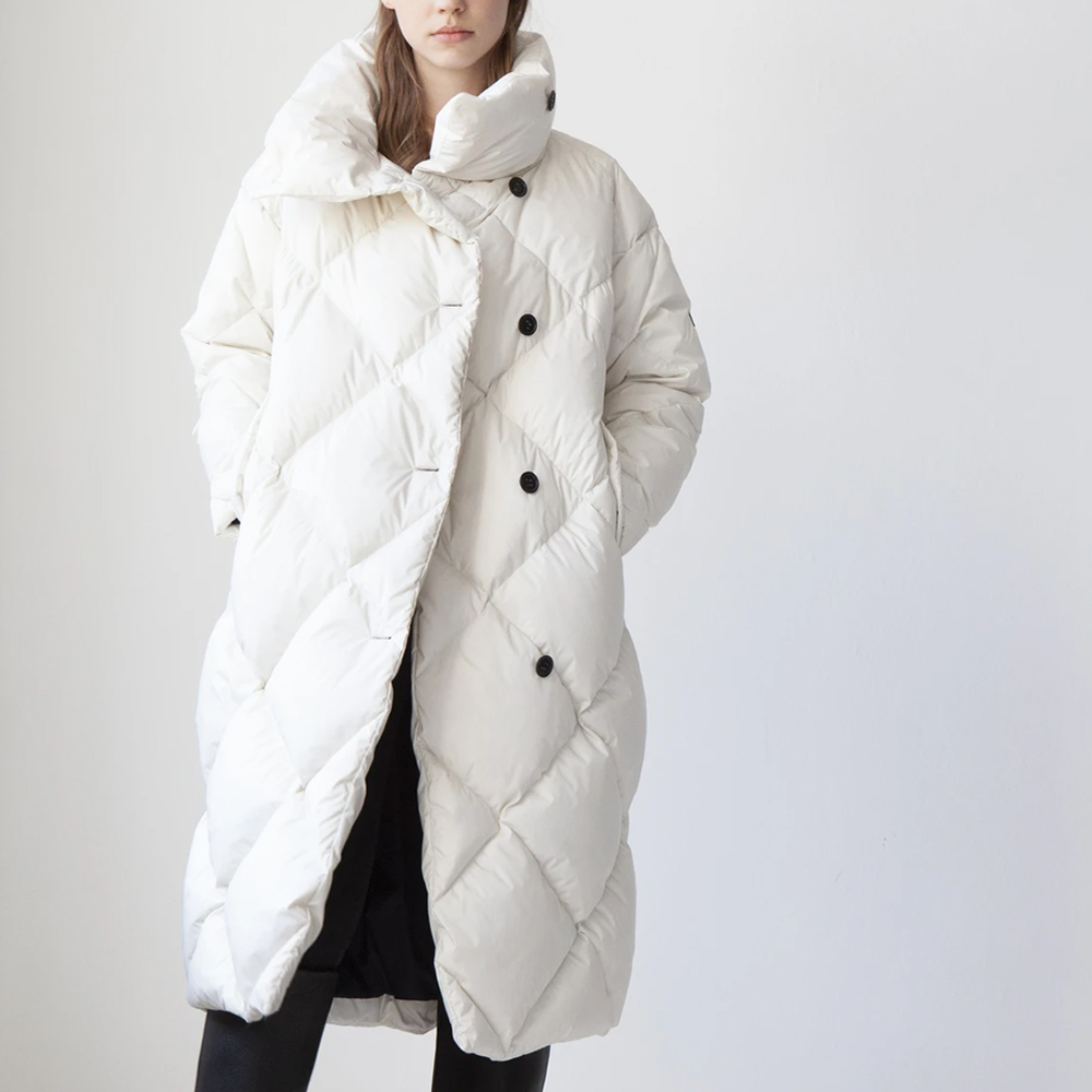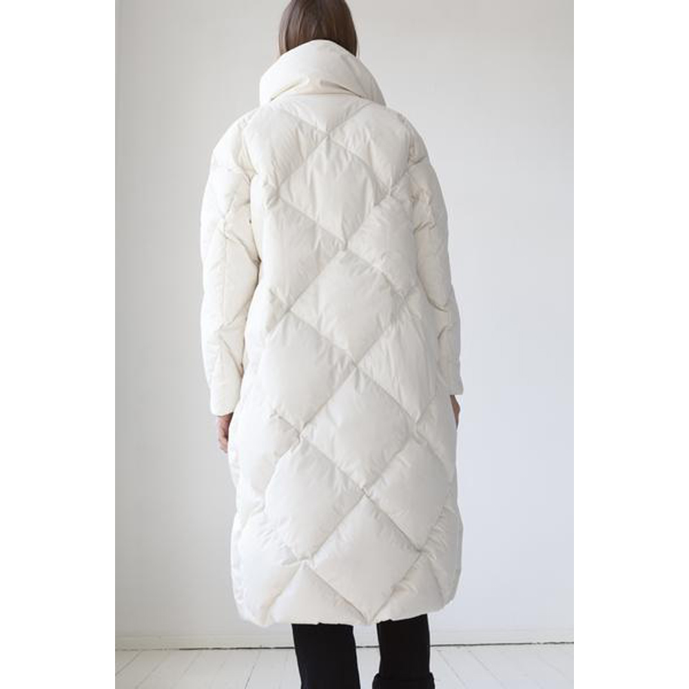 가벼운 무게와 구스다운 충전재로 보온성이 뛰어난 다이아몬드 퀼팅 패턴 롱 다운코트