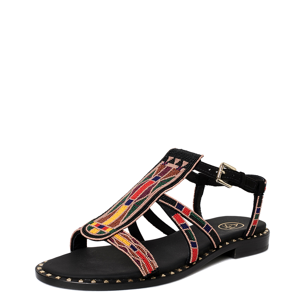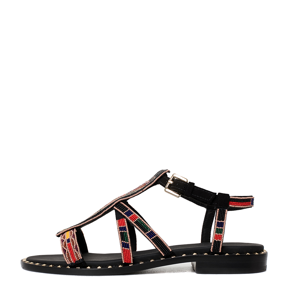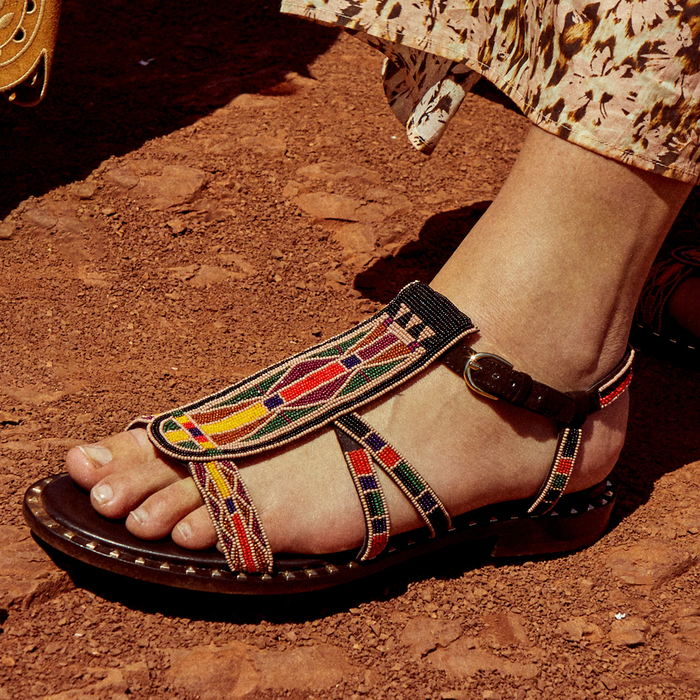 - 비즈로 만들어진 컬러풀한 스트랩이 에스닉한 무드의 플랫 샌들