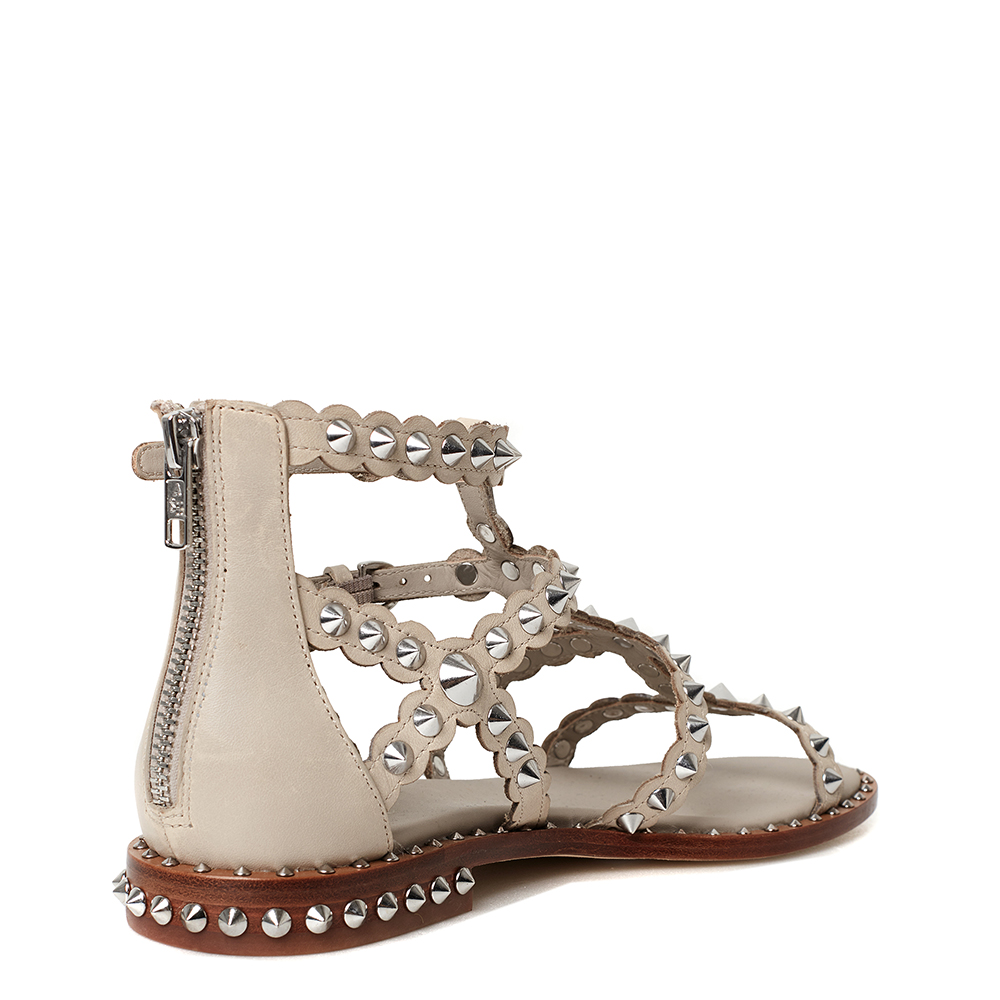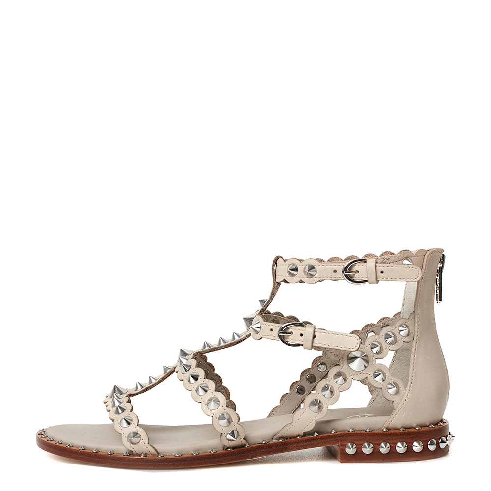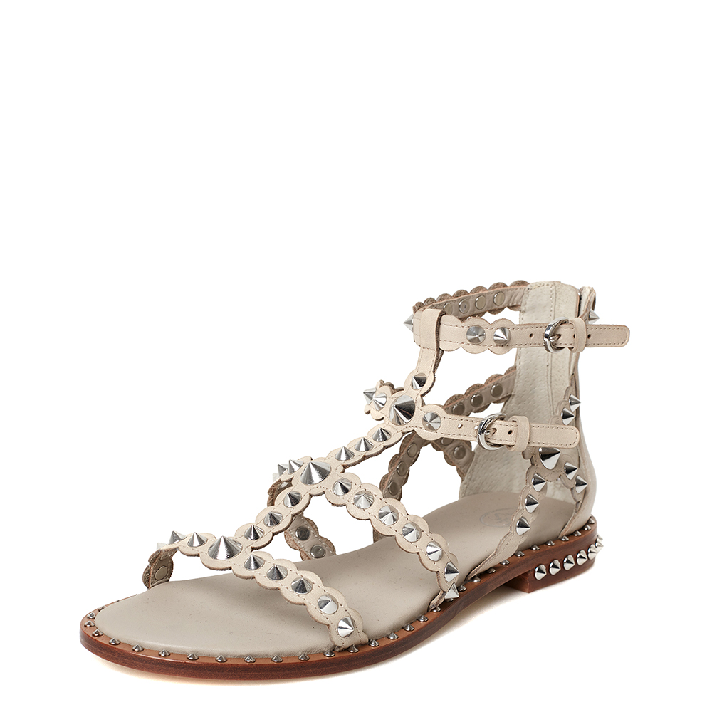 - 메탈 스터드 장식과 물결모양의 페미닌한 무드의 스트랩 조화가 유니크한 글래디에이터 스타일의 스트랩 샌들