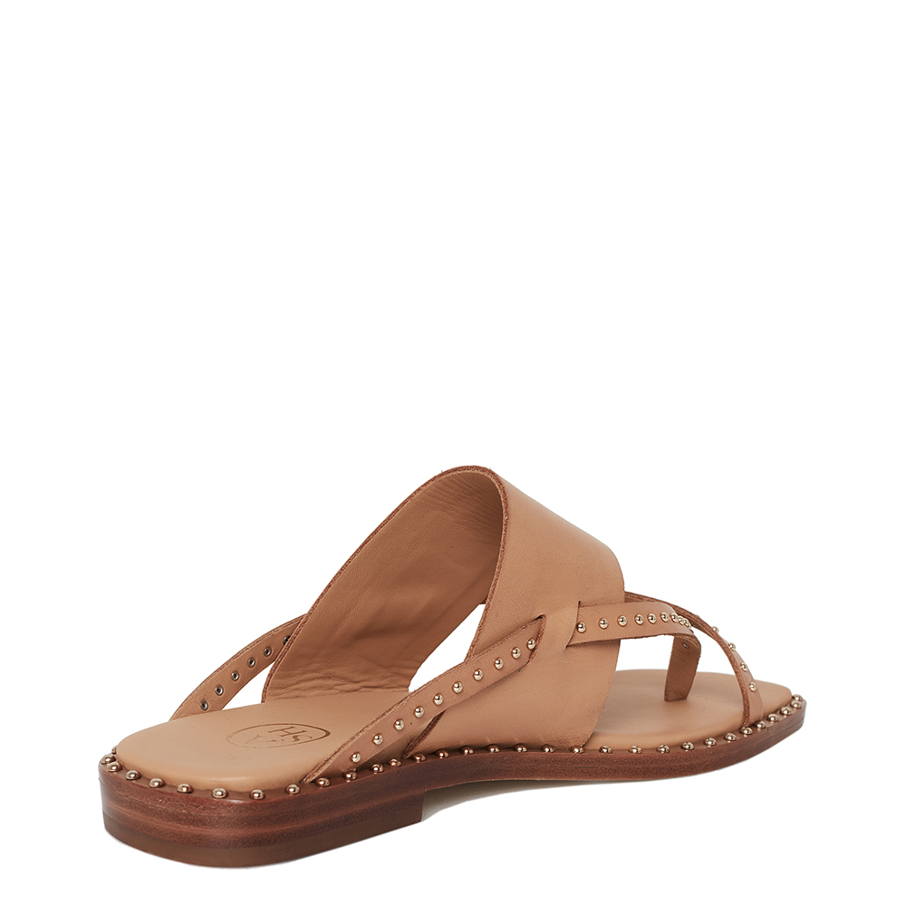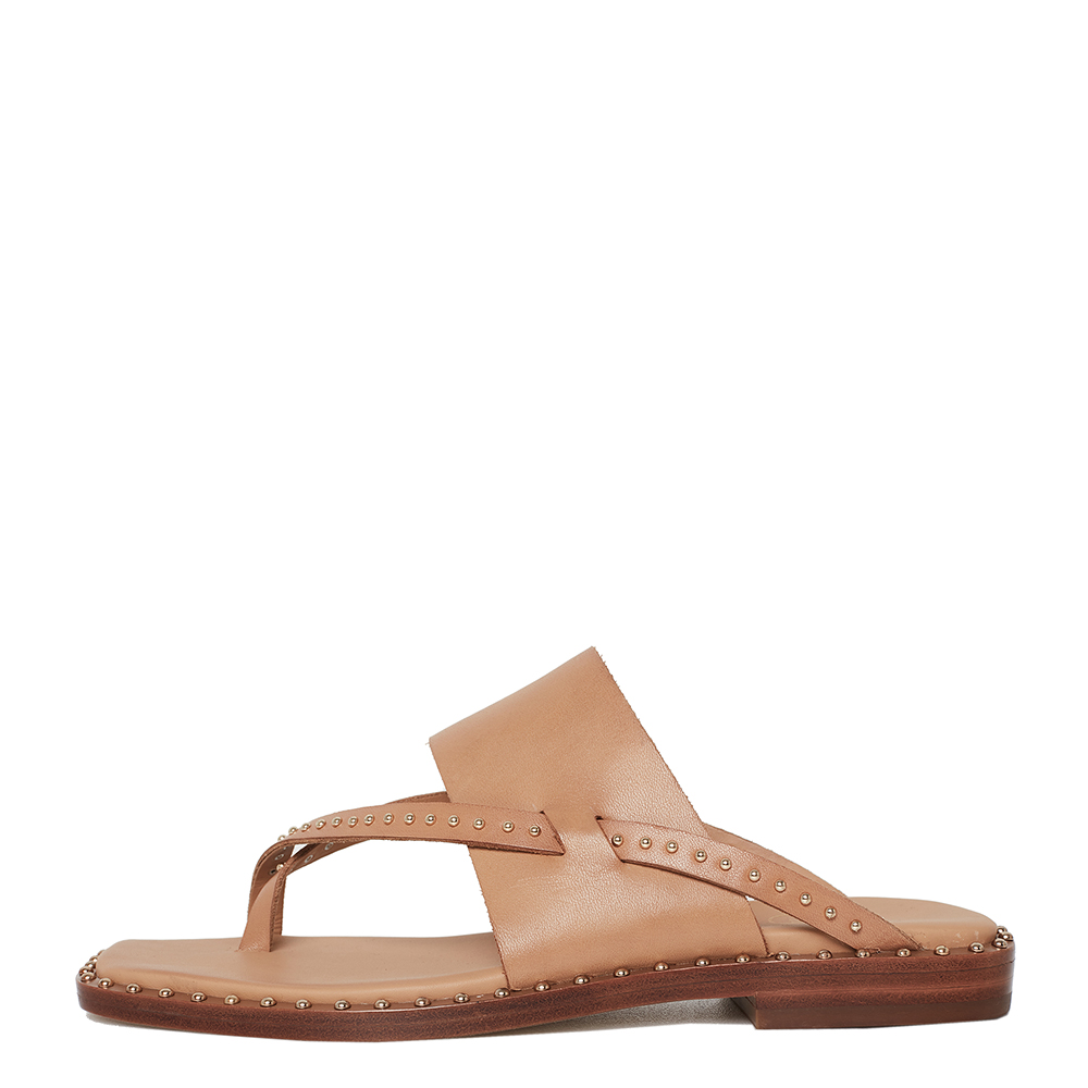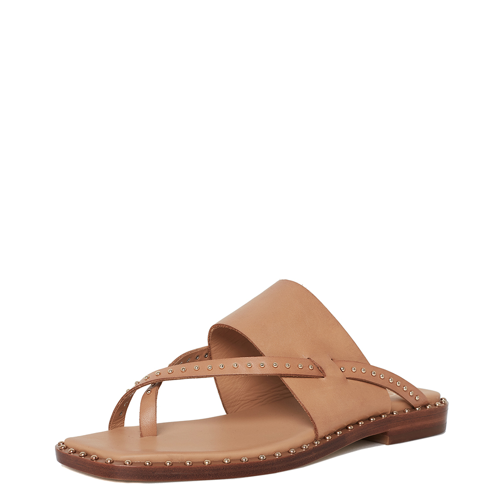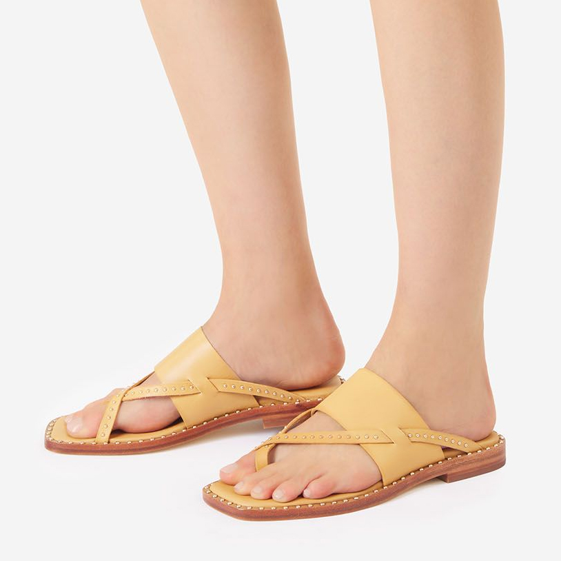 - 넓은 레더 밴드와 작은 스터드가 장식된 가느다란 스트랩의 조화가 세련된 무드의 슬리퍼 샌들