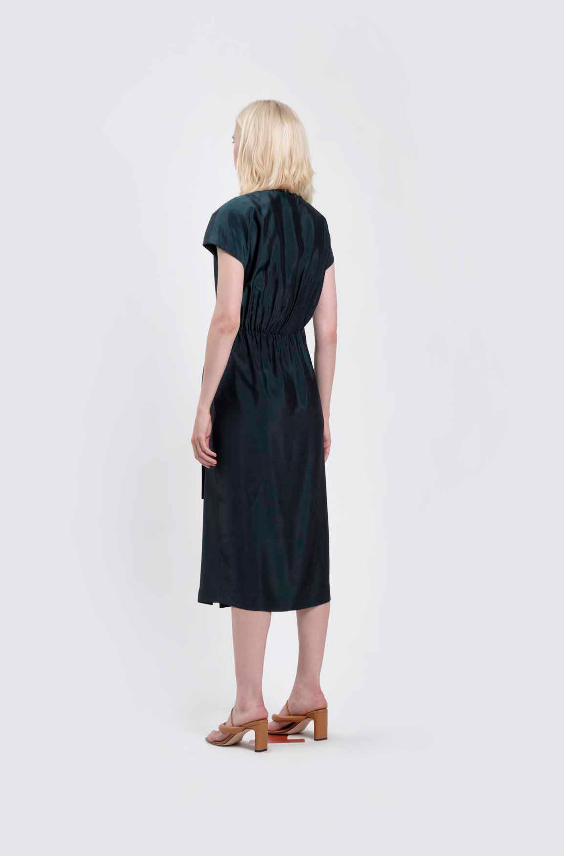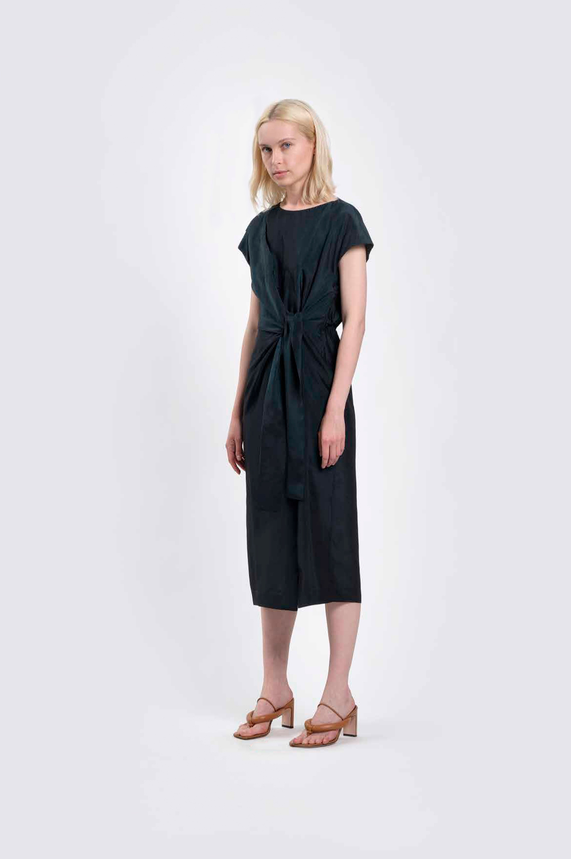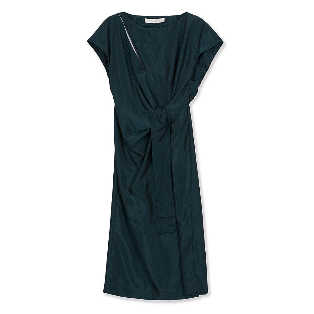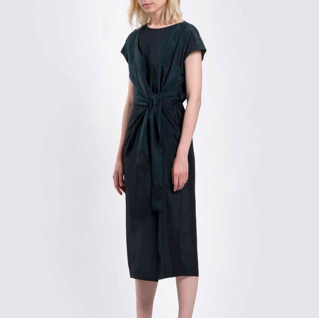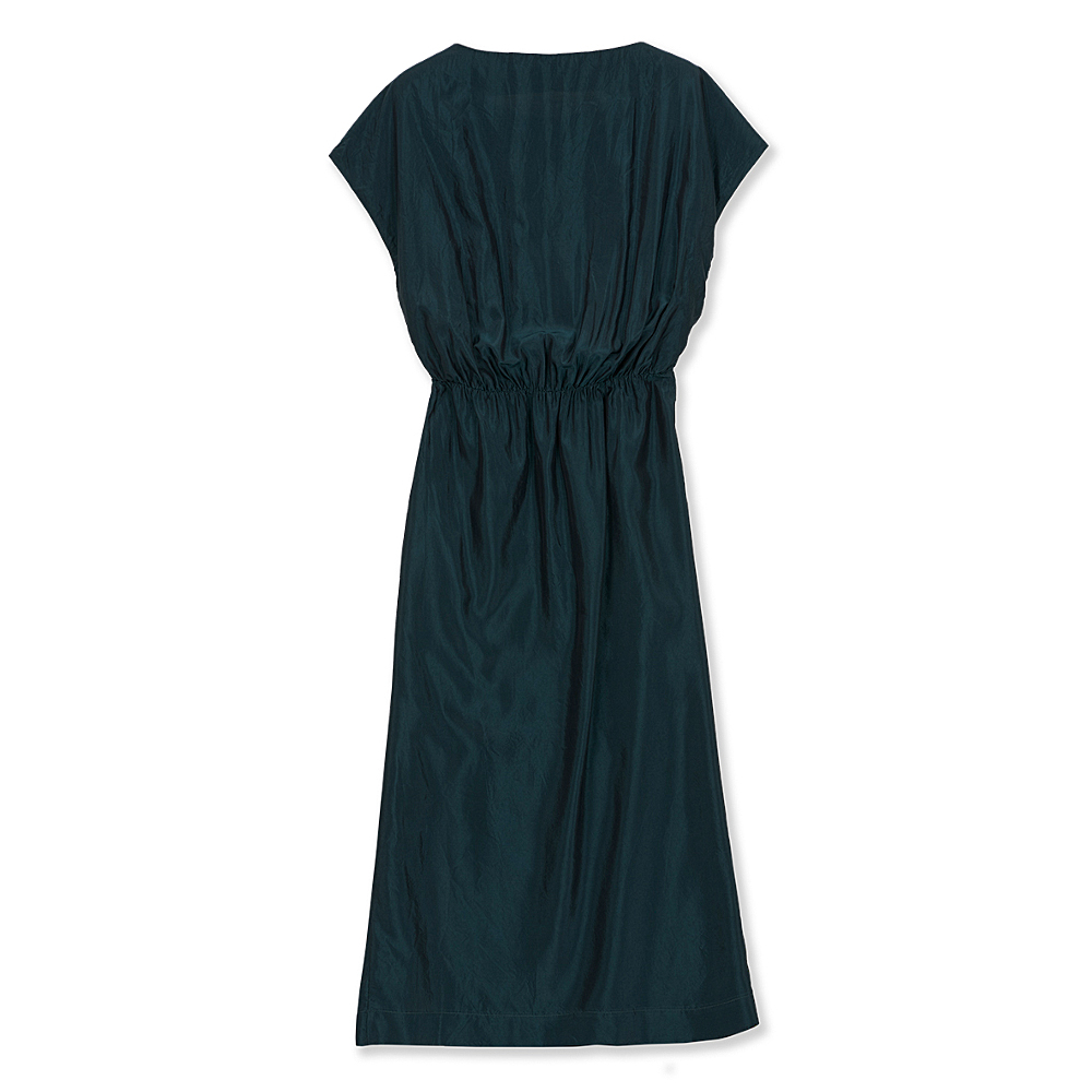 '가슴라인의 비대칭 슬릿 포인트와 허리라인의 트위스티드 포인트가 유니크한 원피스. 큐프로 소재로 하늘하늘한 실루엣이 여성스러운 제품