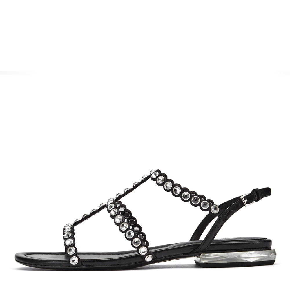 -크리스탈 스톤 장식에 메탈릭 터치가 가미된 굽의 스트랩 샌들