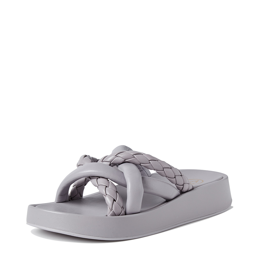 -패디드 레더 스트랩 슬리퍼. 플랫폼 아웃솔에 트위스티드 스트랩이 트렌디한 제품