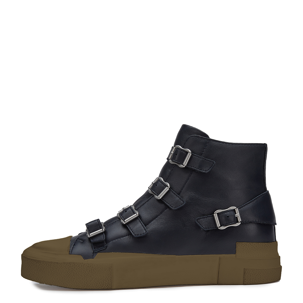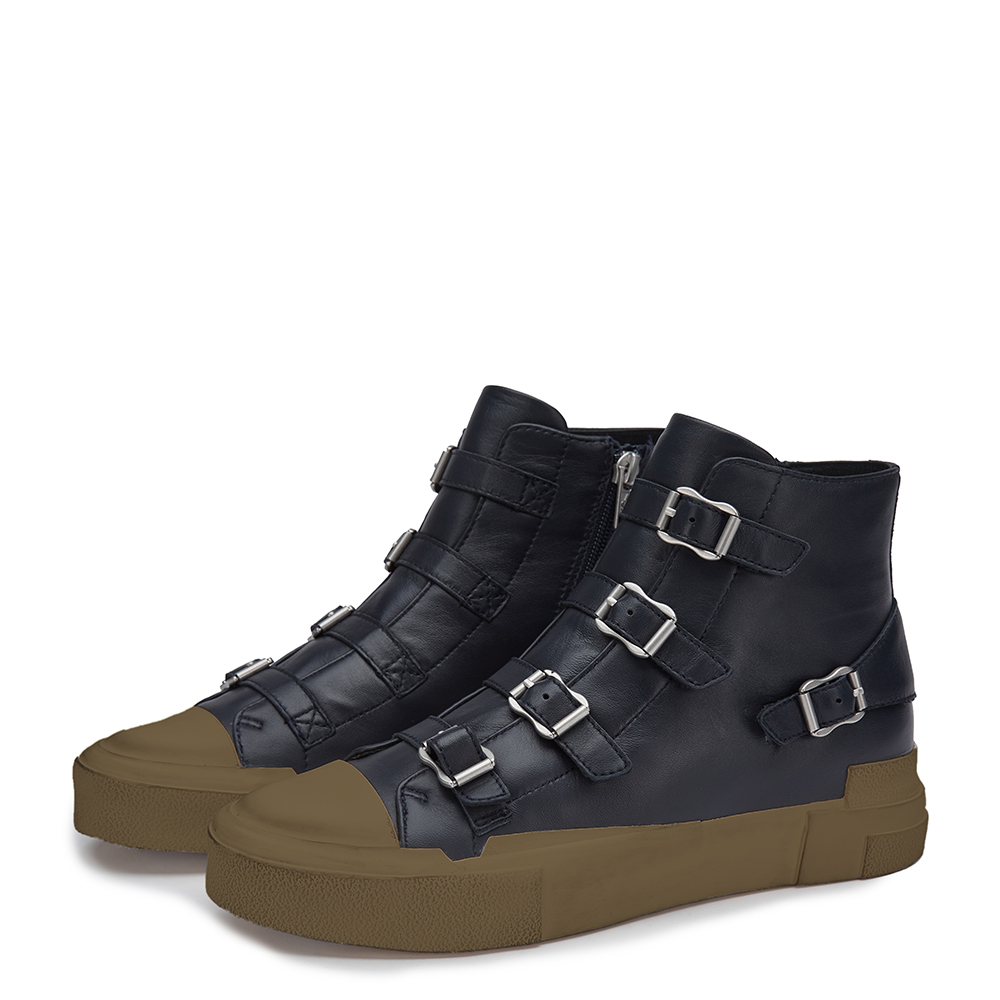 버클장식에 구조적 아웃솔이 포인트인 가죽 하이탑 스니커즈