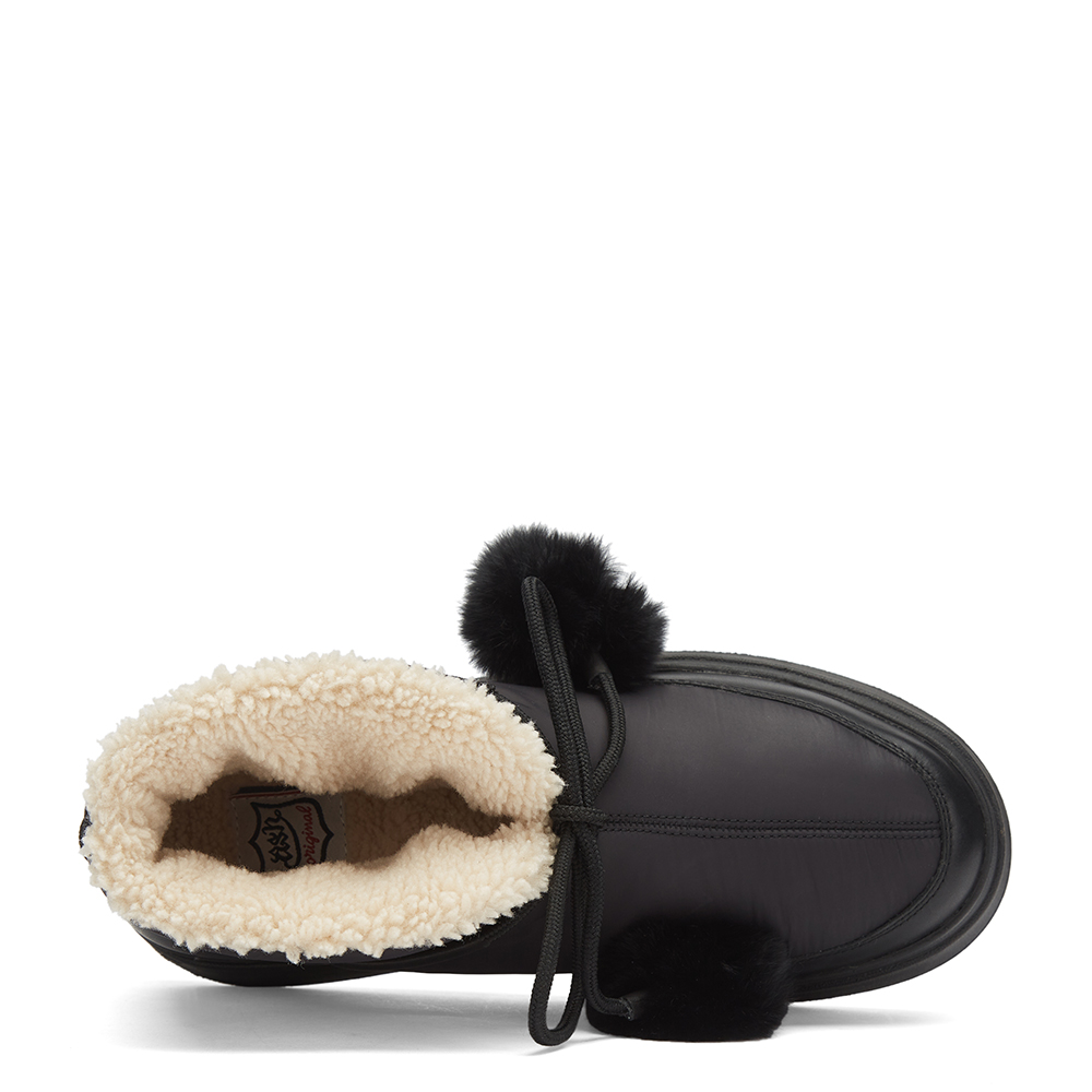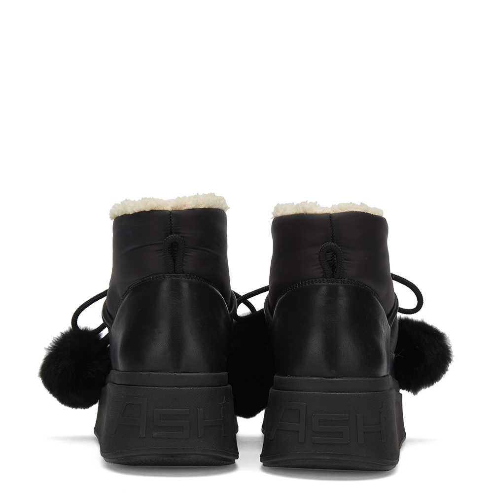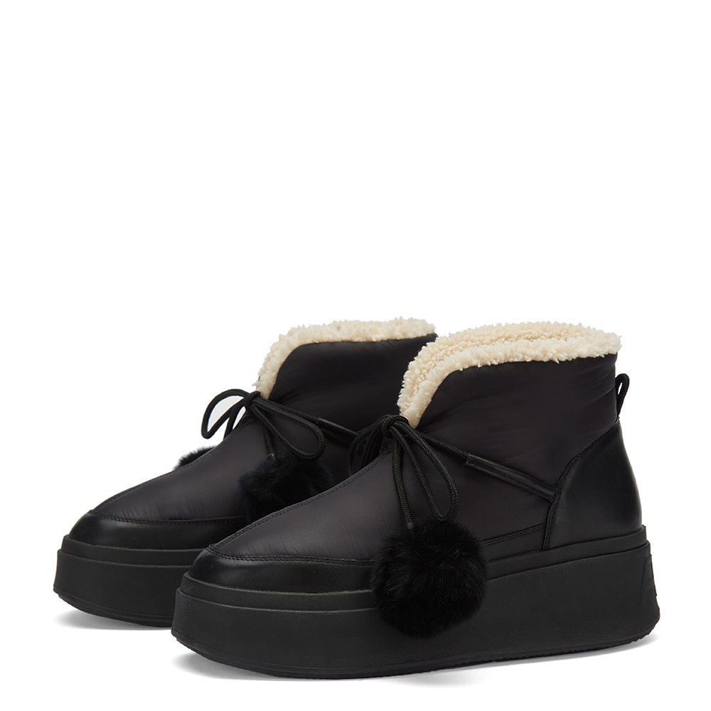 55mm의 플랫폼 아웃솔의 패딩부츠. 페이크퍼 폼폼 트리밍의 스트링을 묶어 귀엽게 연출할 수 있는 제품