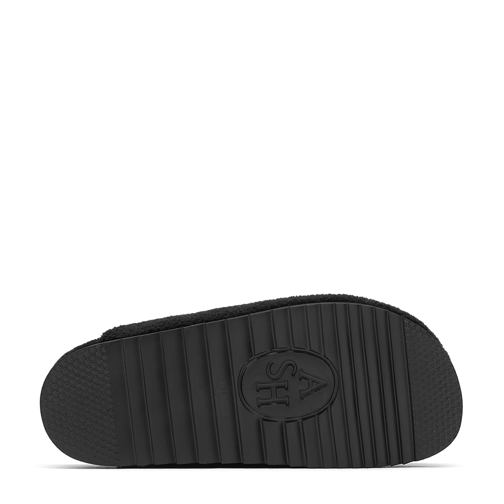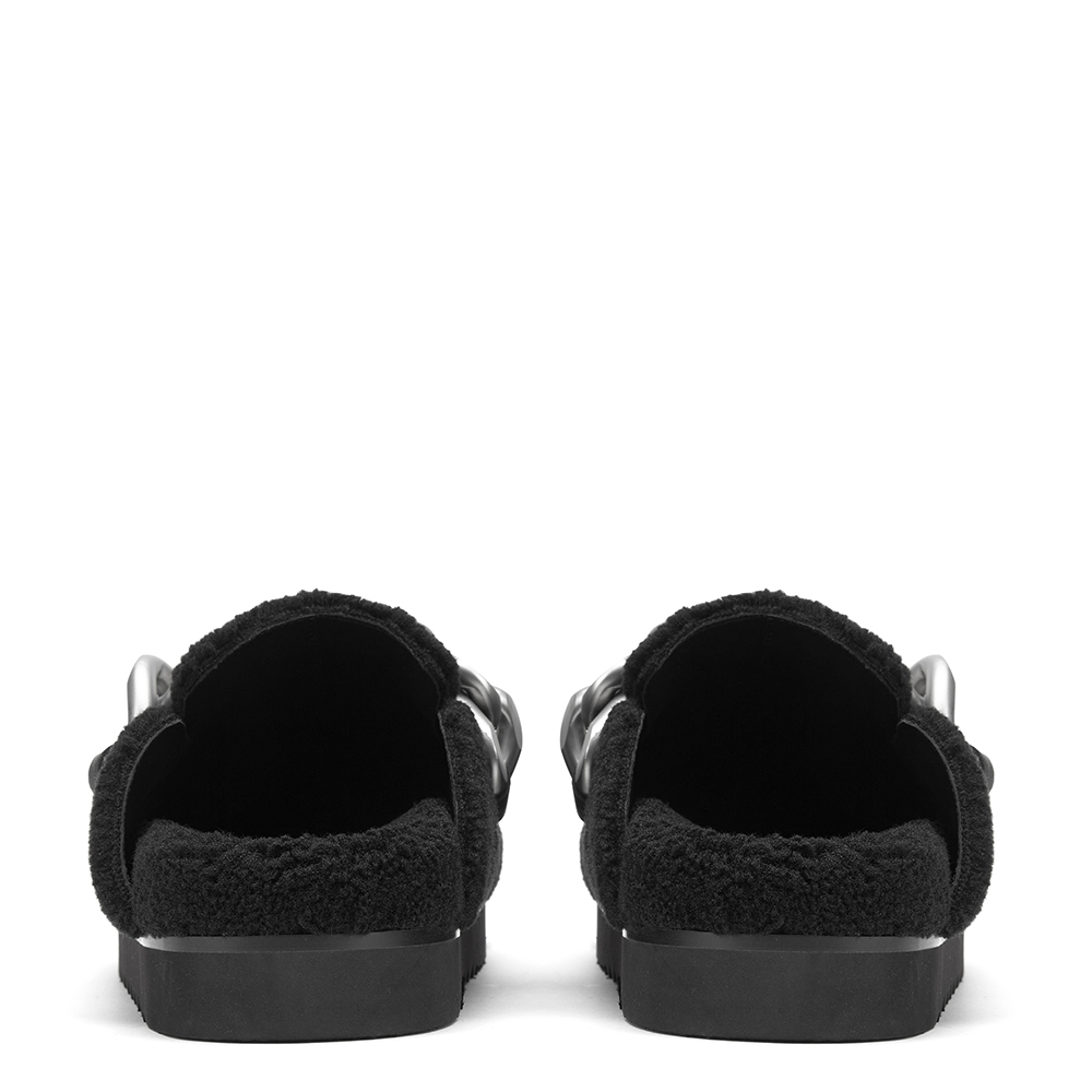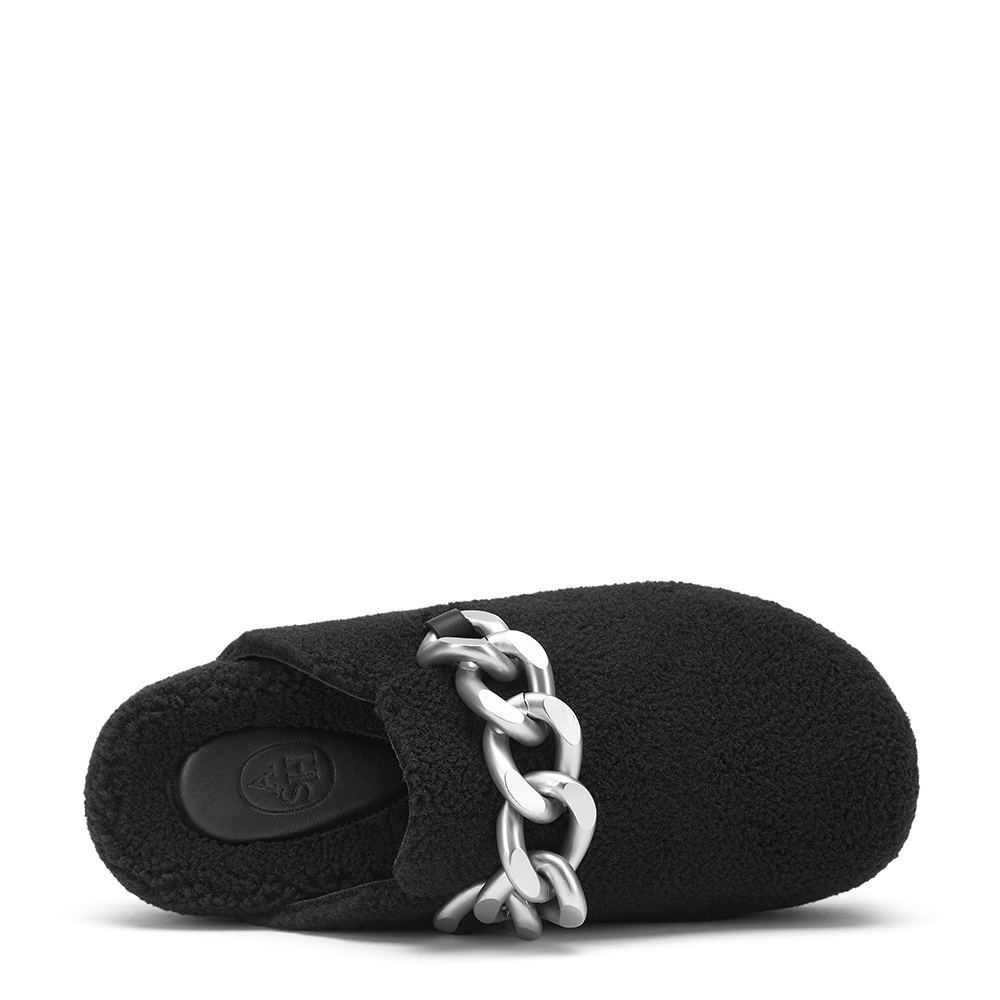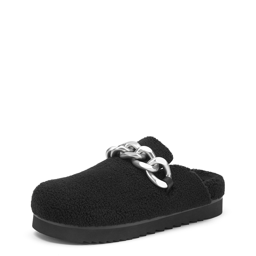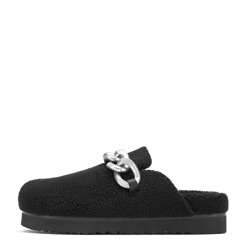 페이크퍼와 체인 콤비로 트렌디하면서도 이지한 무드의 퍼 슬리퍼