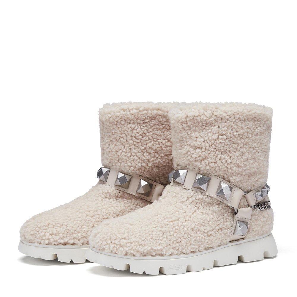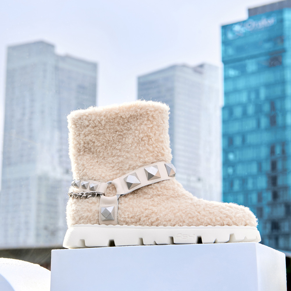 - 페이크퍼와 체인 콤비로 트렌디하면서도 이지한 무드의 퍼 부츠