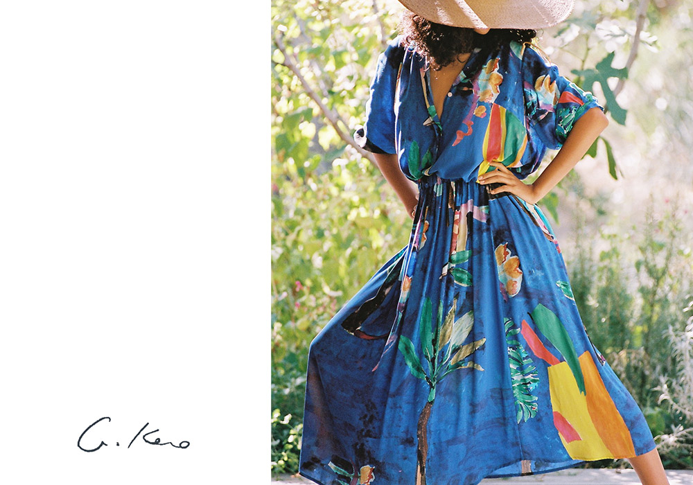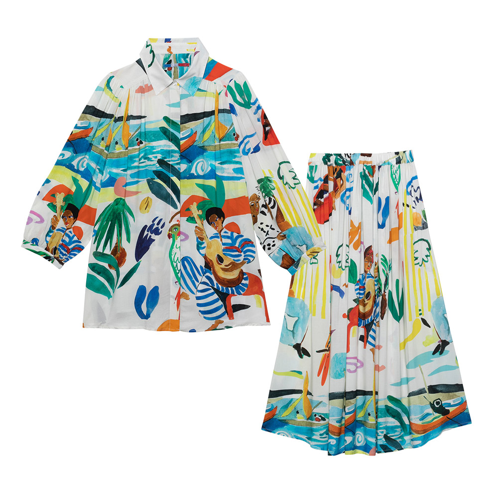 화려한 색감과 수채화 느낌이 조화를 이루는 일러스트레이팅 패턴을 통해 옷 위에서 펼쳐지는 스토리 텔링이 인상적이다.