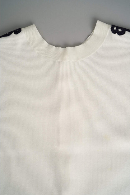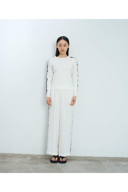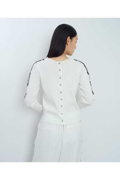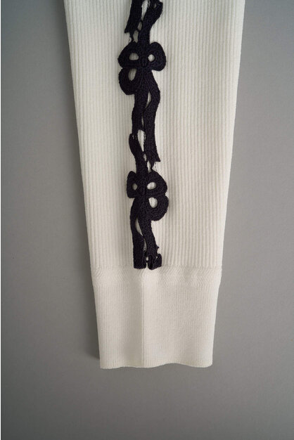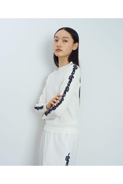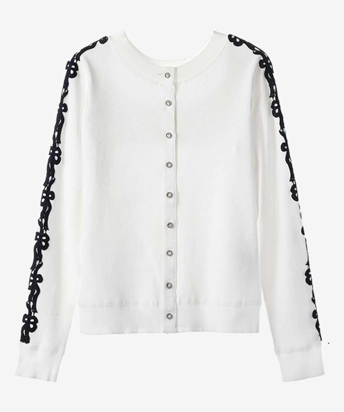 슬리브에 리본을 묶어 둔 듯한 레이스 자수가 유니크한 가디건. 투웨이 코디가 가능한 제품으로 가디건이나 풀오버 니트로 착용이 가능한 상품