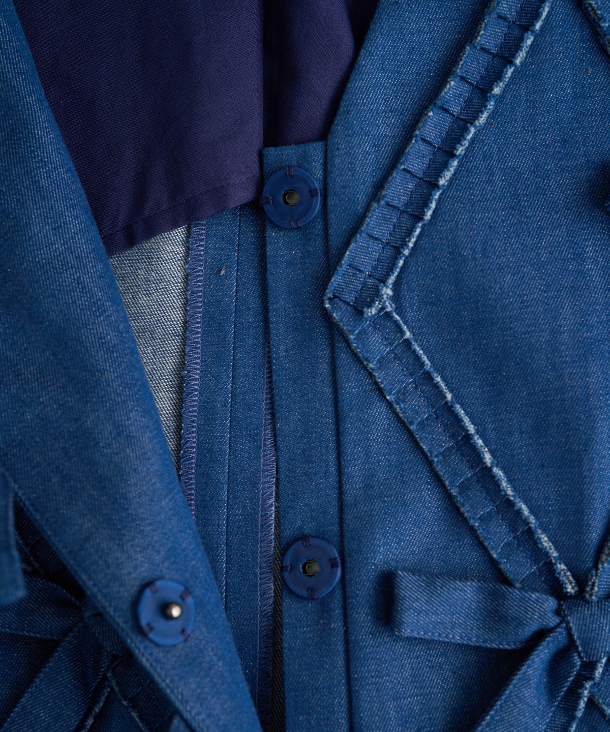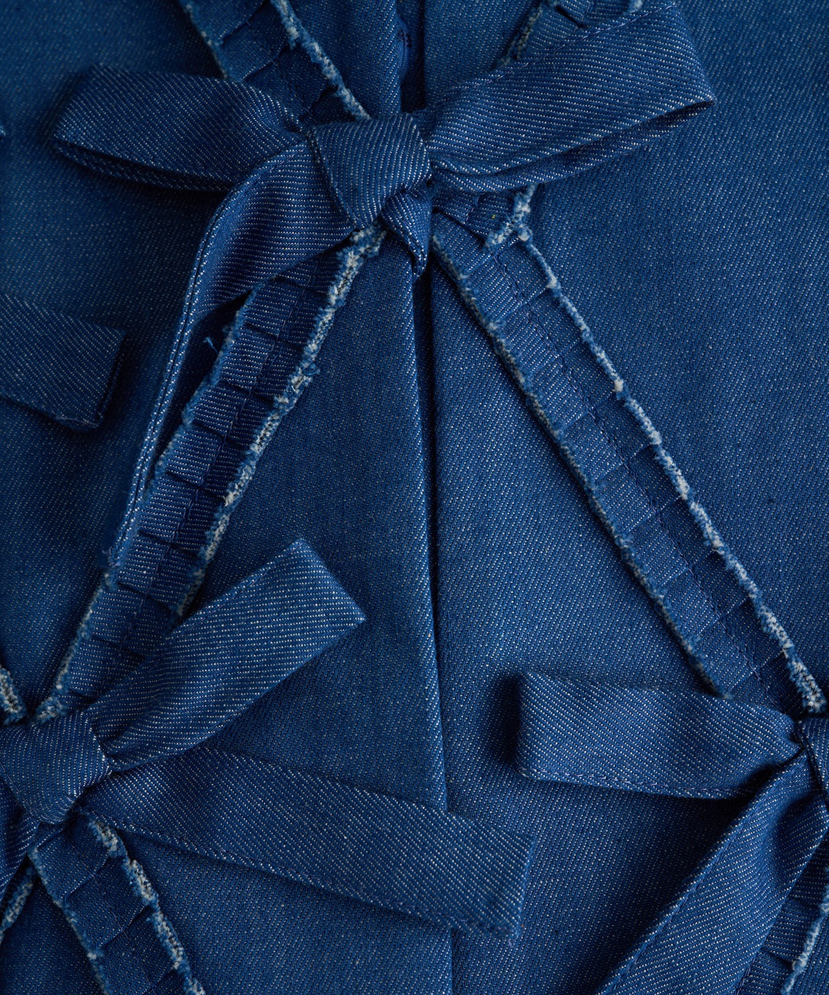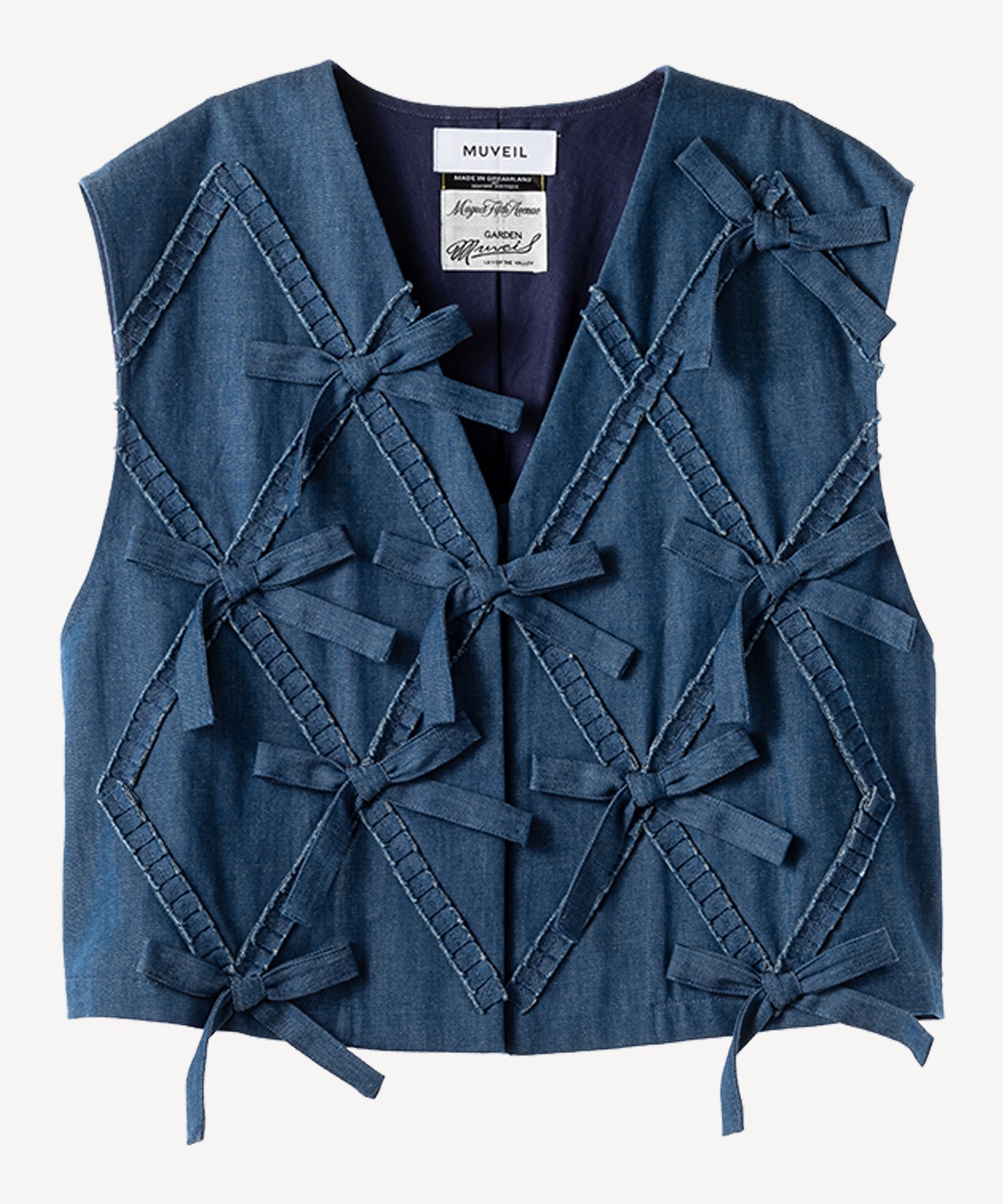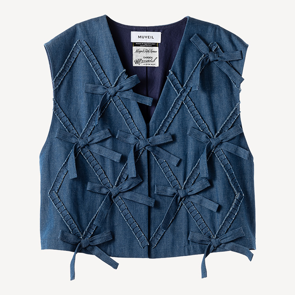 입체감 있는 아가일 패턴에 리본 디테일로 유니크한 데님 베스트