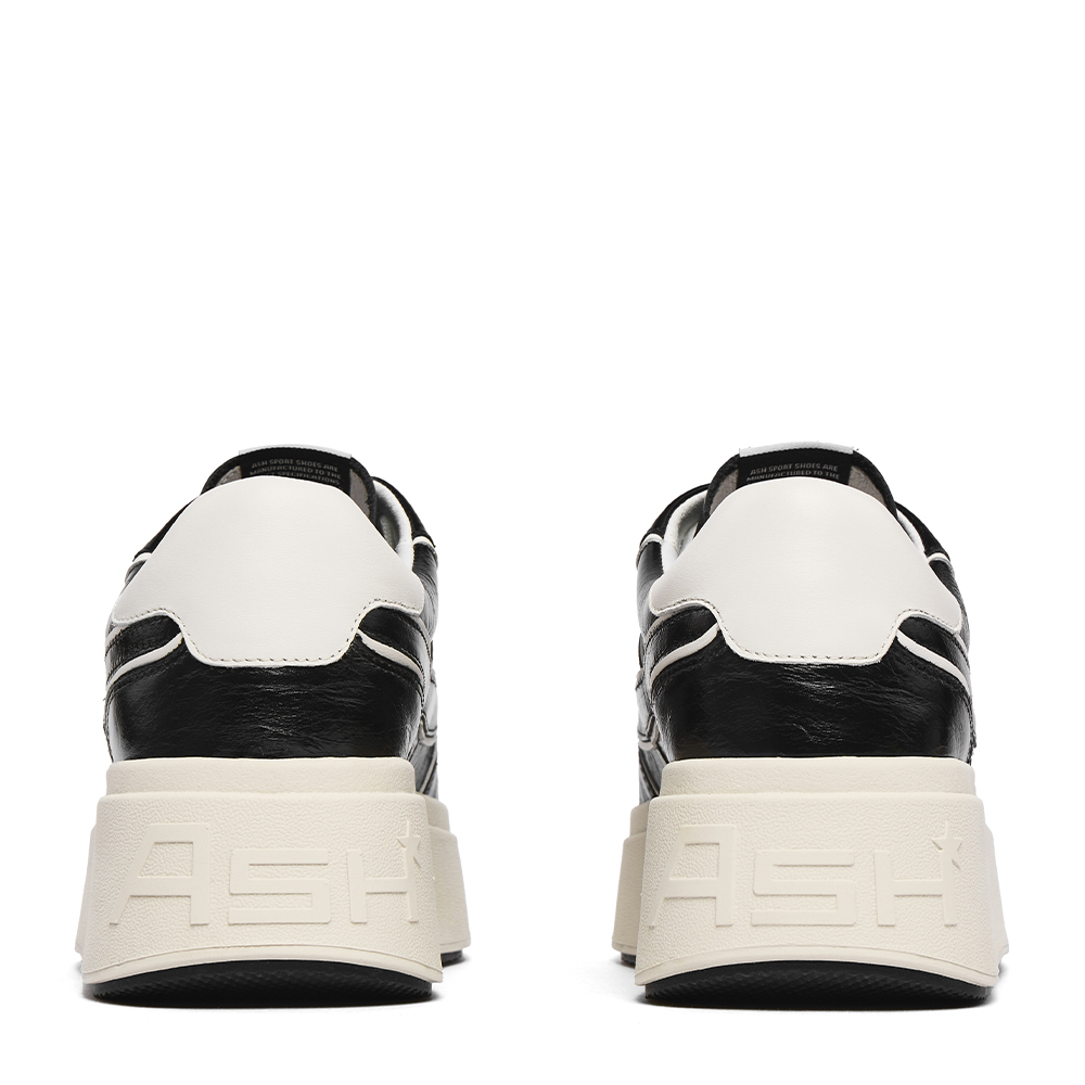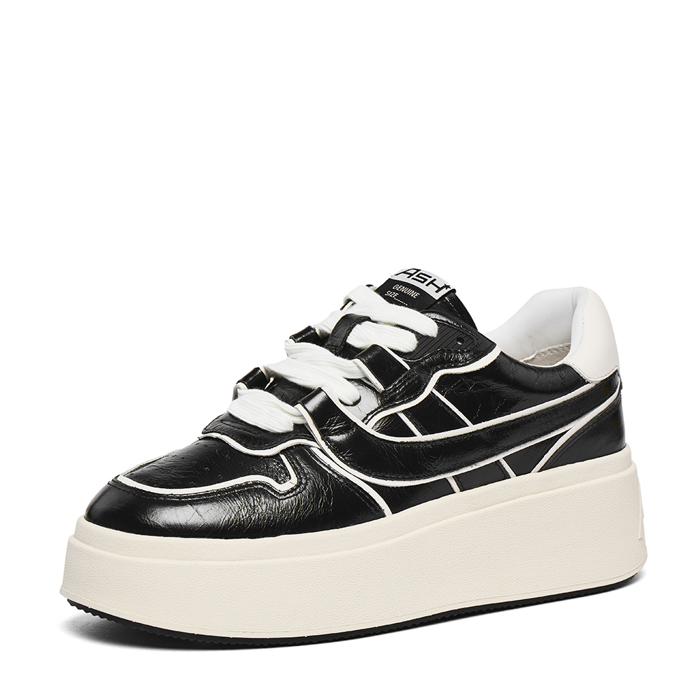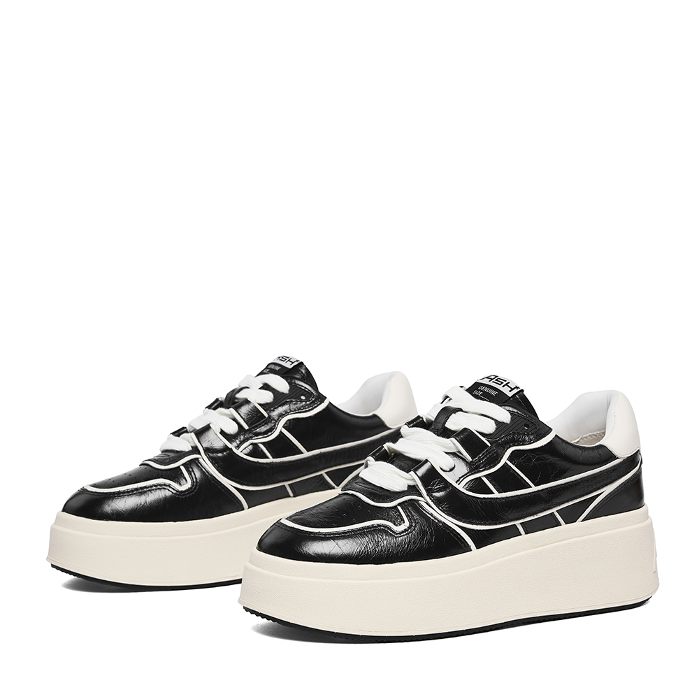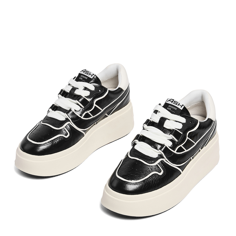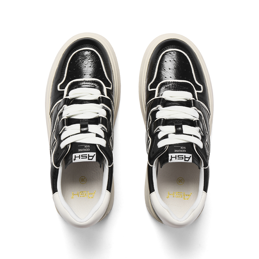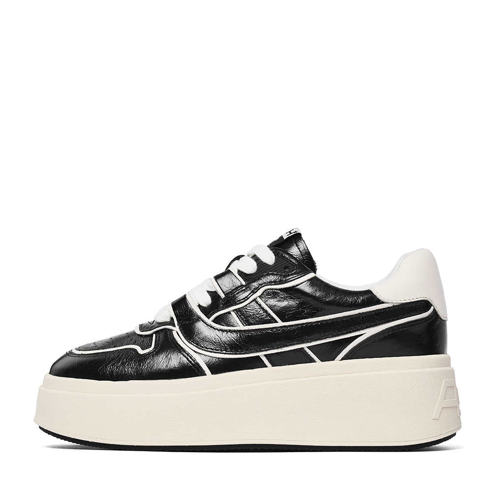 - 고급스러운 광의 카본 글로시 소재에 블랙 & 화이트 배색이 매력적인 레더 플랫폼 스니커즈