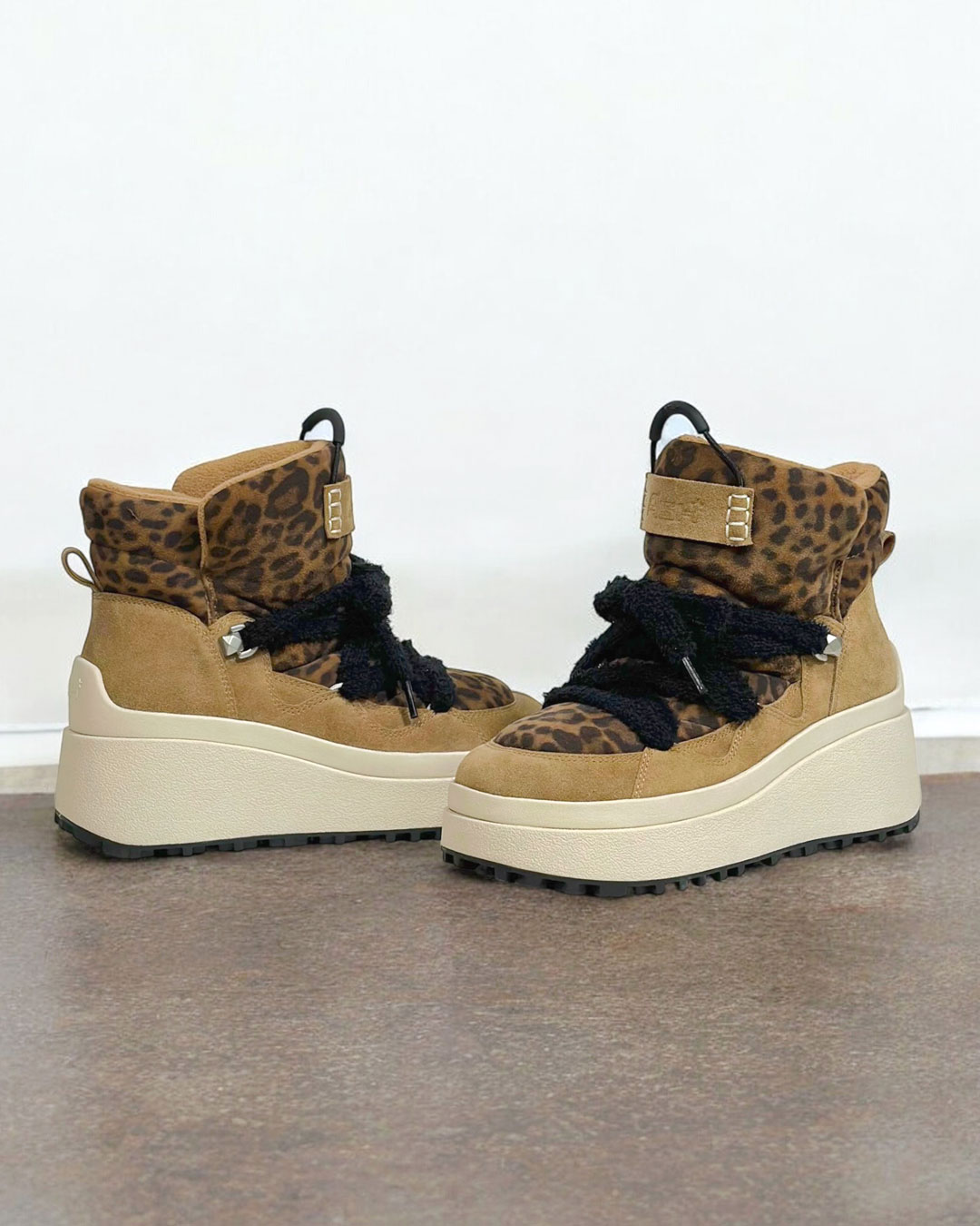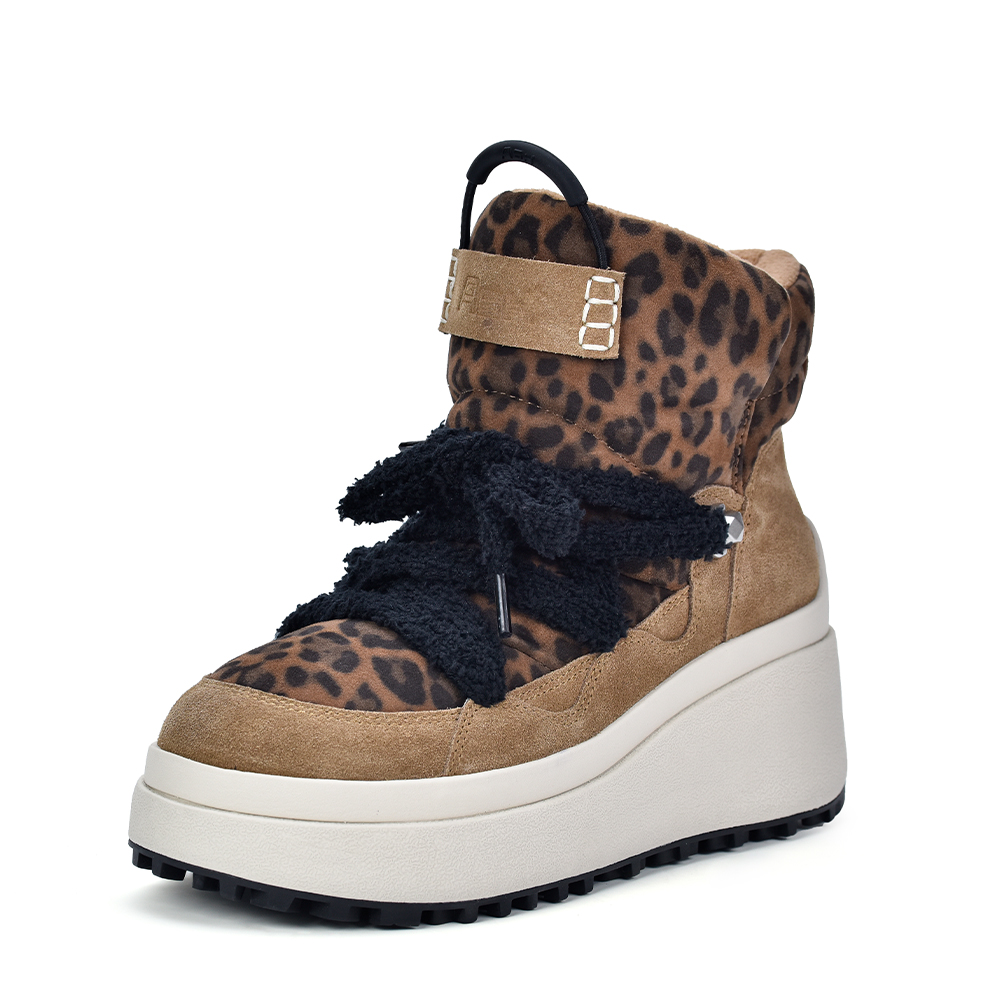 - 레오파드 패턴과 스웨이드 패널을 믹스한 하이탑 플랫폼 부츠로, 지퍼없이 착화하는 풀온 부츠 제품