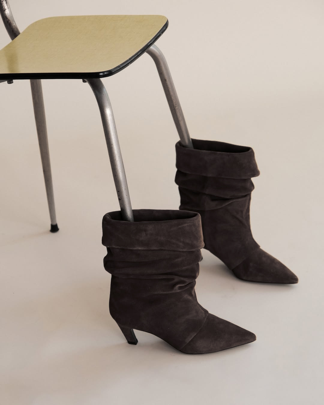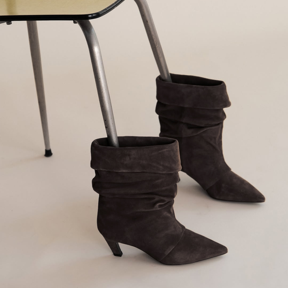 - 고급스러운 스웨이드 벨루어 소재와 감각적인 주름 디테일이 만나 스타일리시한 무드를 연출하는 미들 부츠