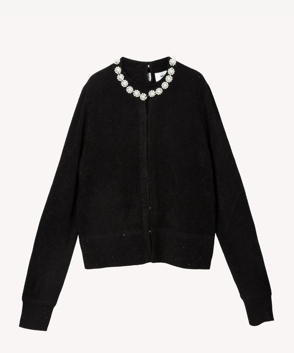반소매 풀오버와 가디건 구성의 트윈 니트. 작은 스팽글이 달린 니트가 글로시하고, 가디건 넥라인의 진주 장식이 여성스러운 제품