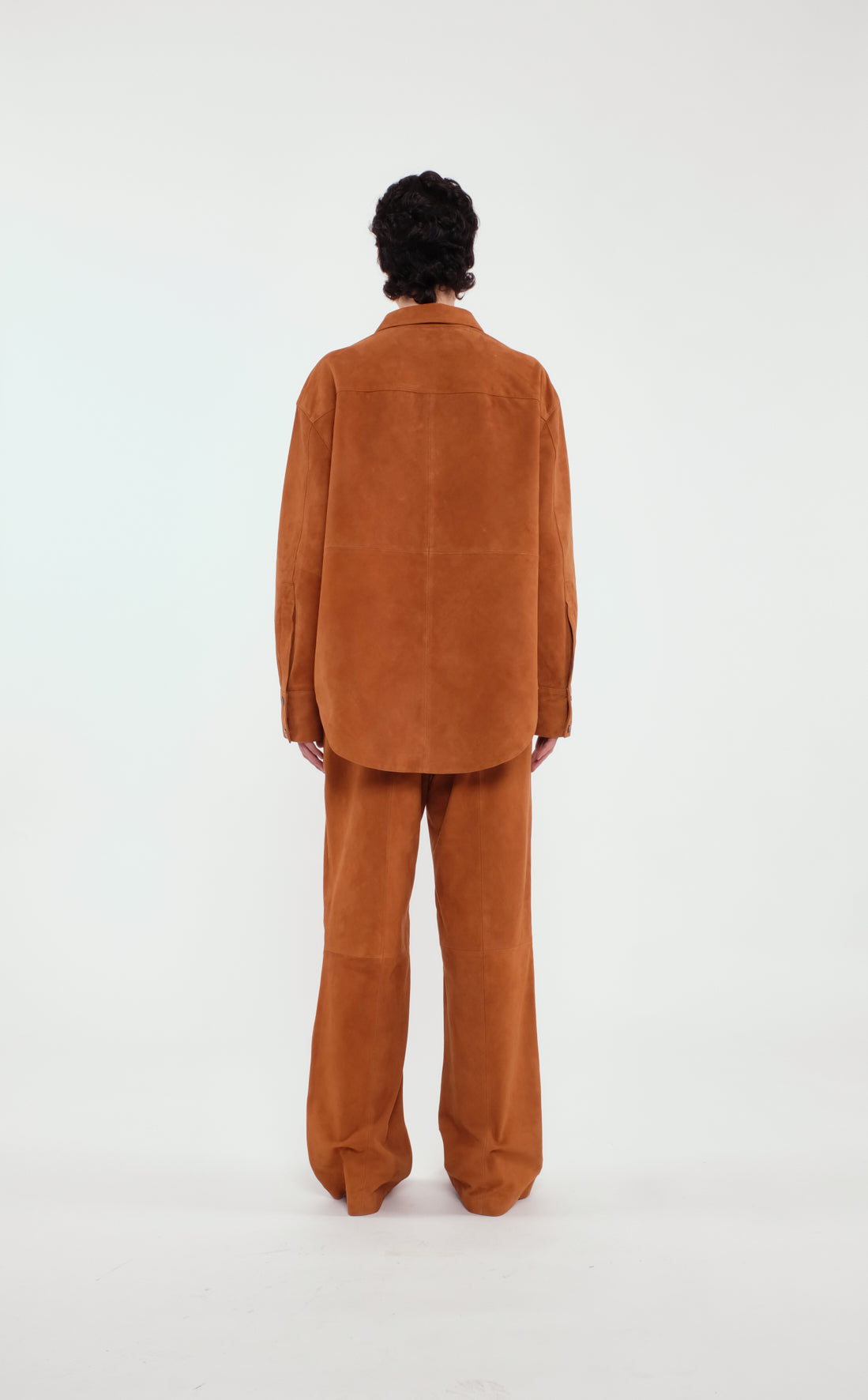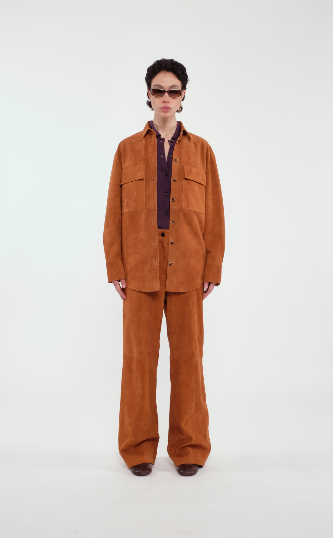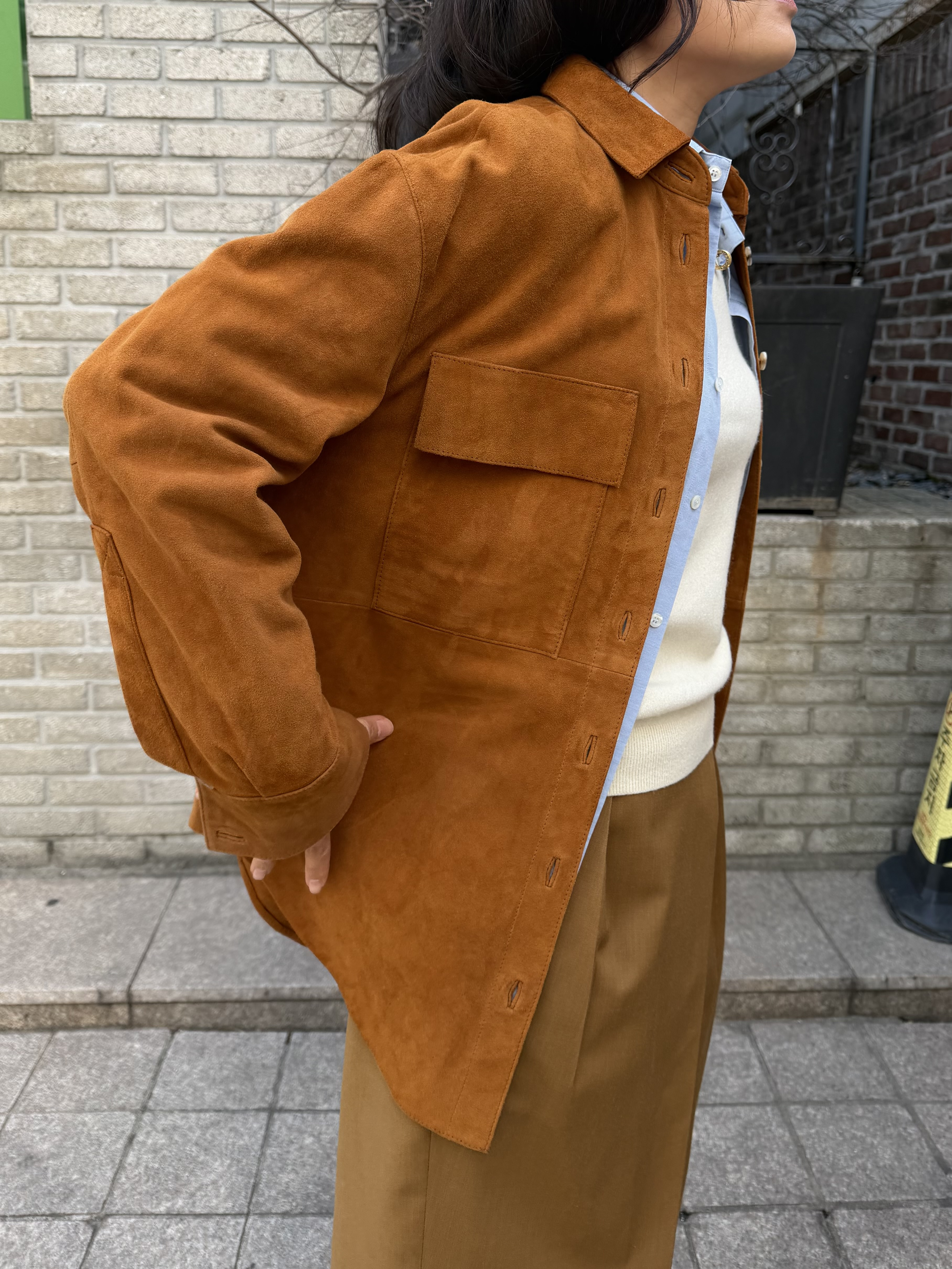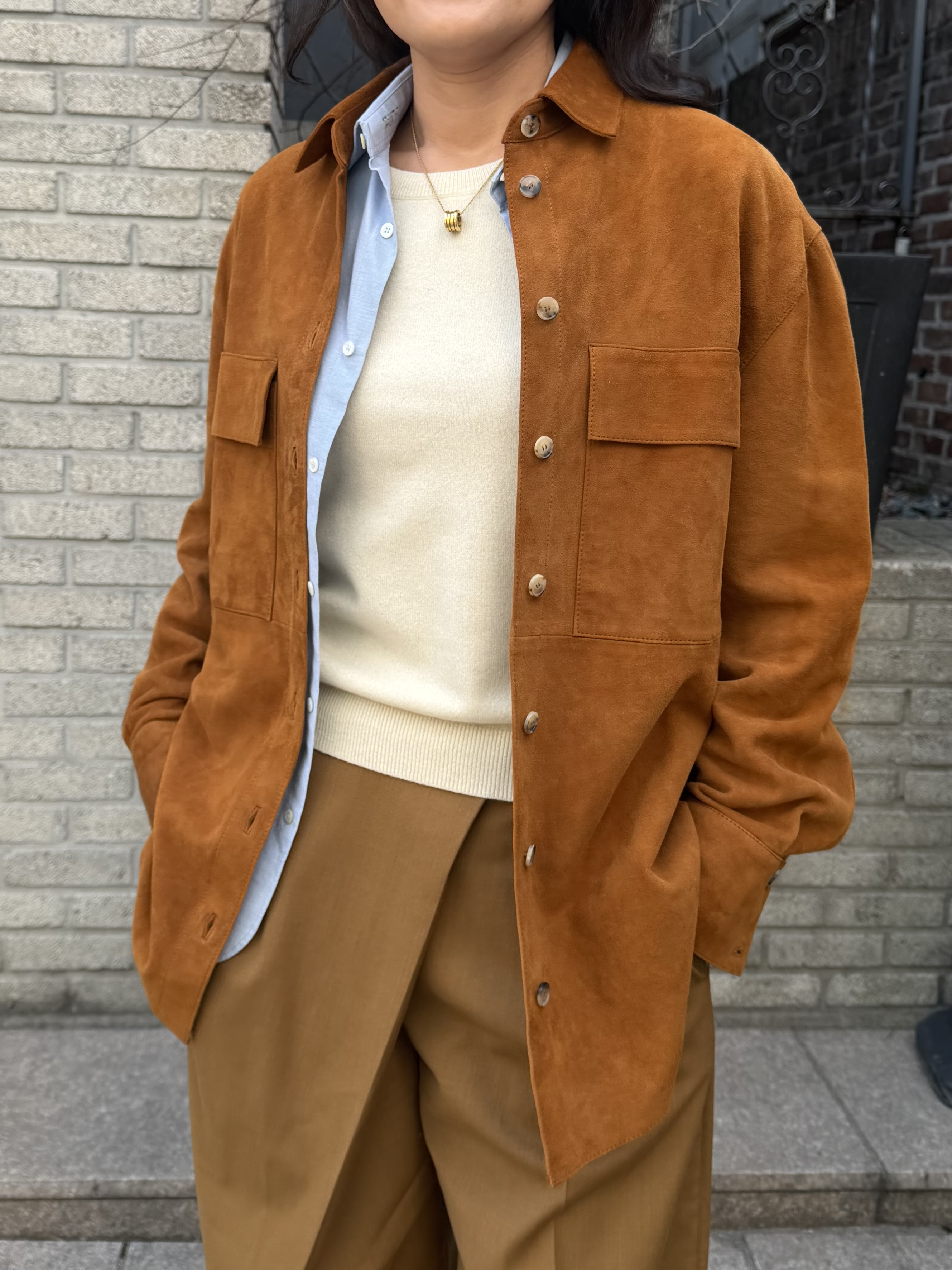 빅 플랩 포켓 포인트의 오버핏 스웨이드 셔츠 자켓. 버튼다운 클로저와 플랩 빅포켓의 클래식한 디테일에 부드러운 텍스처와 웜한 카멜 컬러로 캐주얼하면서도 빈티지한 감성이 더해진 제품