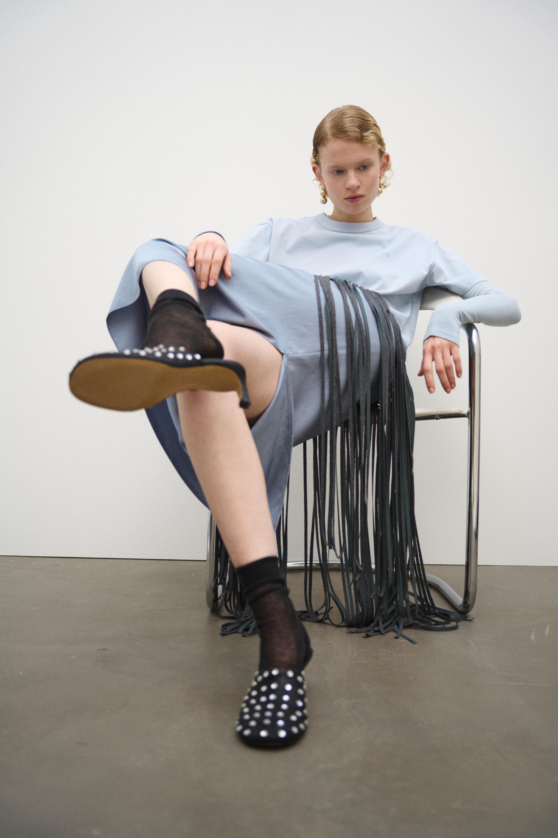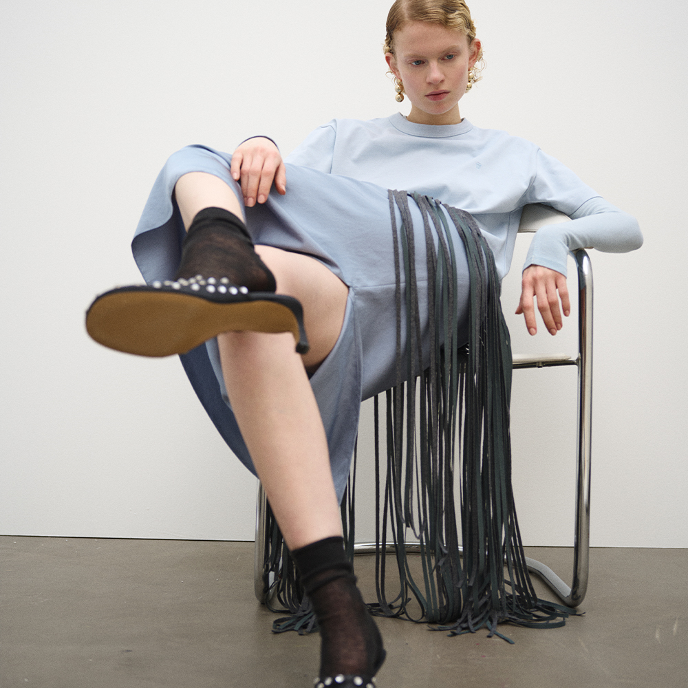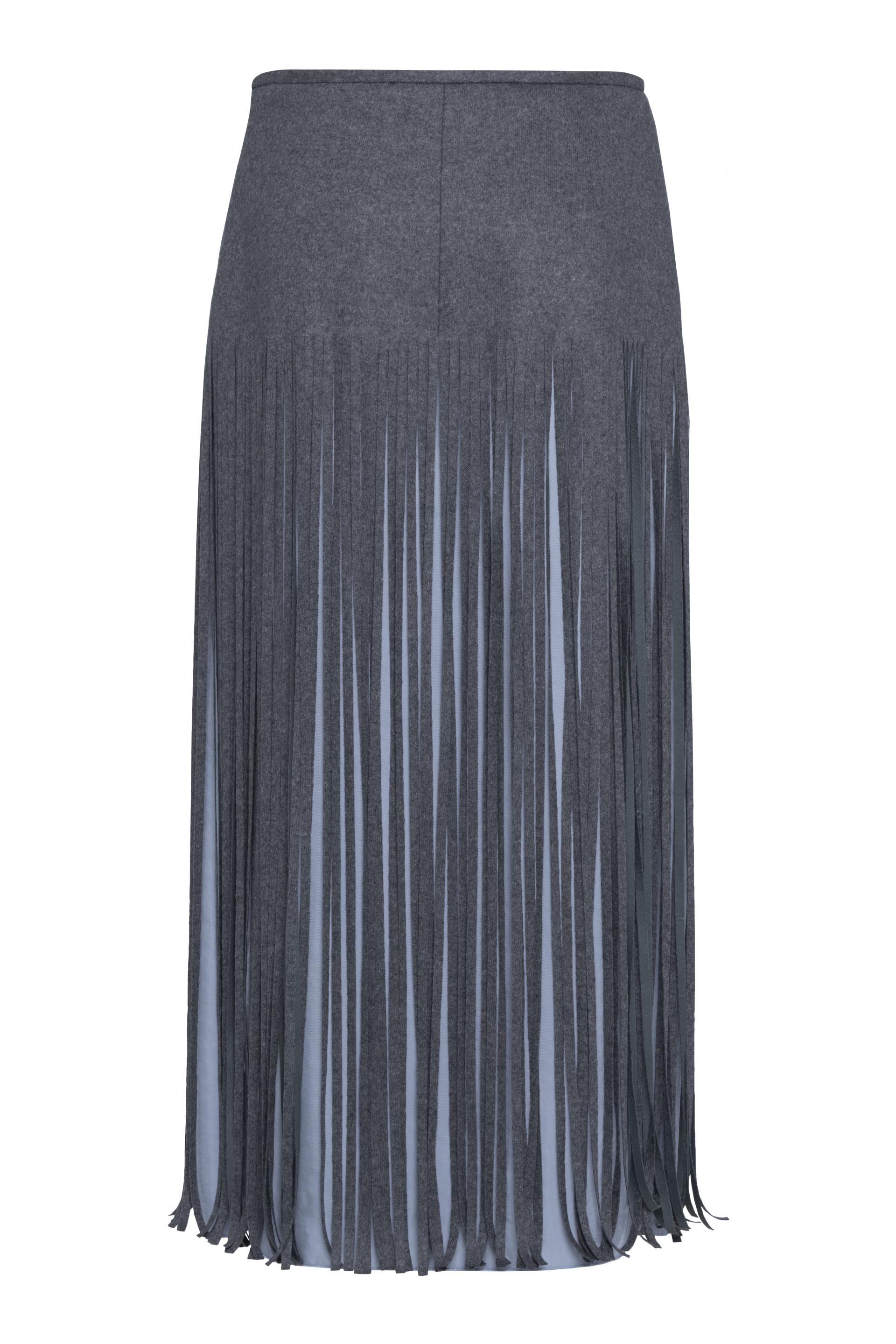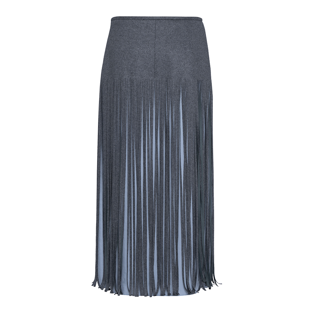 배색 안감 콤비가 유니크한 프린지 미디 스커트