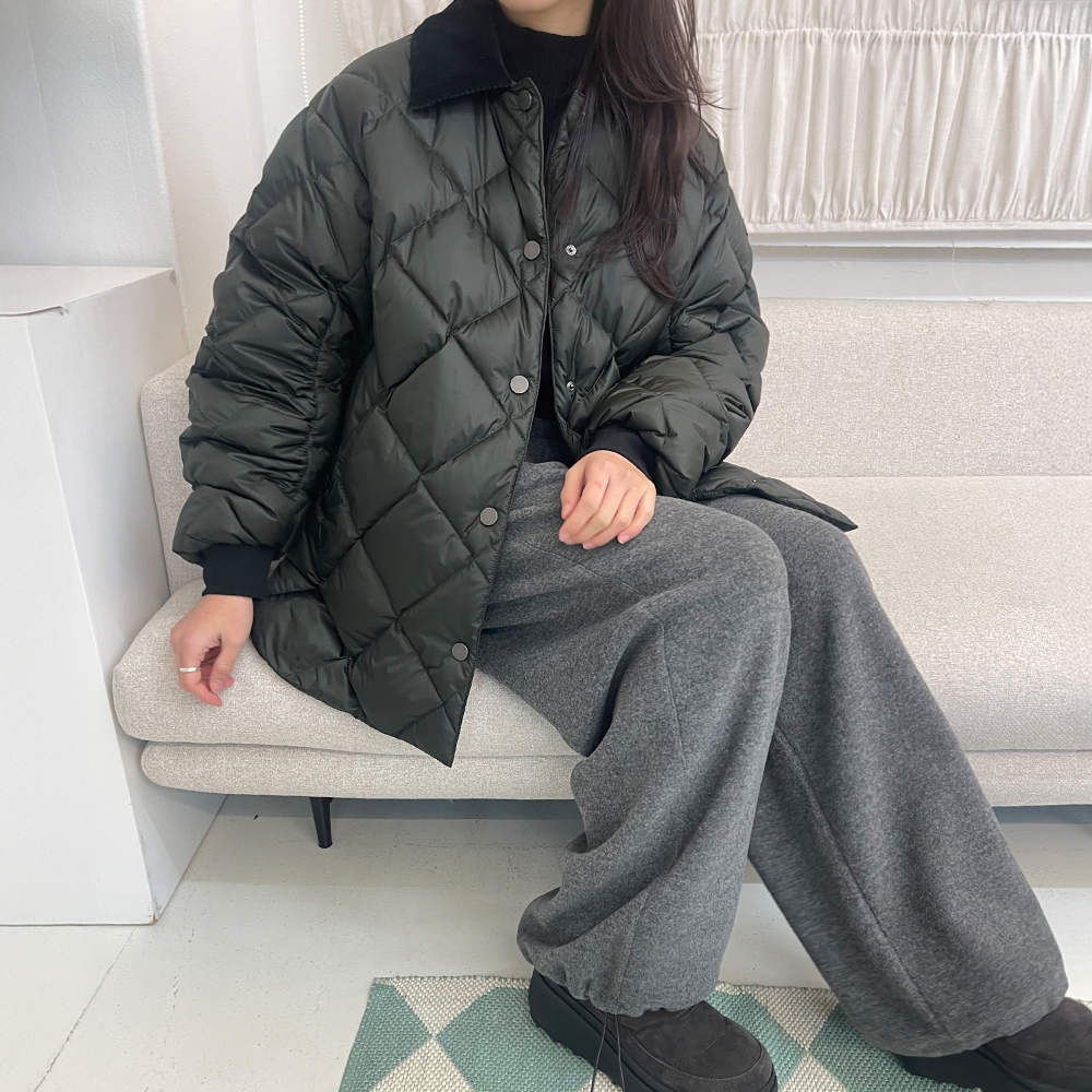 이탈리아산 실키 나일론으로 만든 라이트 다운 재킷. 솜털과 깃털 90/10 비율의 RDS 인증 덕다운을 사용해 가볍고 따뜻하며, 발수 가공으로 일상에서도 실용적으로 입을 수 있는 재킷 은은하게 퍼지는 플레어 실루엣과 드롭 숄더 라인이 자연스러운 볼륨감을 연출하고, 소매 핀턱 디테일과 코듀로이 칼라, 니트 커프스가 포근한 무드를 더해주는 제품