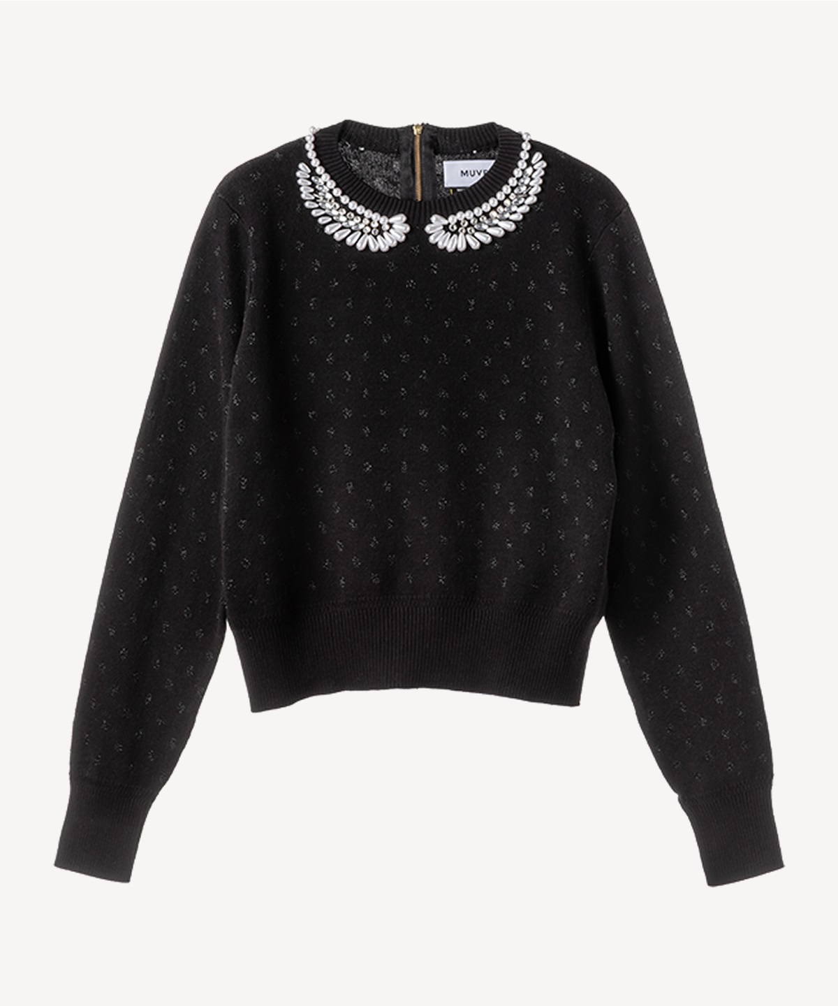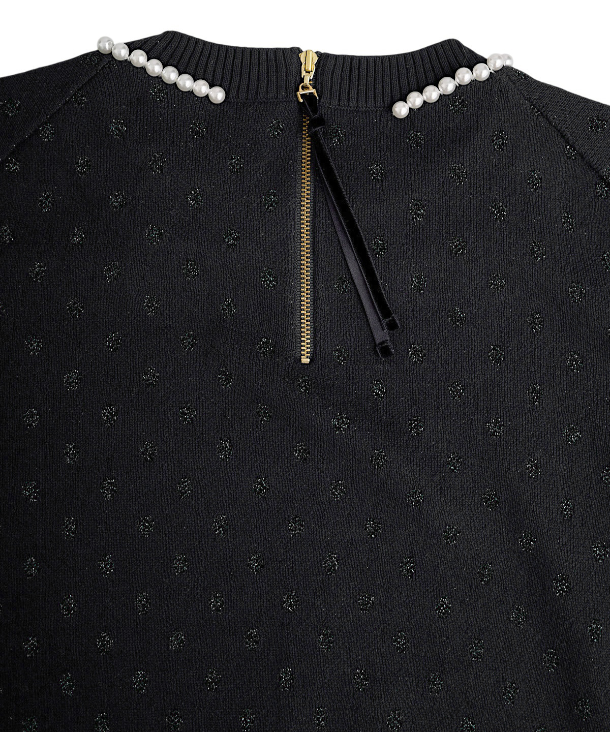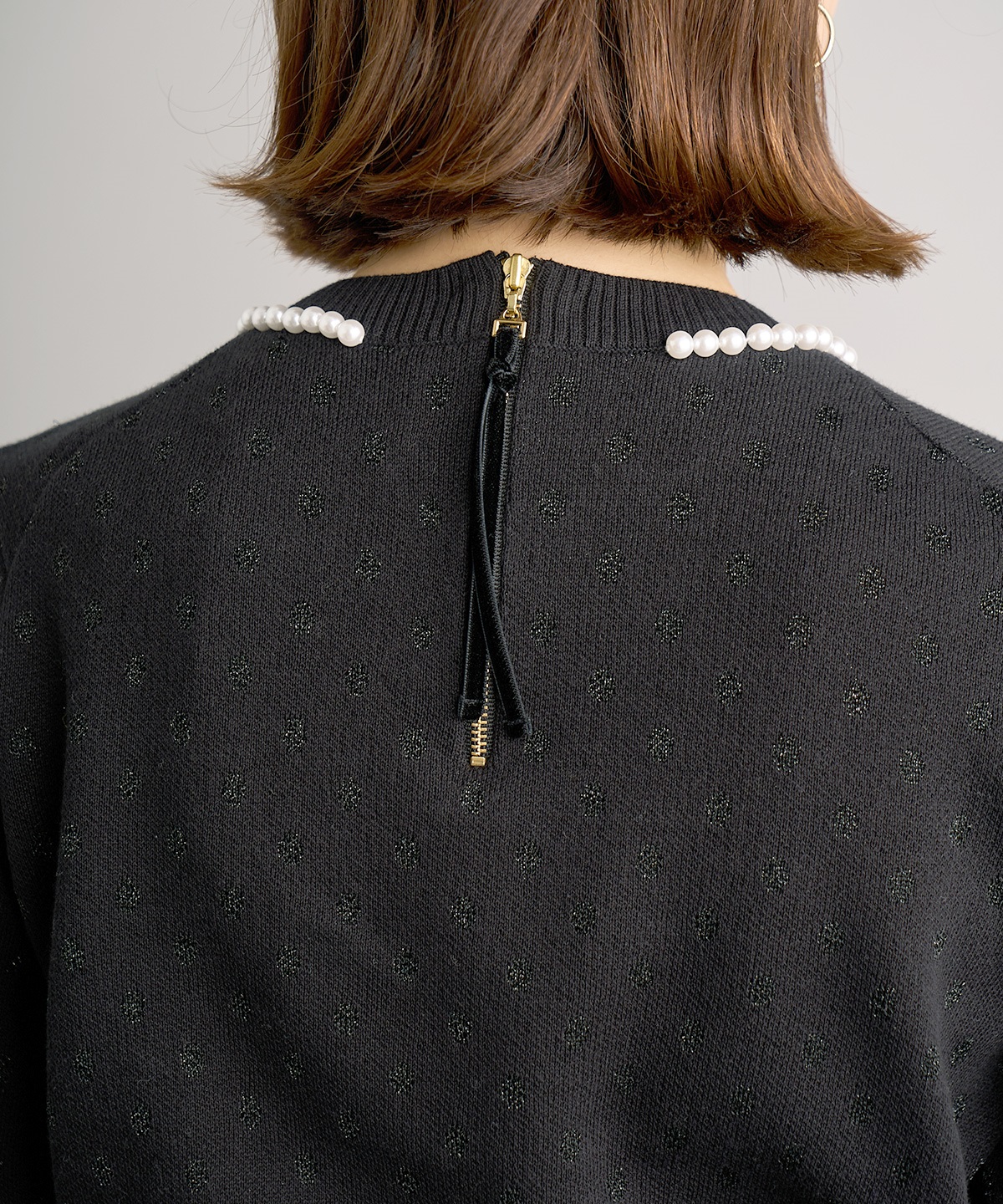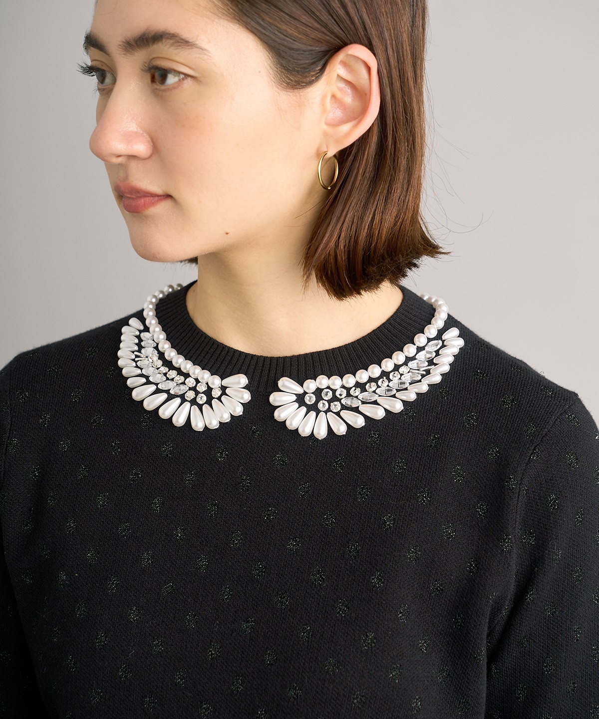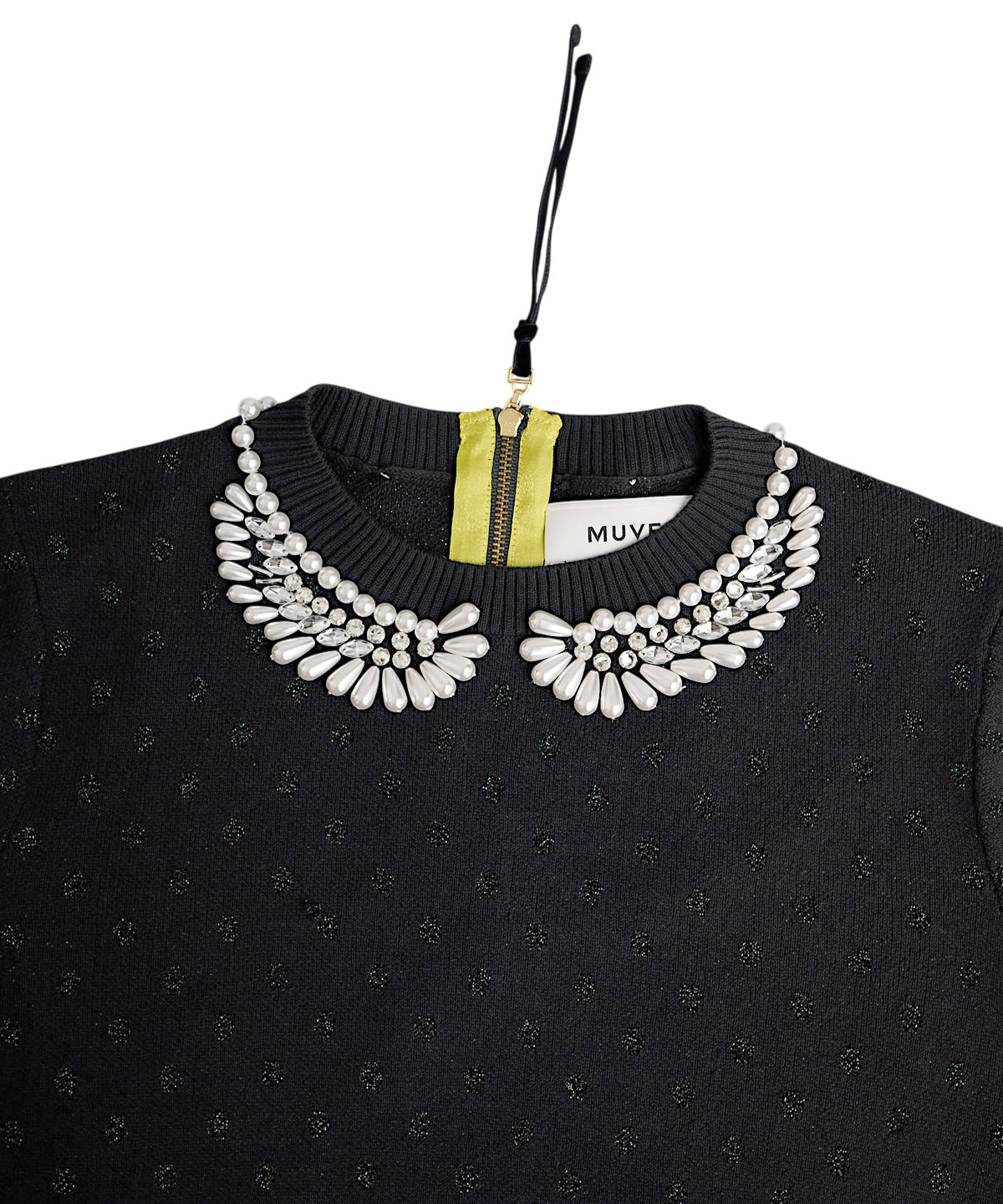 글리터 도트 프린트와 진주와 비즈 콤비의 칼라가 포인트가 되는 니트.