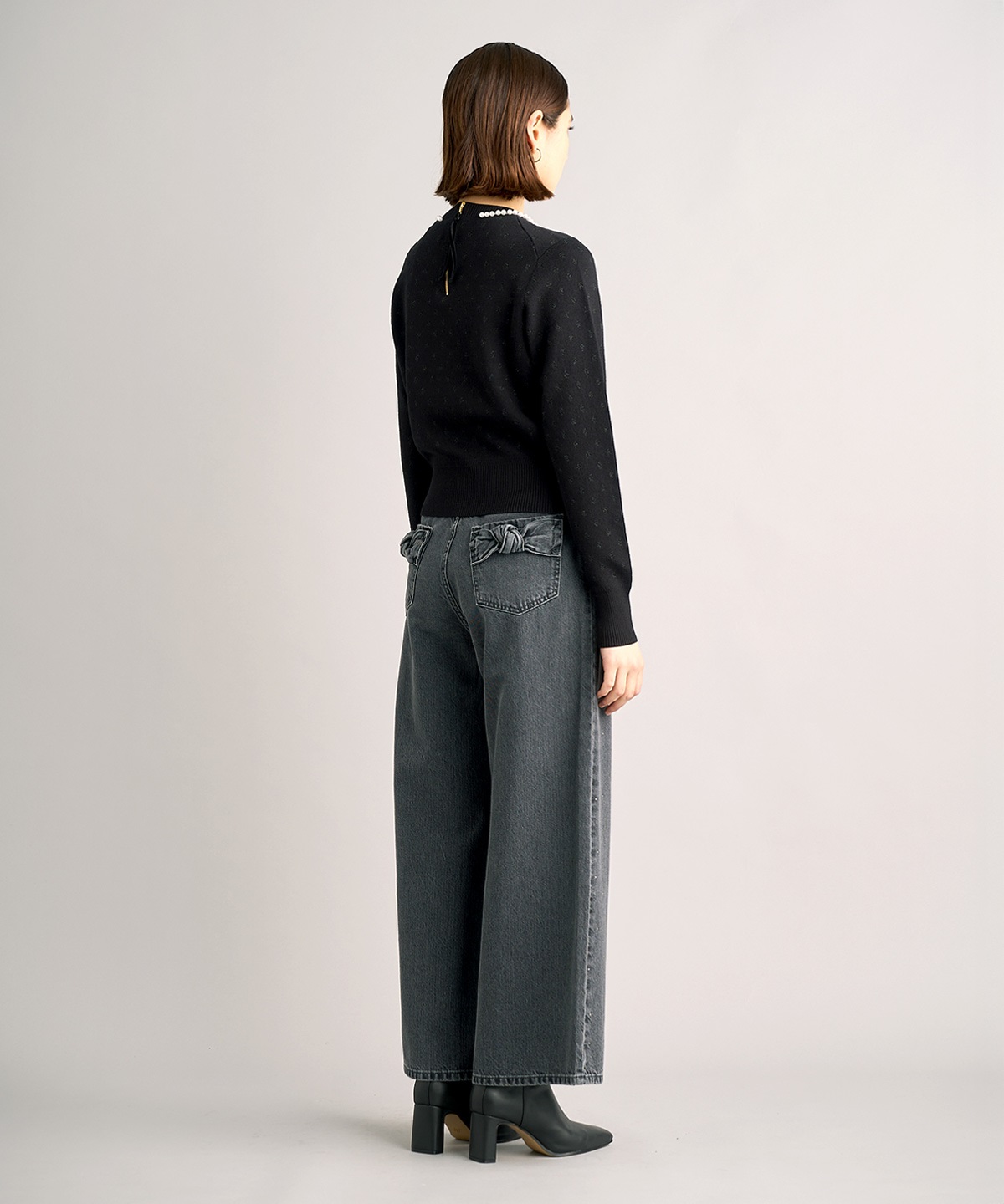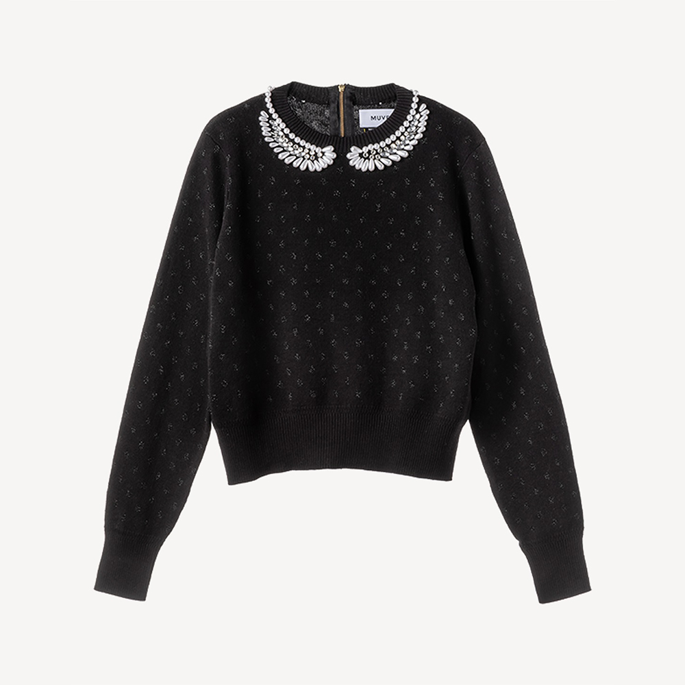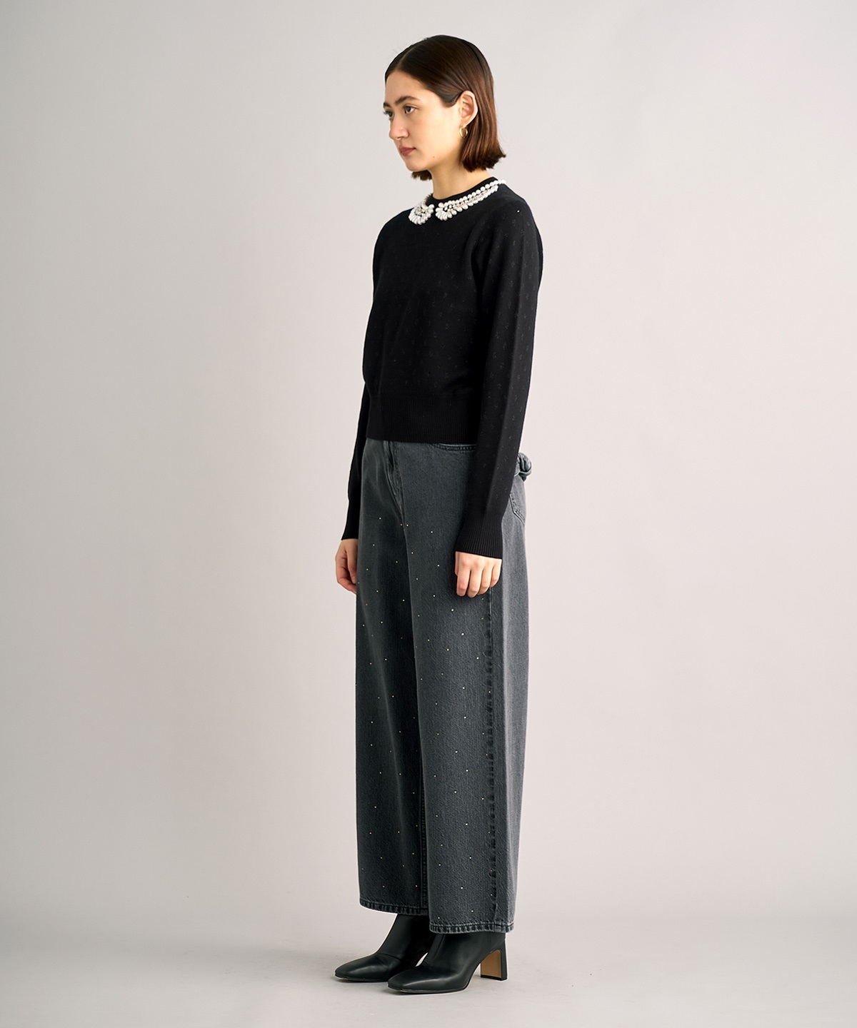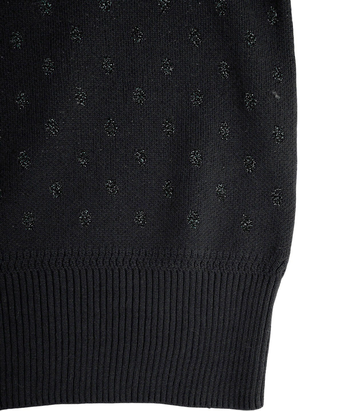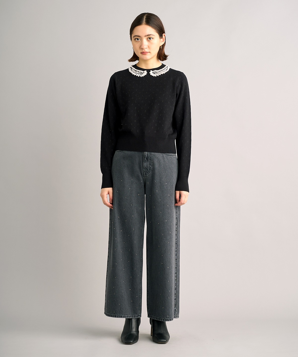 글리터 도트 프린트와 진주와 비즈 콤비의 칼라가 포인트가 되는 니트.