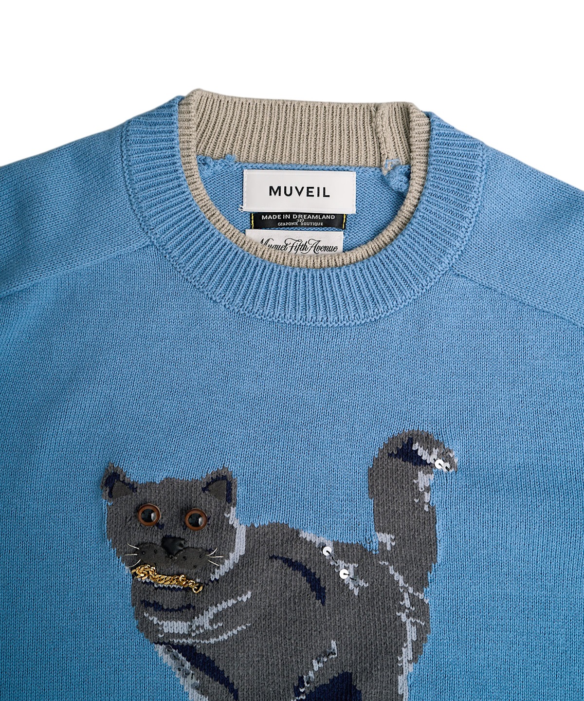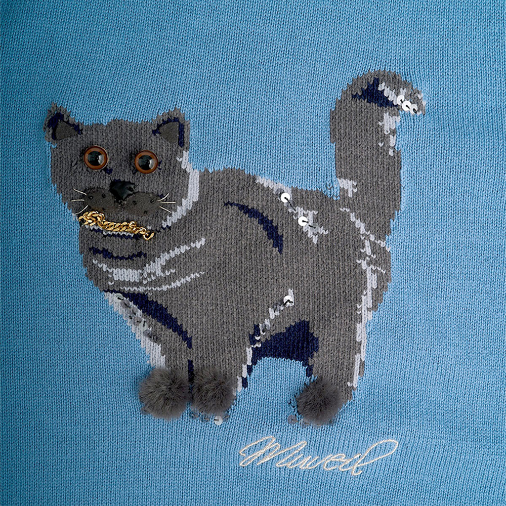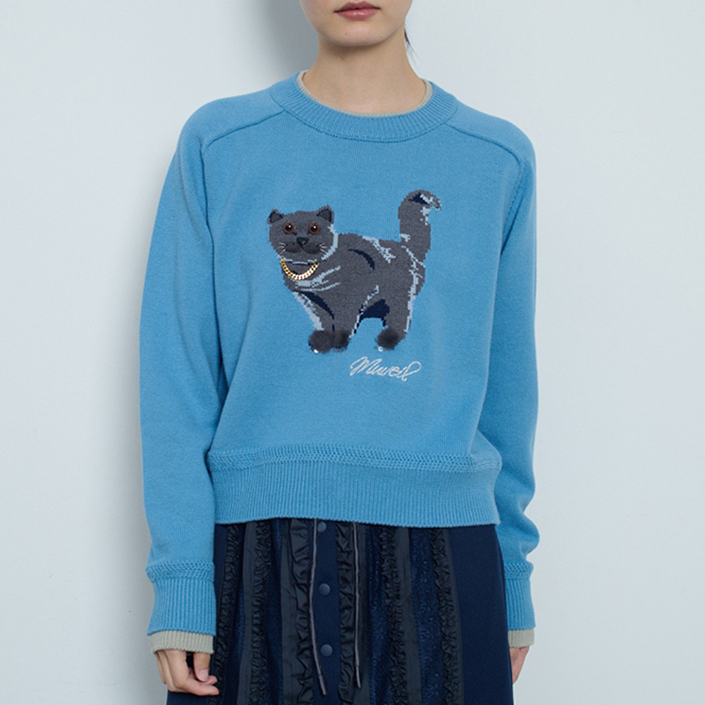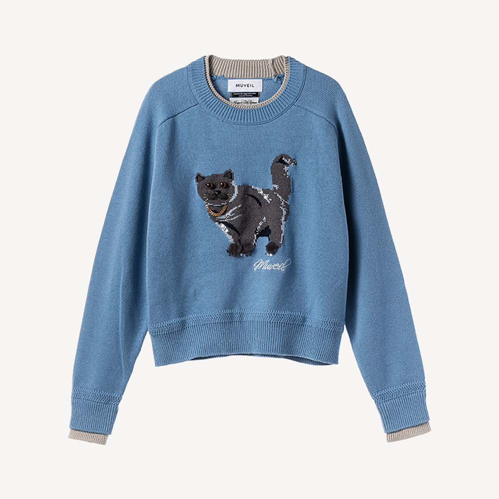 고양이 프린트의 인타르시아 니트 풀오버. 발과 입가 부분의 아플리케 자수로 입체감을 살리고, 카라와 소매에 레이어드 효과의 포인트가 독특한 니트