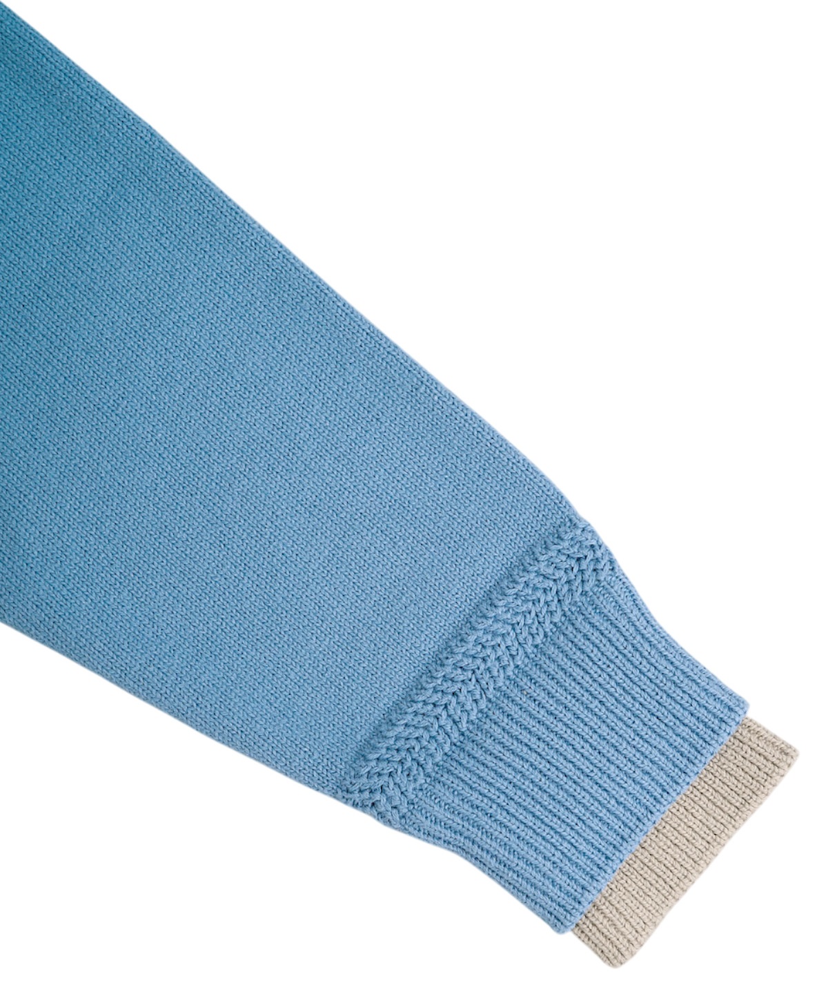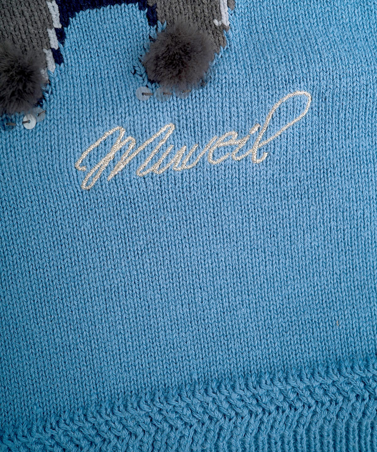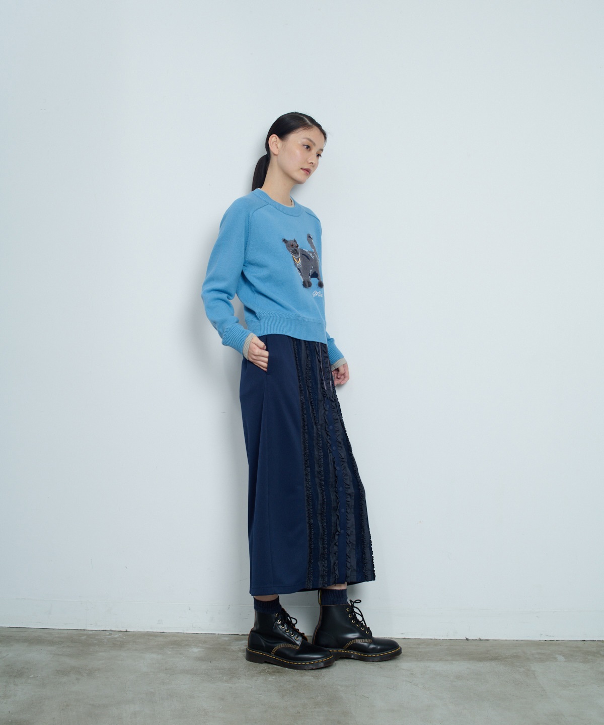 고양이 프린트의 인타르시아 니트 풀오버. 발과 입가 부분의 아플리케 자수로 입체감을 살리고, 카라와 소매에 레이어드 효과의 포인트가 독특한 니트