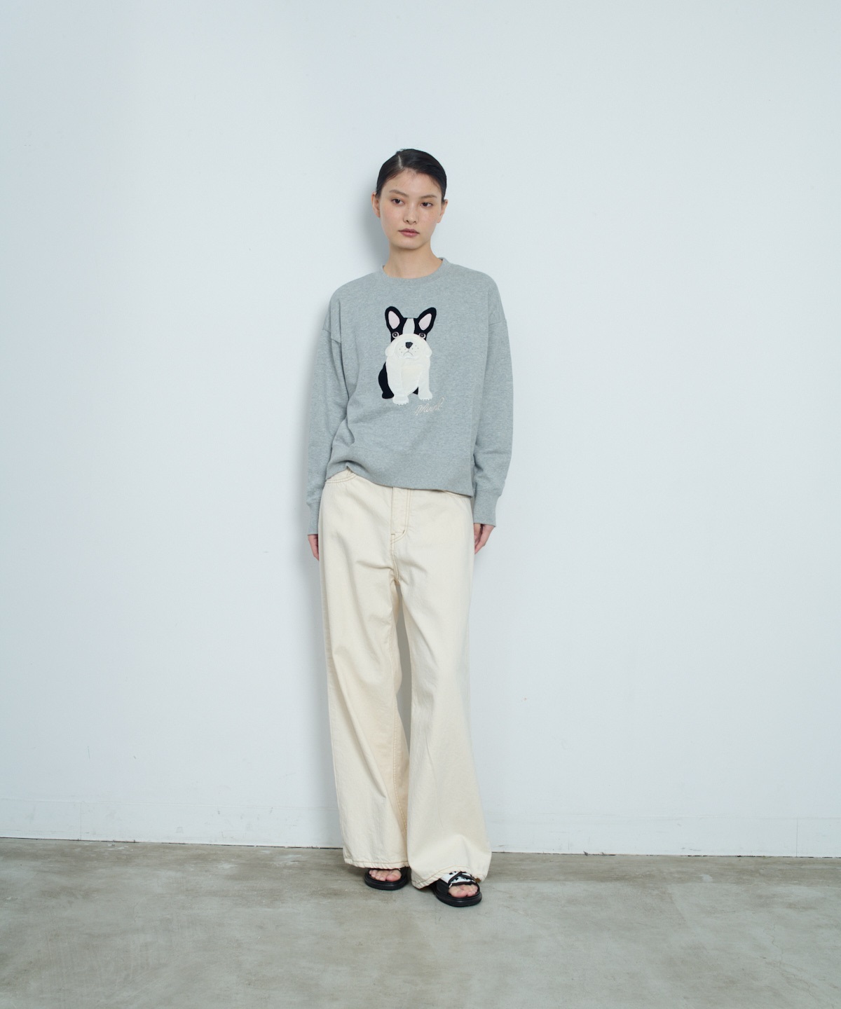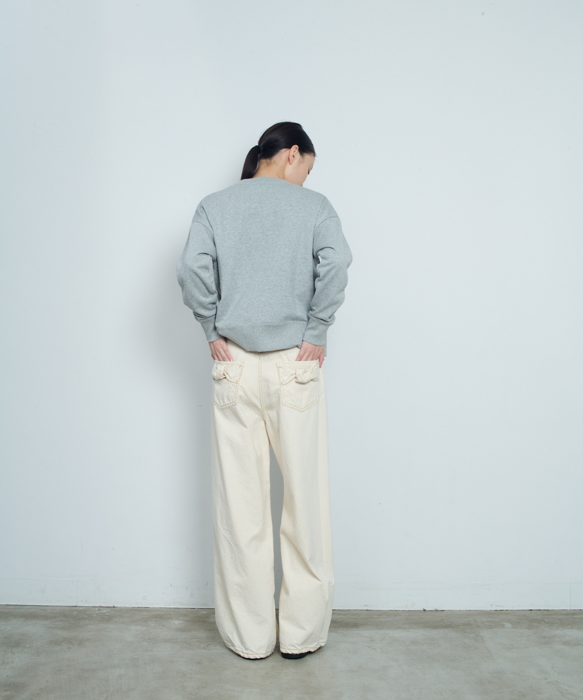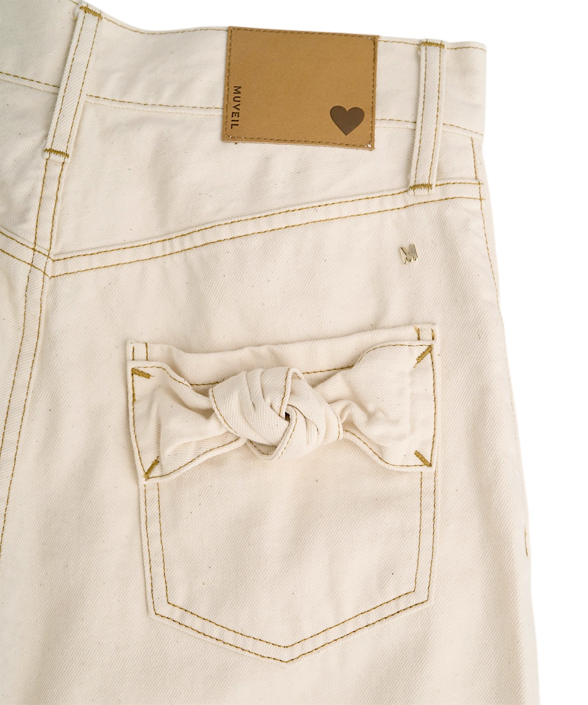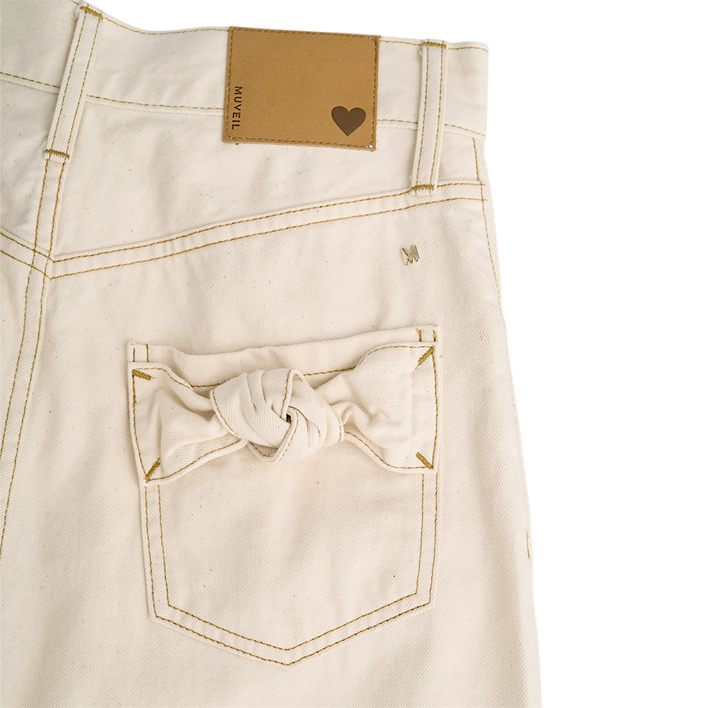 원 워시드 데님 팬츠. 와이드 레그에 10온스 데님 소재로 보온성을 살렸으며, 뒷 포켓에 리본매듭 디테일이 힙라인을 예쁘게 보이게 하는 제품