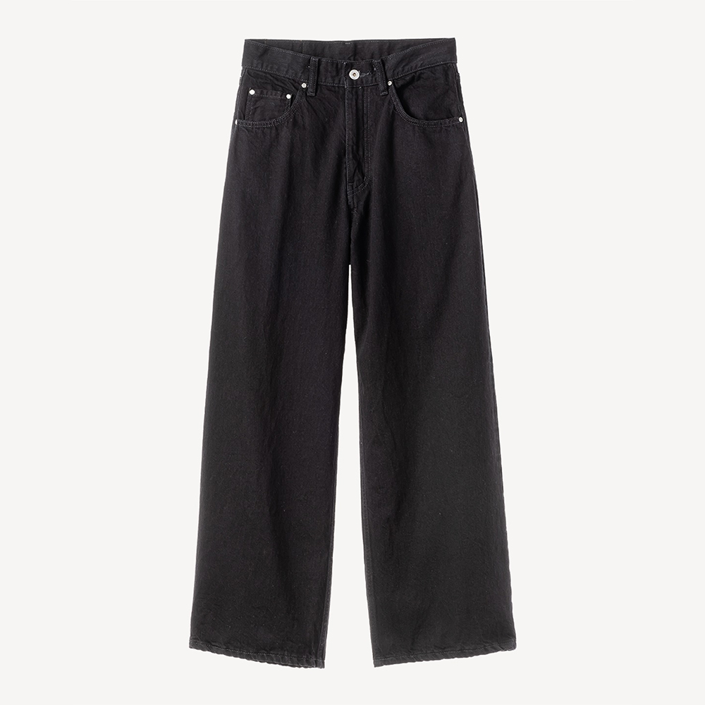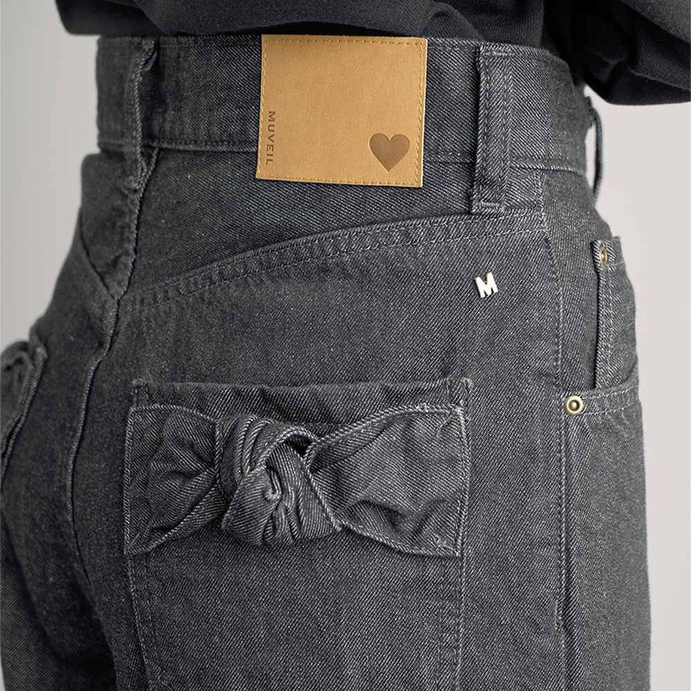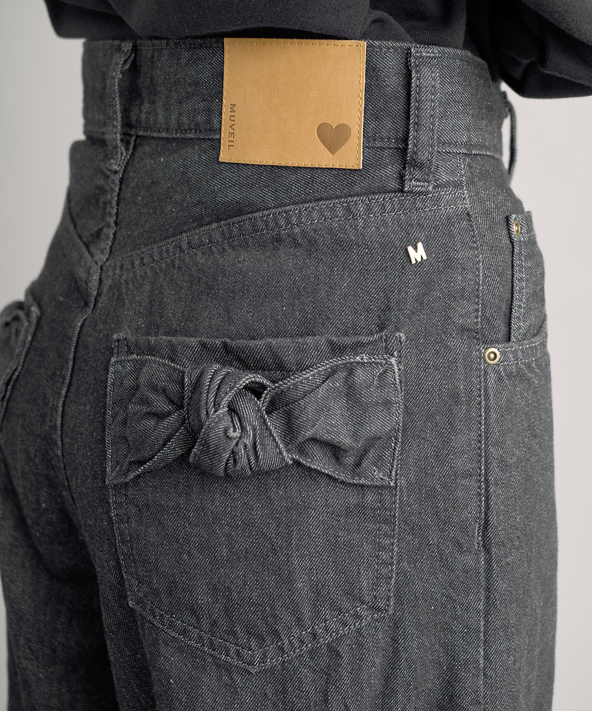 원 워시드 데님 팬츠. 와이드 레그에 10온스 데님 소재로 보온성을 살렸으며, 뒷 포켓에 리본매듭 디테일이 힙라인을 예쁘게 보이게 하는 제품
