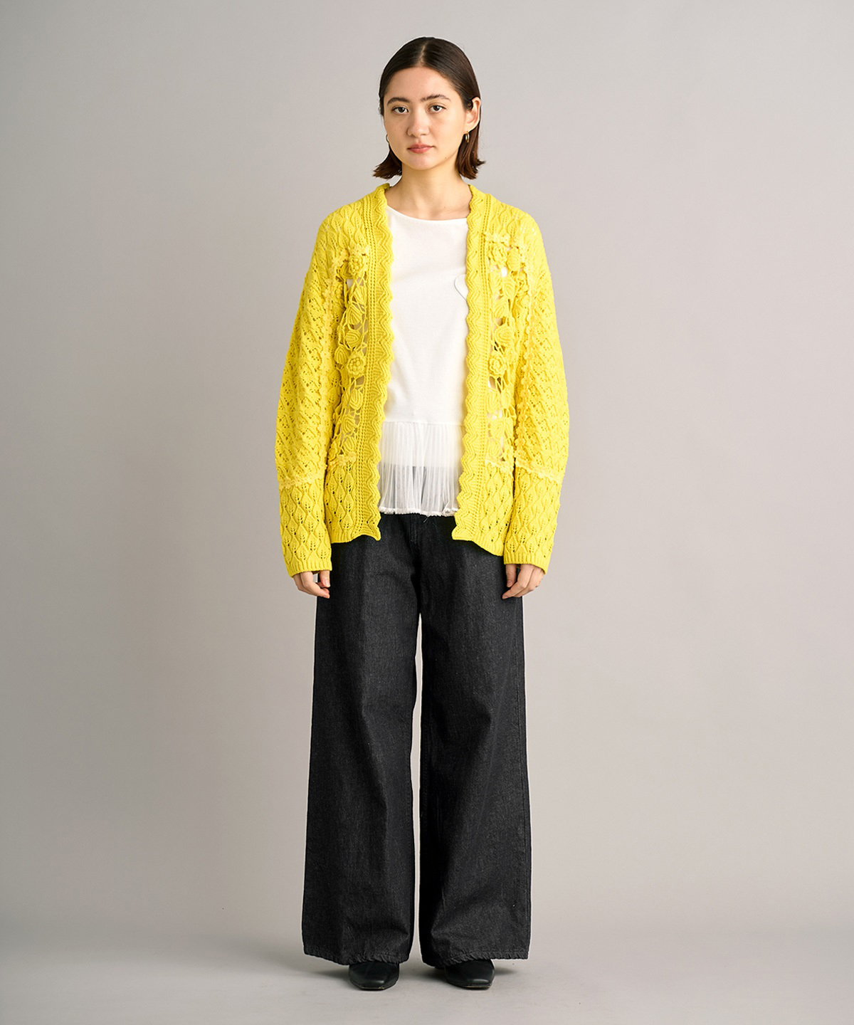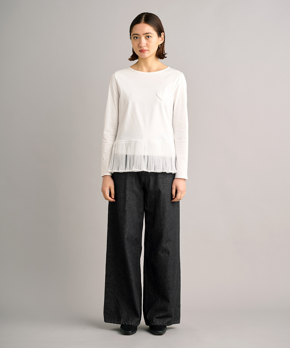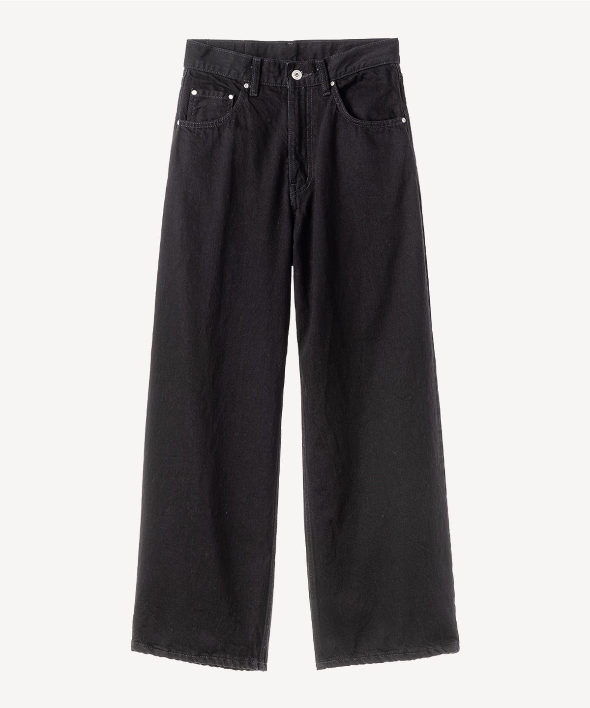 원 워시드 데님 팬츠. 와이드 레그에 10온스 데님 소재로 보온성을 살렸으며, 뒷 포켓에 리본매듭 디테일이 힙라인을 예쁘게 보이게 하는 제품