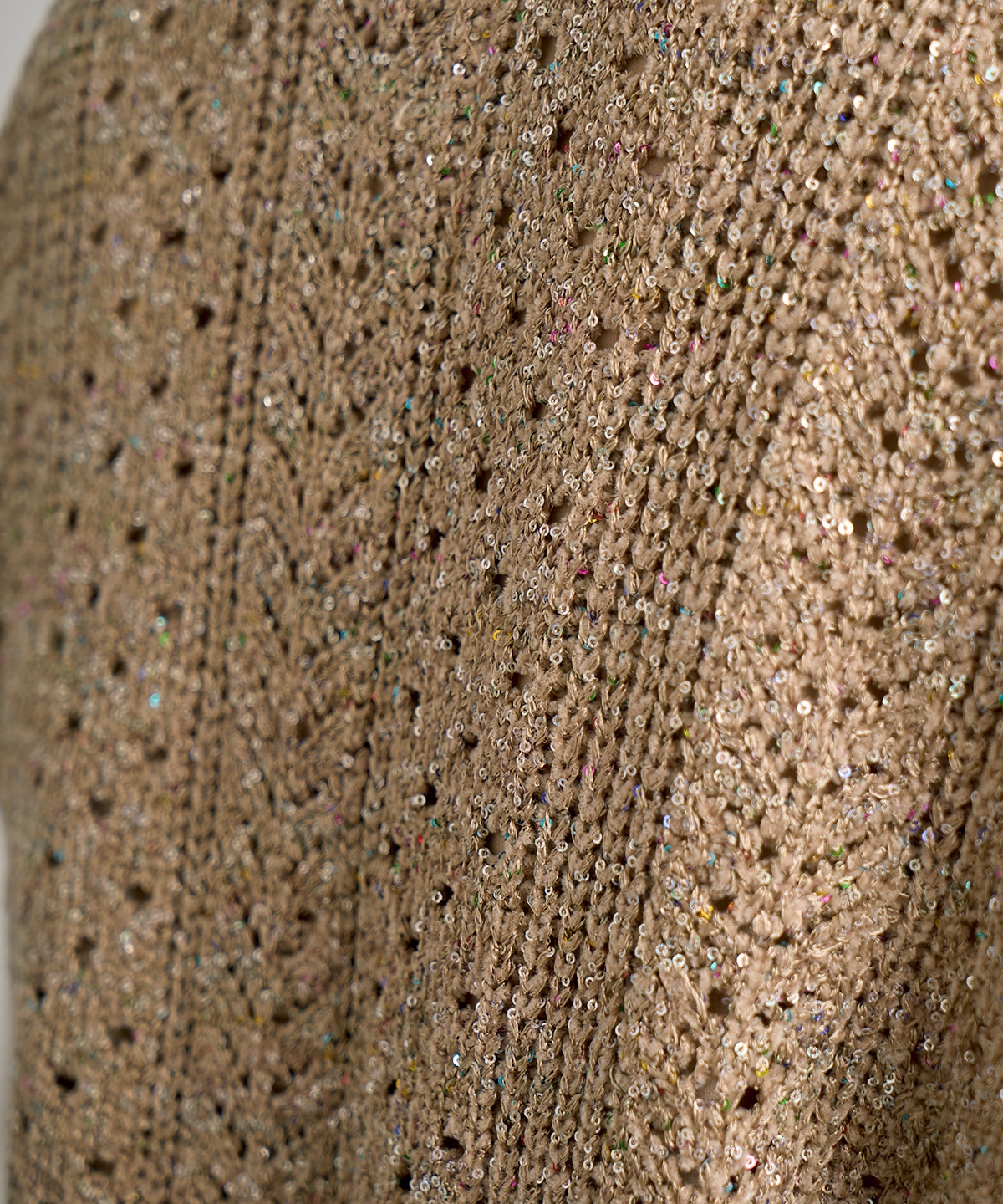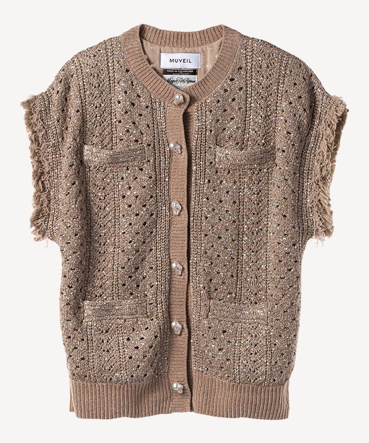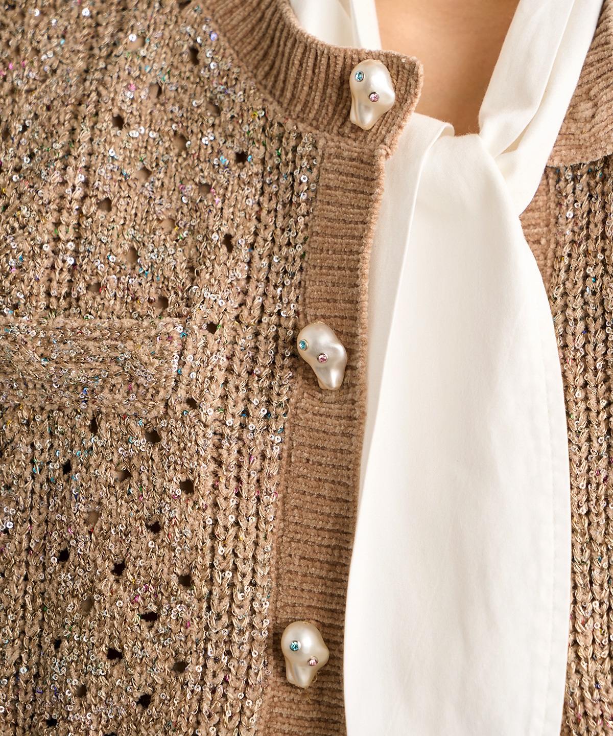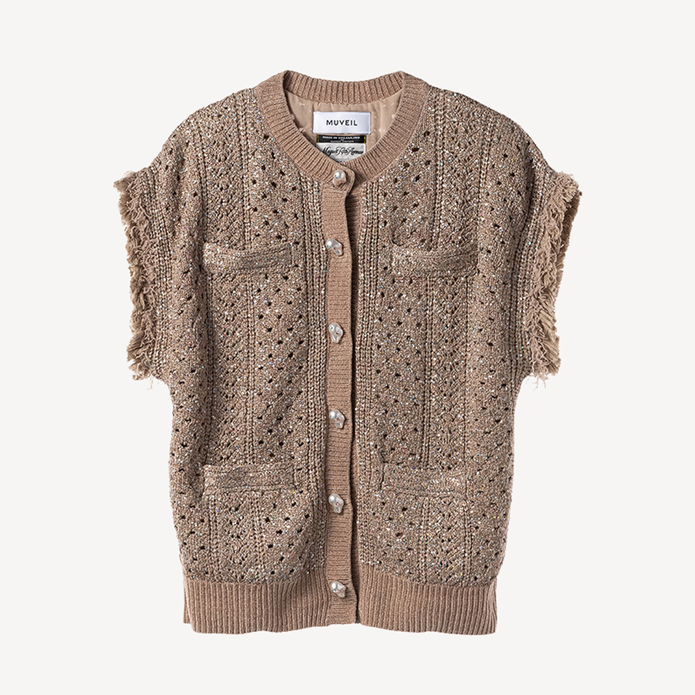 레이스 뜨개와 케이블 니트를 섞어 다채로운 느낌의 니트 질렛. 작은 스팽글로 반짝임을 더하고 프린지와 진주 모티프 단추로 화려함을 더한 제품