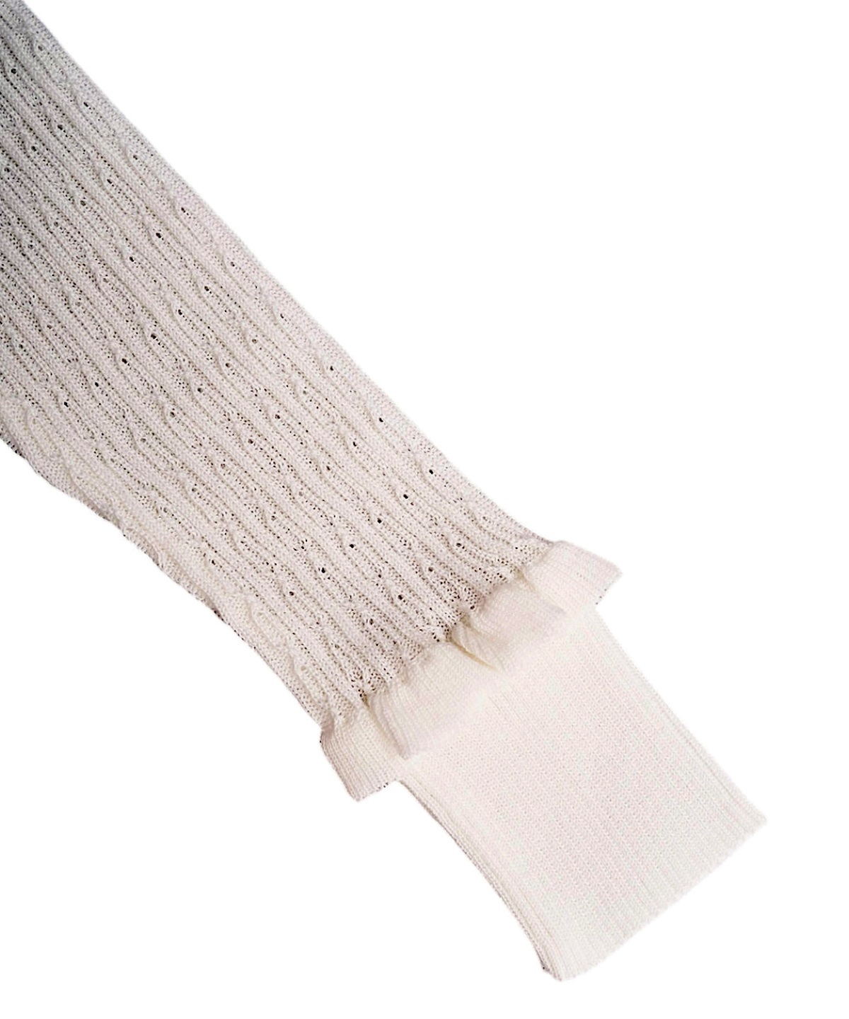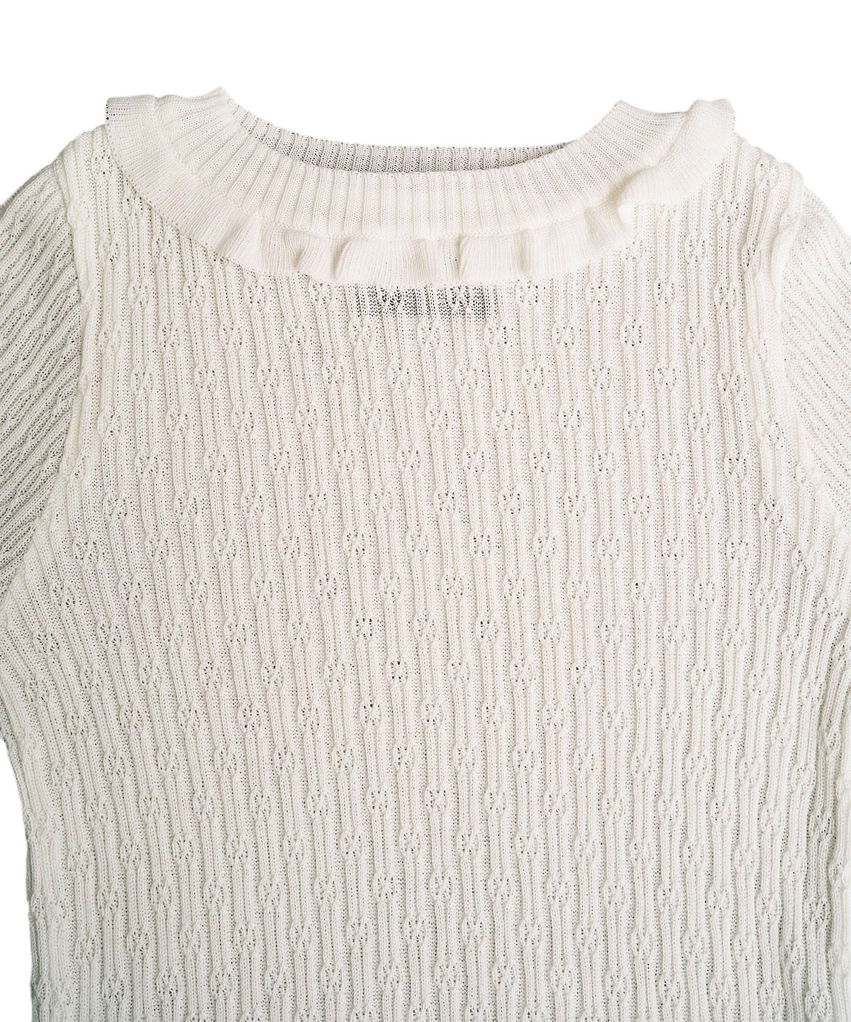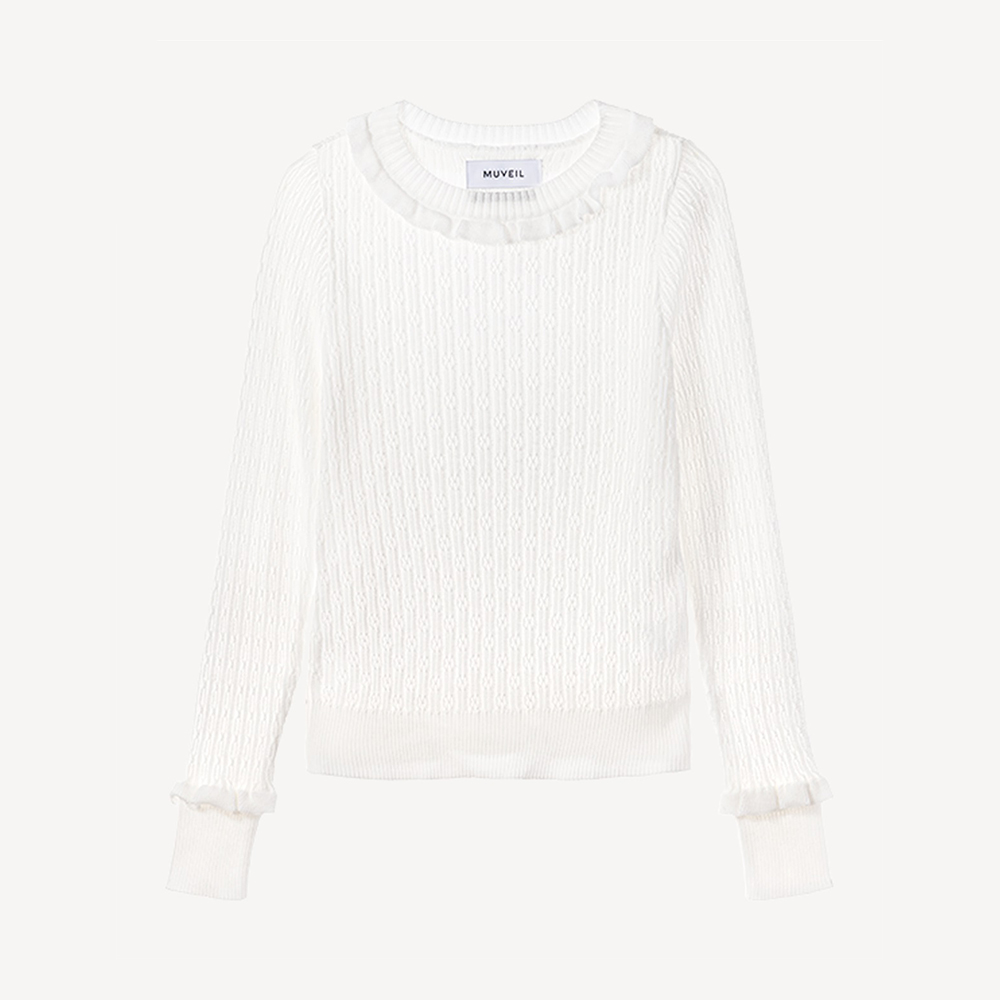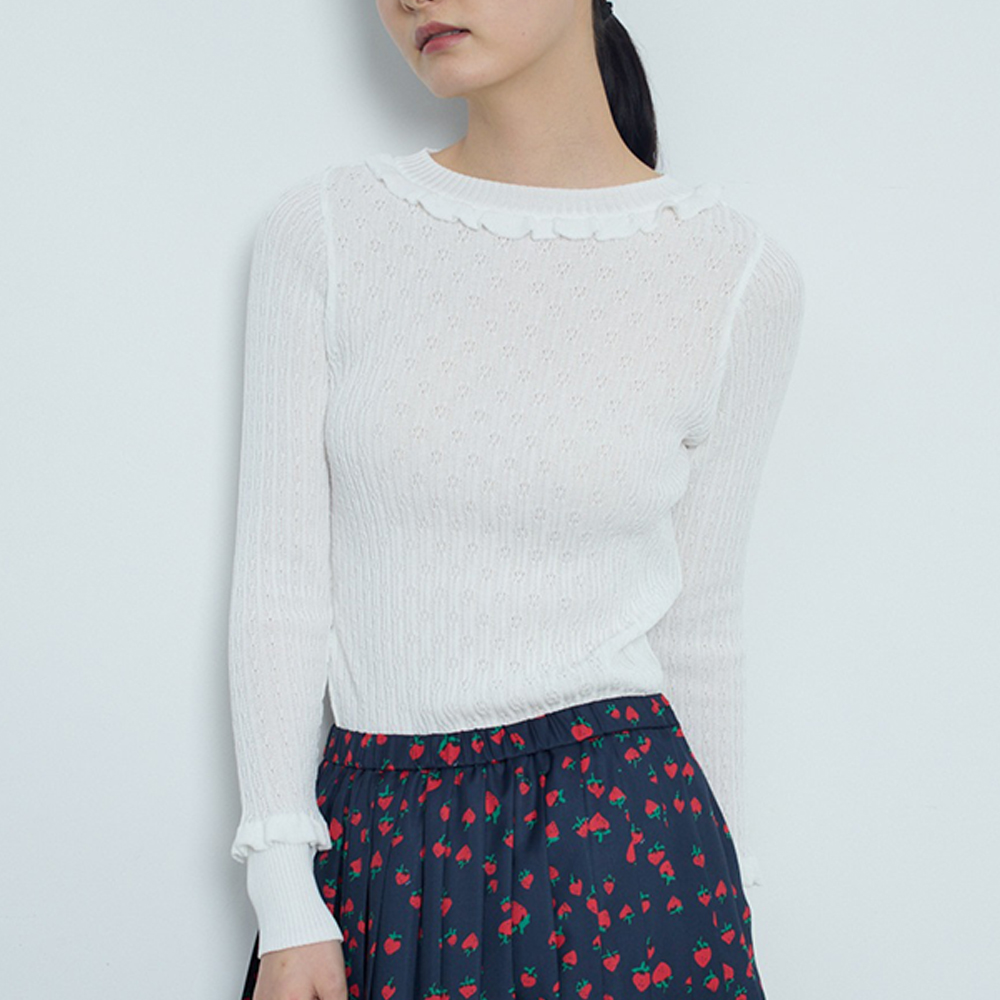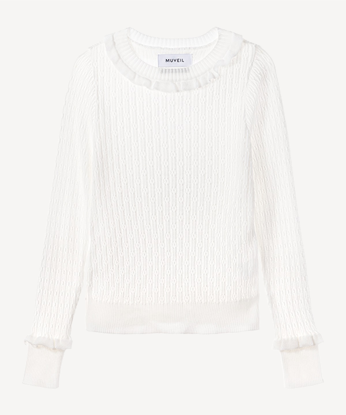 슬리브와 바디에 각기 다른 패턴의 니팅과 카라와 소매에 프릴로 임팩트를 준 슬림 실루엣 니트