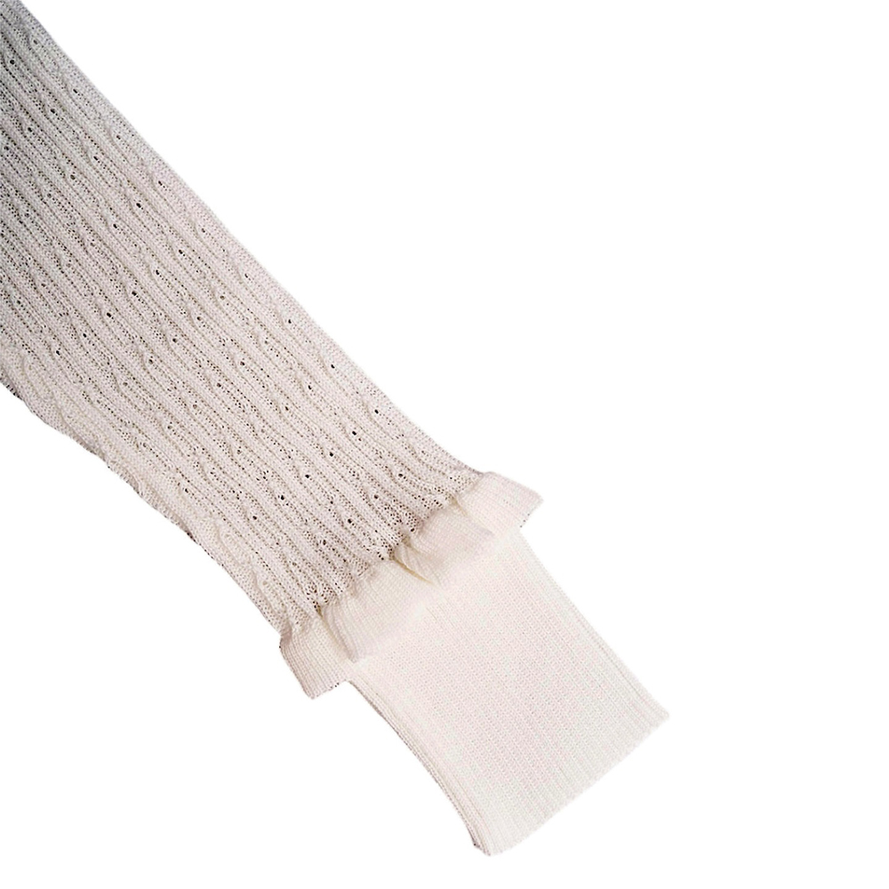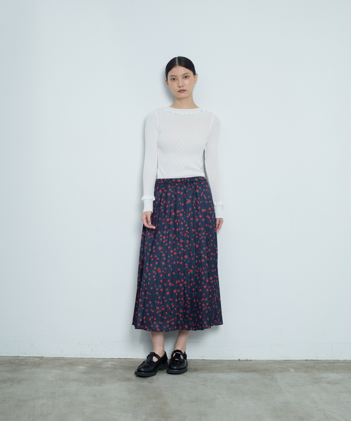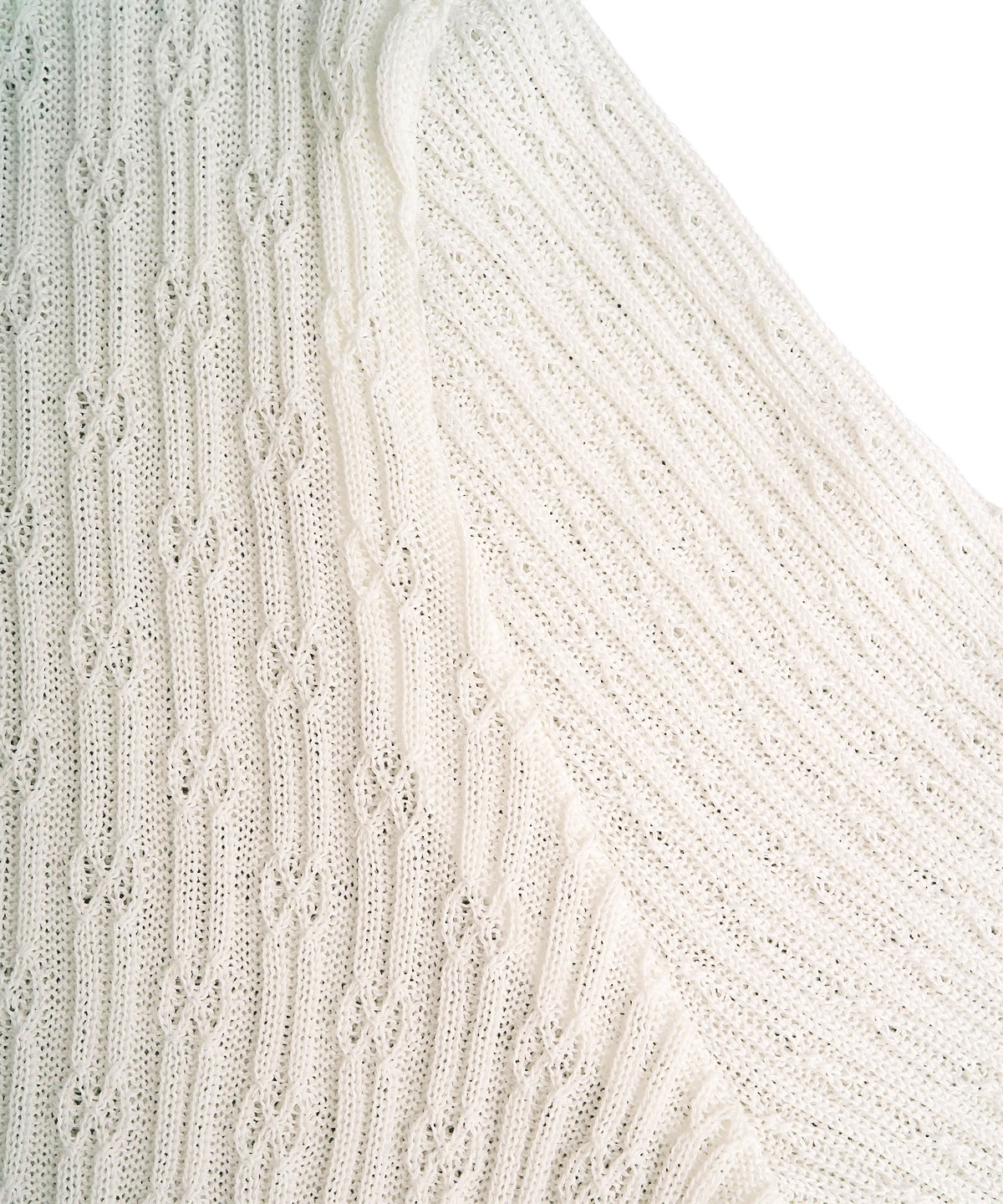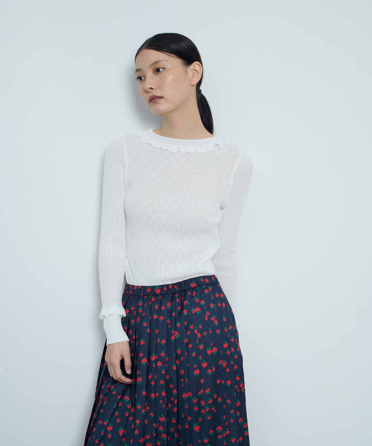 슬리브와 바디에 각기 다른 패턴의 니팅과 카라와 소매에 프릴로 임팩트를 준 슬림 실루엣 니트