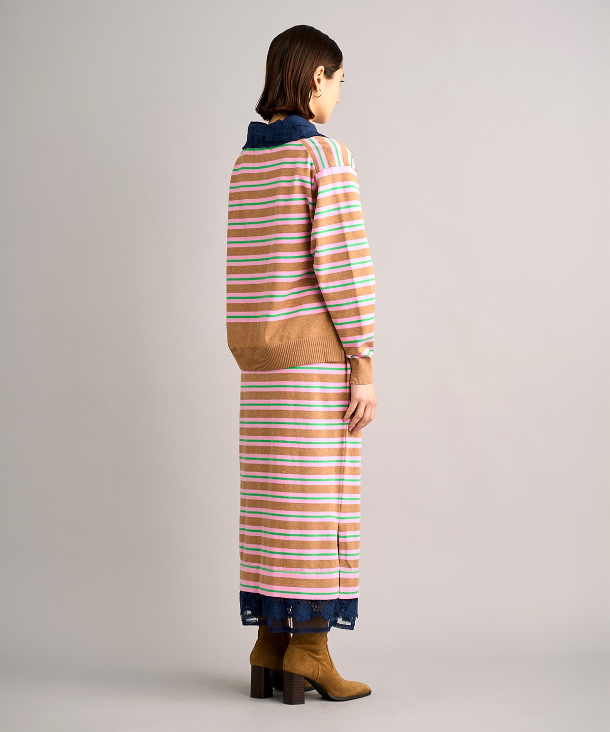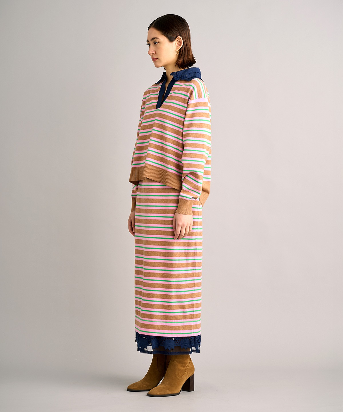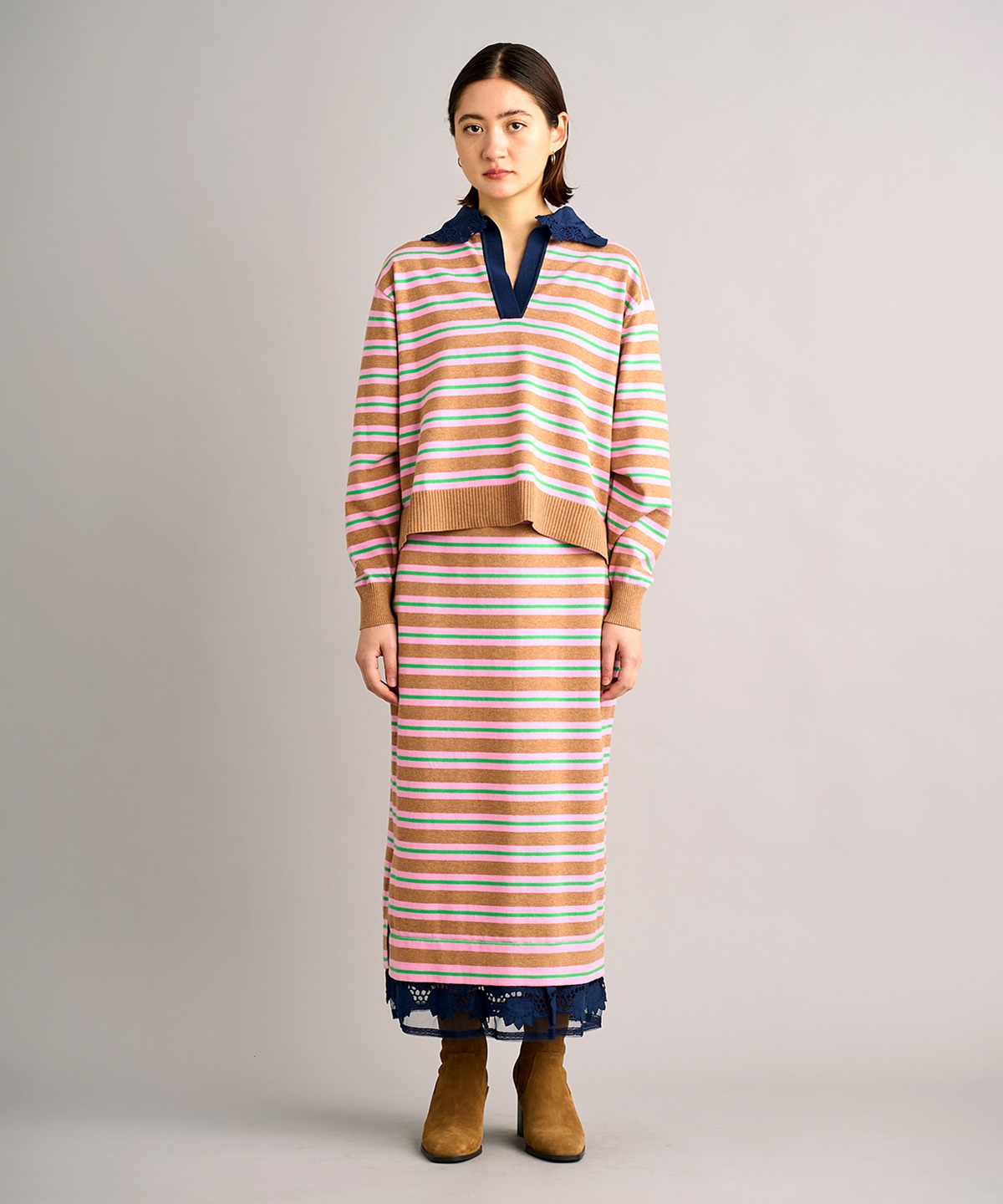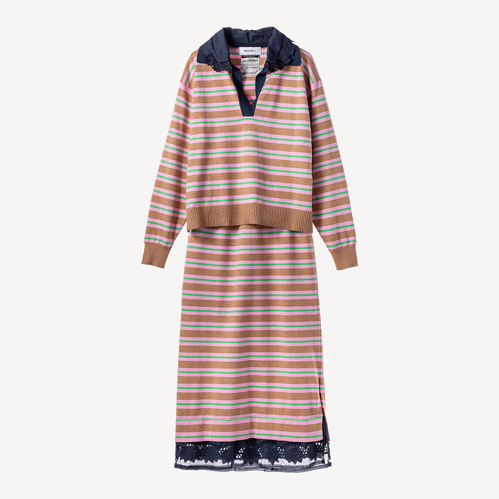 레트로한 스키퍼 넥라인의 레이스 카라가 달린 폴로 니트탑과 일자 핏의 니트 스커트 셋업. 레이스 카라는 분리 가능하여 자유로운 스타일링 연출 가능