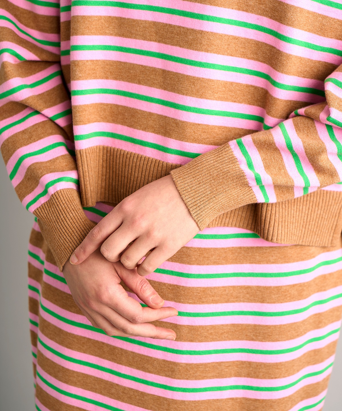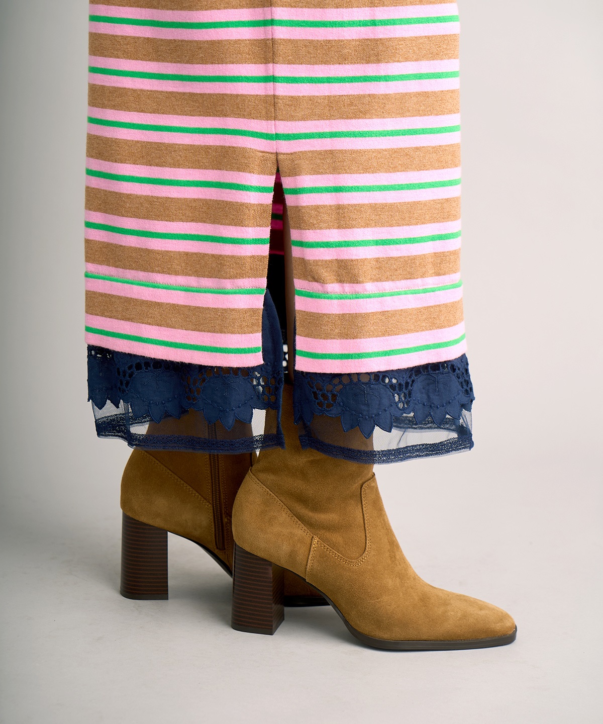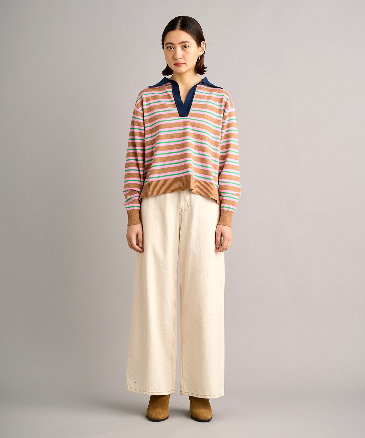 레트로한 스키퍼 넥라인의 레이스 카라가 달린 폴로 니트탑과 일자 핏의 니트 스커트 셋업. 레이스 카라는 분리 가능하여 자유로운 스타일링 연출 가능