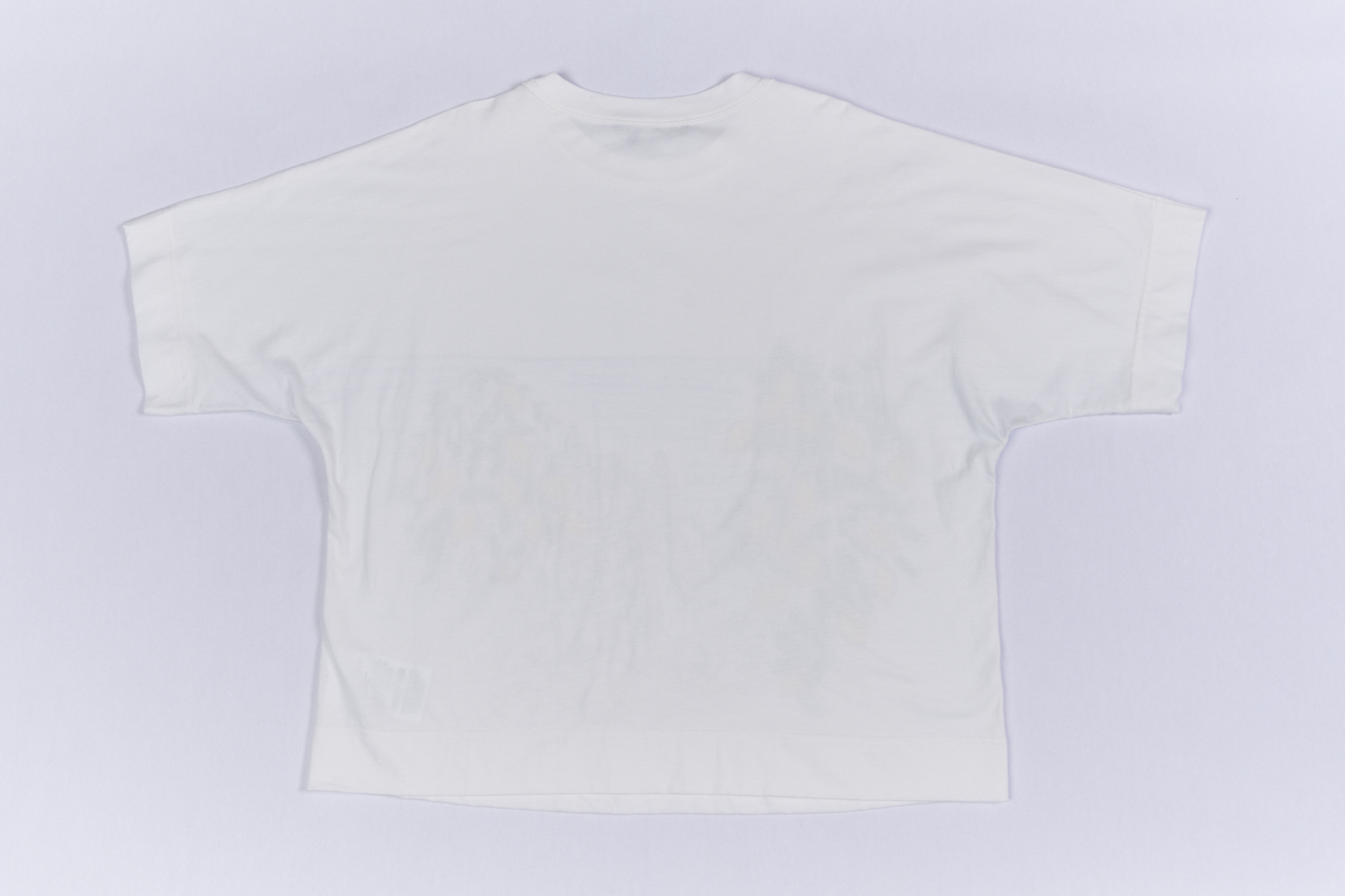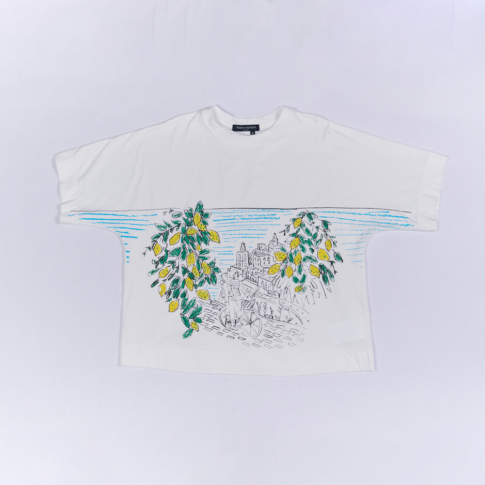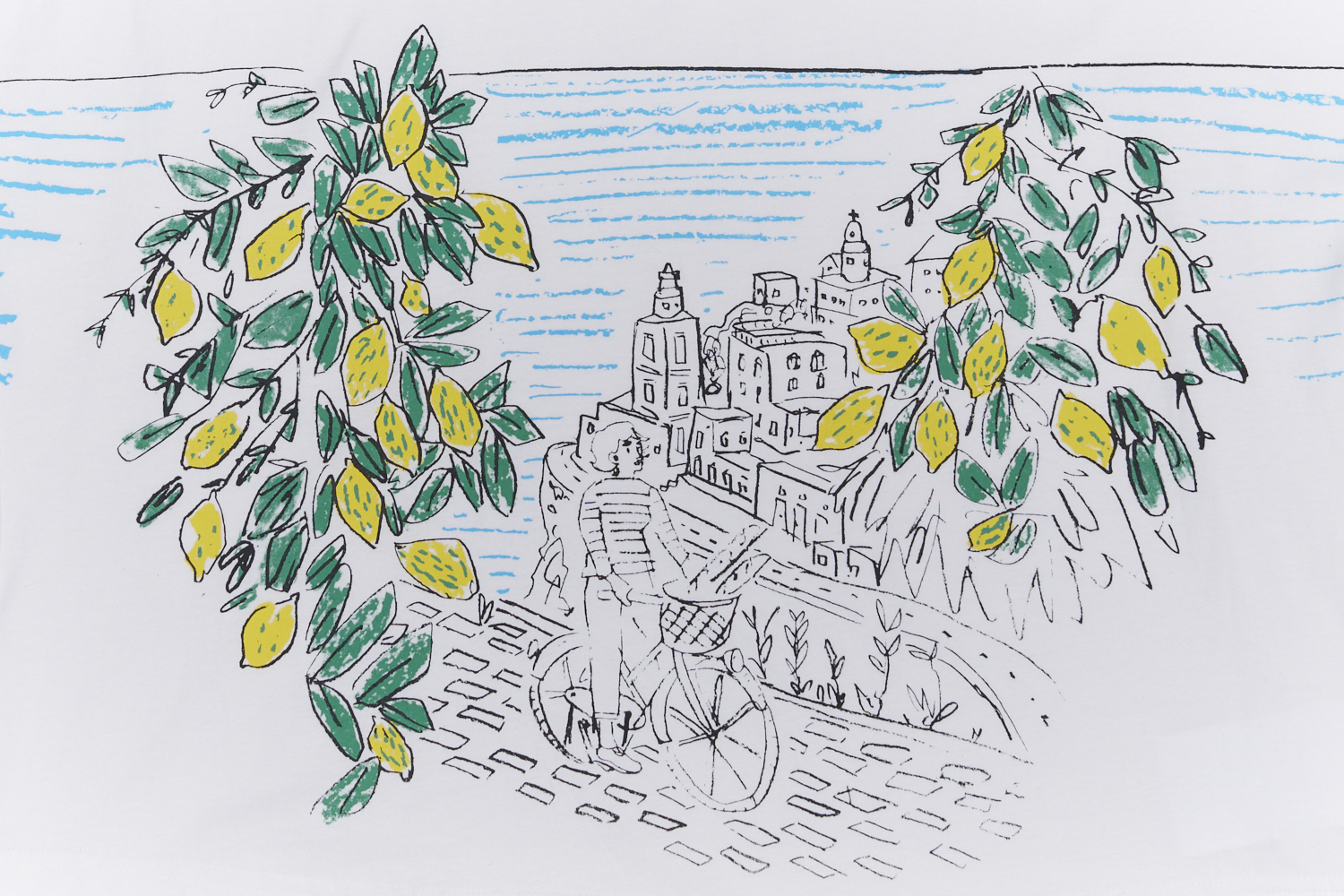 이탈리아 풍경 드로잉과 레몬트리 드로잉이 싱그러운 무드의 반팔 코튼 티셔츠. 어깨 절개가 없는 패턴으로 흐르는 듯한 실루엣이 포인트인 제품