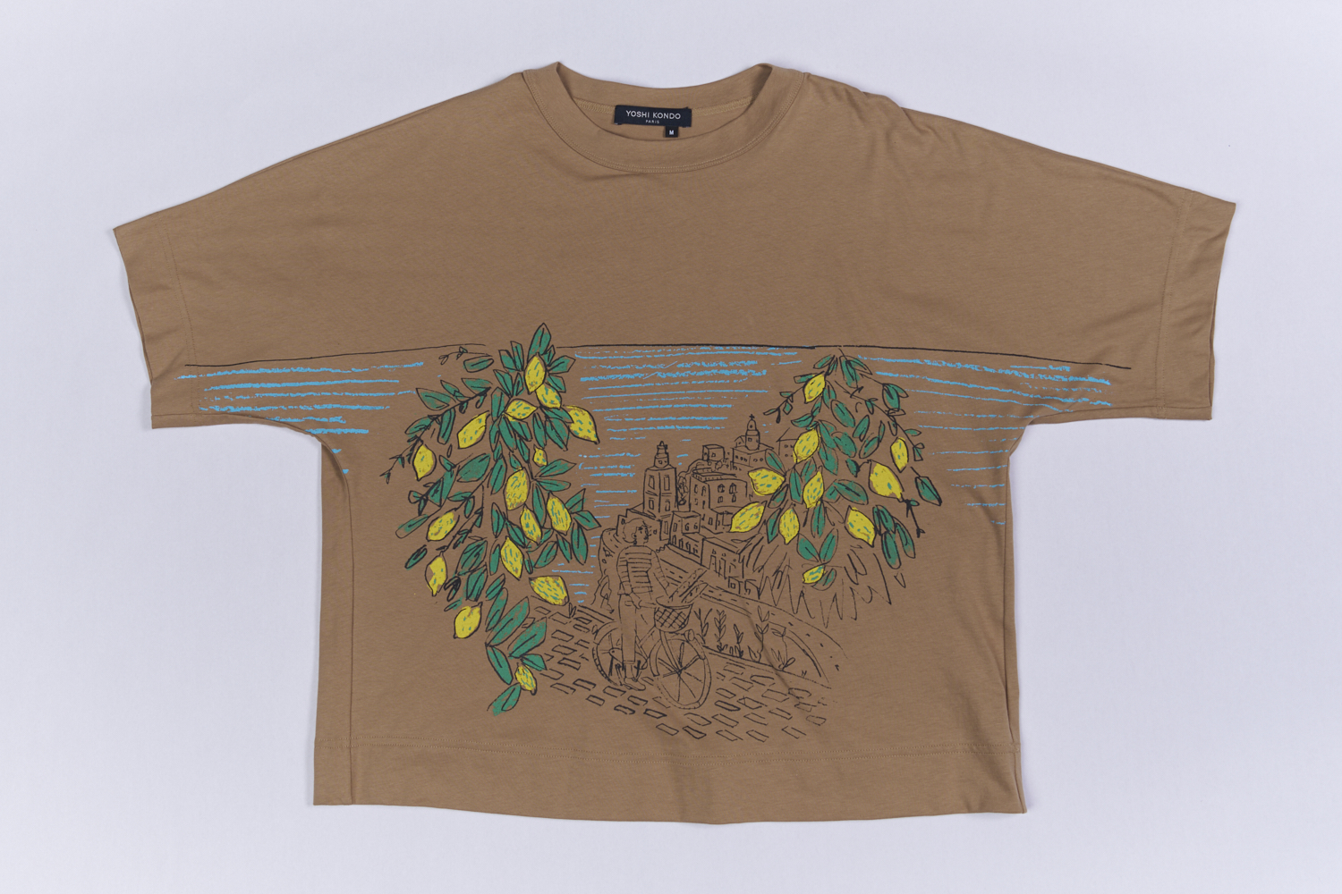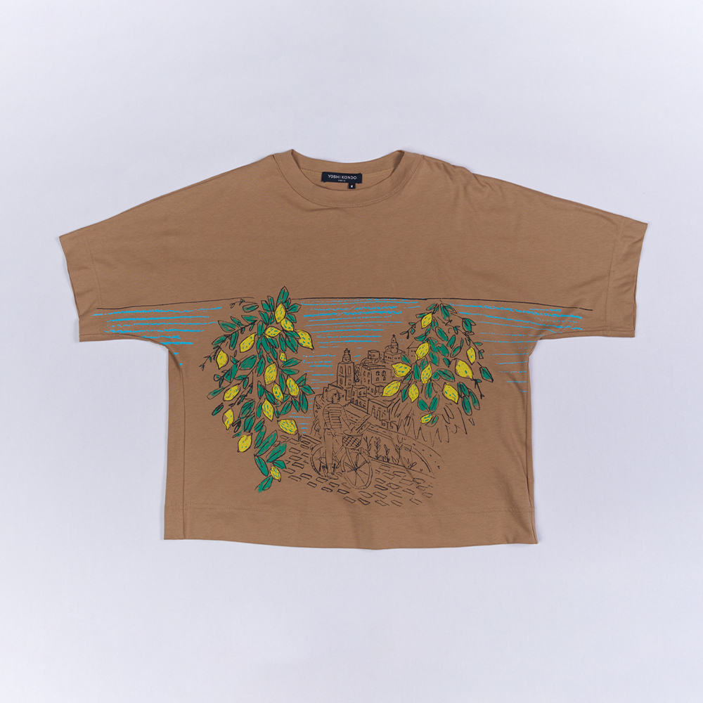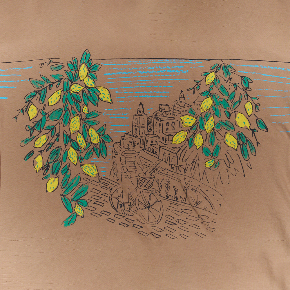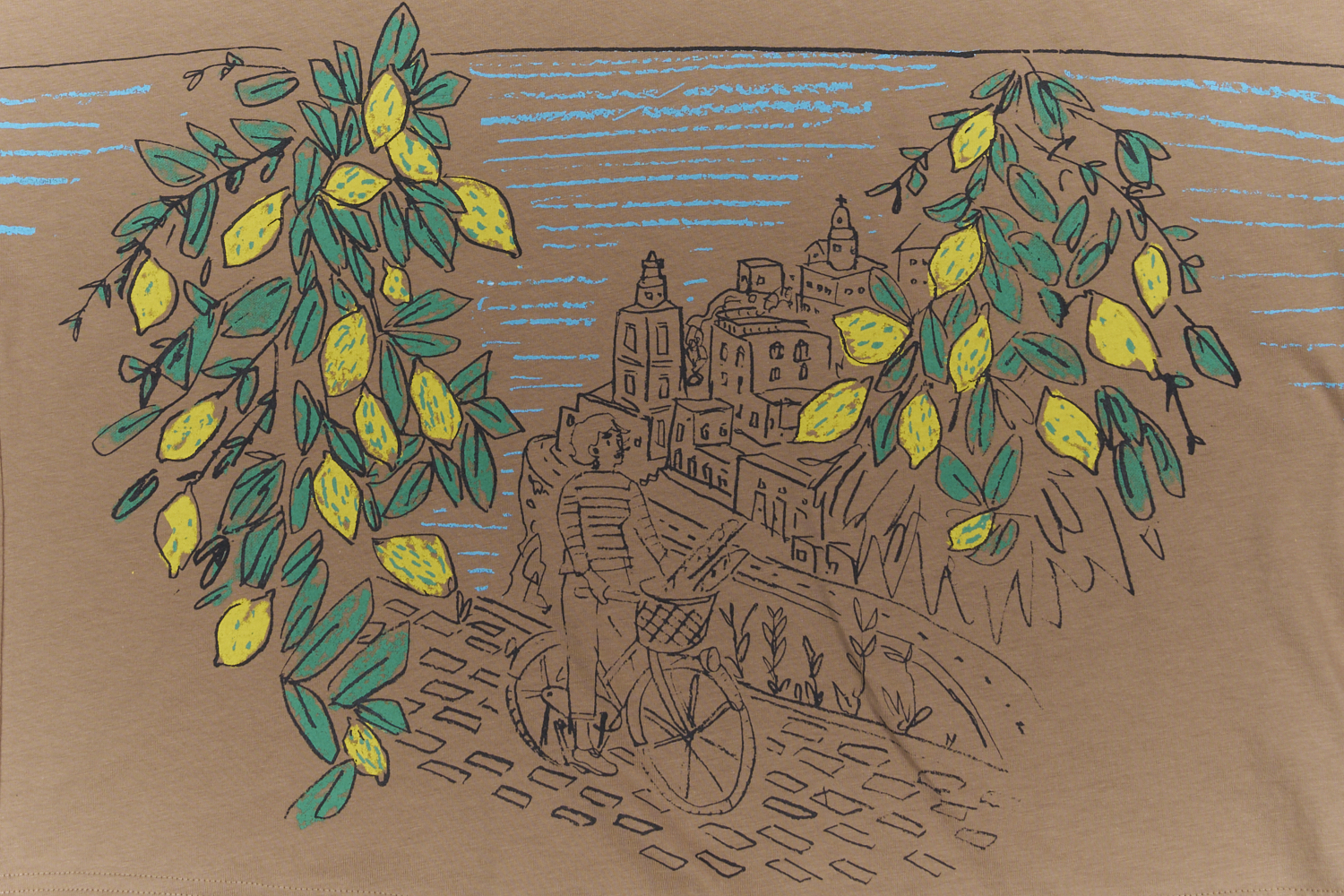 이탈리아 풍경 드로잉과 레몬트리 드로잉이 싱그러운 무드의 반팔 코튼 티셔츠. 어깨 절개가 없는 패턴으로 흐르는 듯한 실루엣이 포인트인 제품
