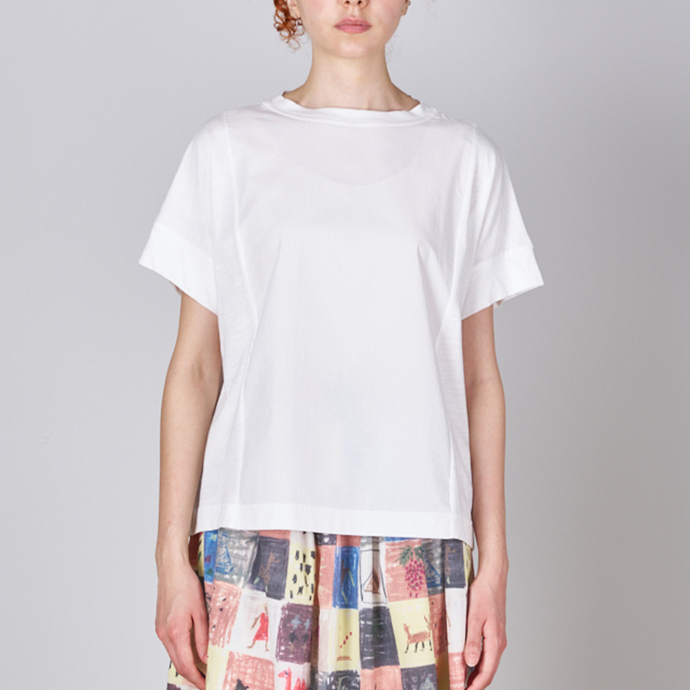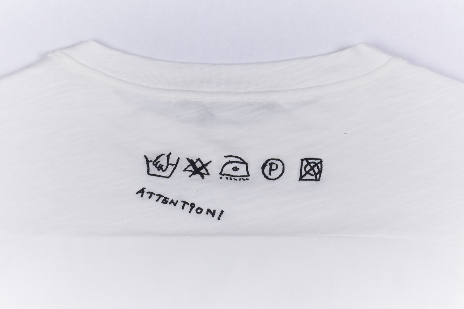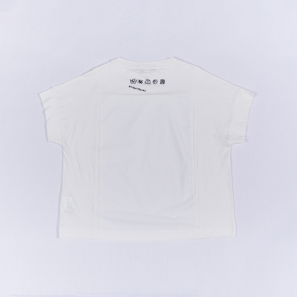 심플한 모노 컬러톤에 두 가지 소재 패턴의 콤비로 밋밋하지 않은 반팔 코튼 티셔츠. 뒷 목에 브랜드 시그니처인 세탁기호 아이콘 프린팅이 귀여운 포인트인 제품