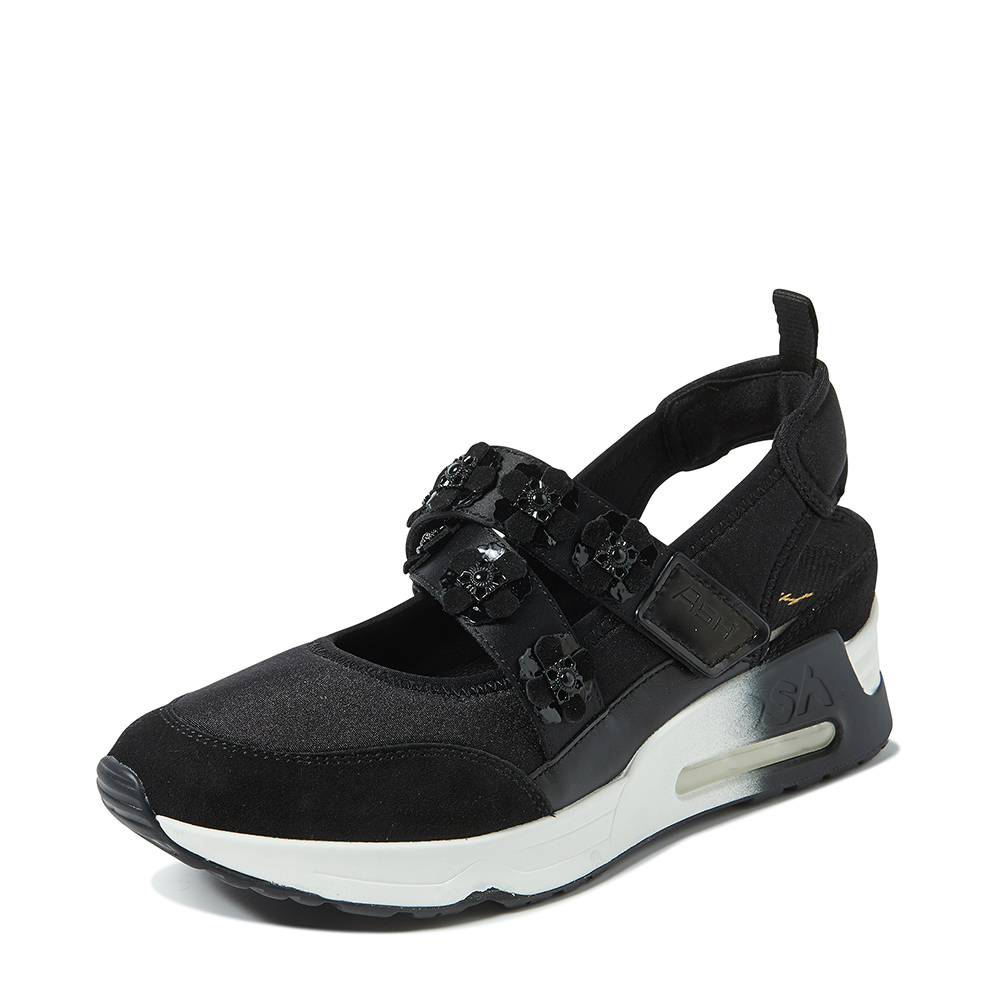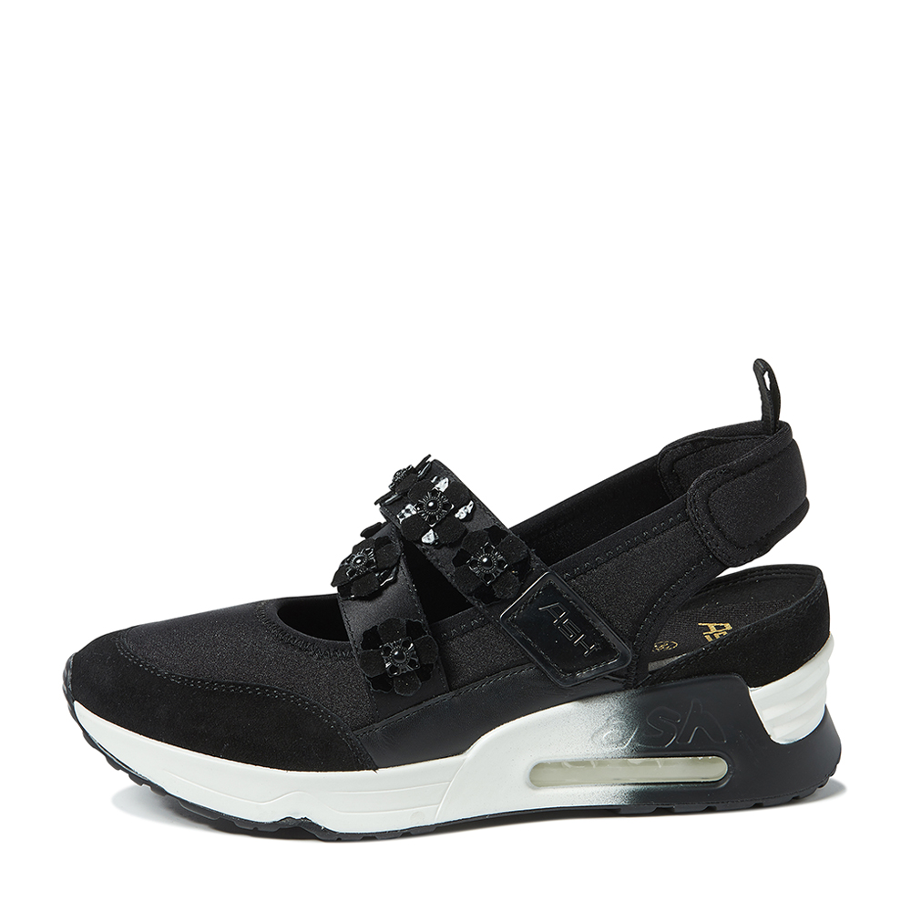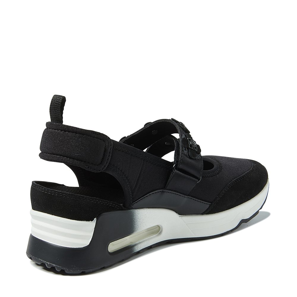 - 메리제인 무드의 플라워 스트랩과 프리미엄 가죽과 라이크라 소재를 적용한 에어힐 샌들