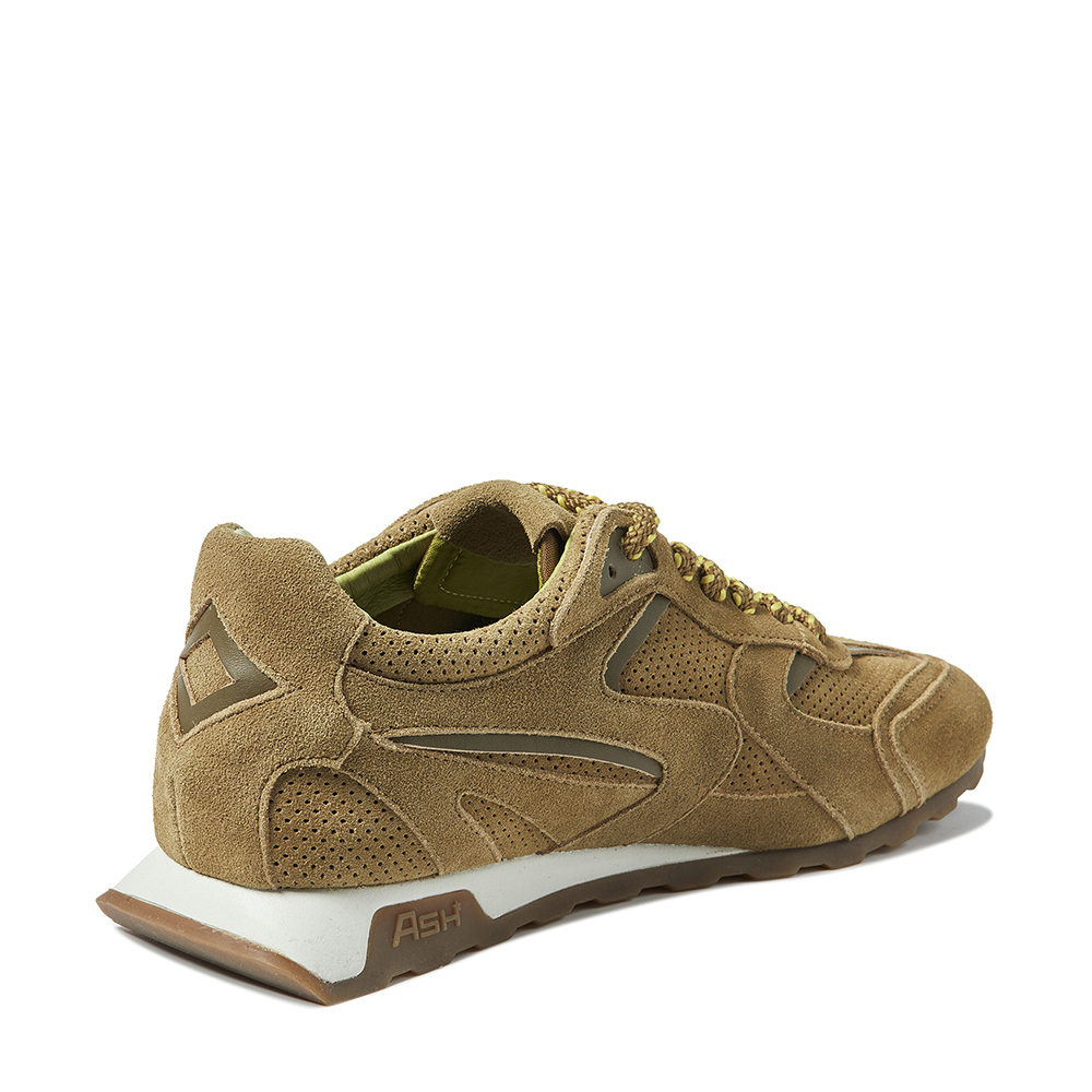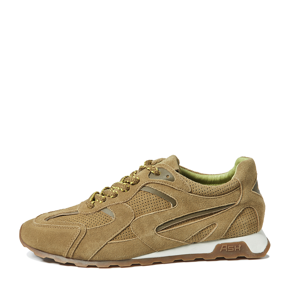 - 사선으로 날렵하게 뻗은 화이트 컬러 아웃솔에 아쉬 로고가 새겨진 브라운 톤의 밑창이 조화를 이루는 스니커즈