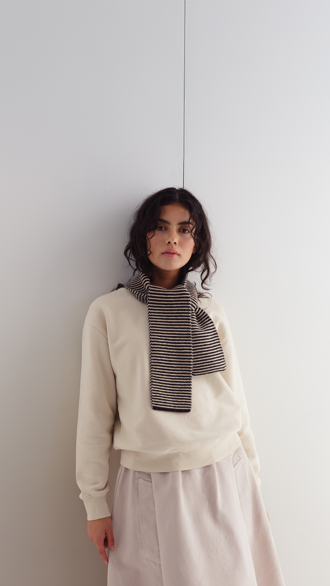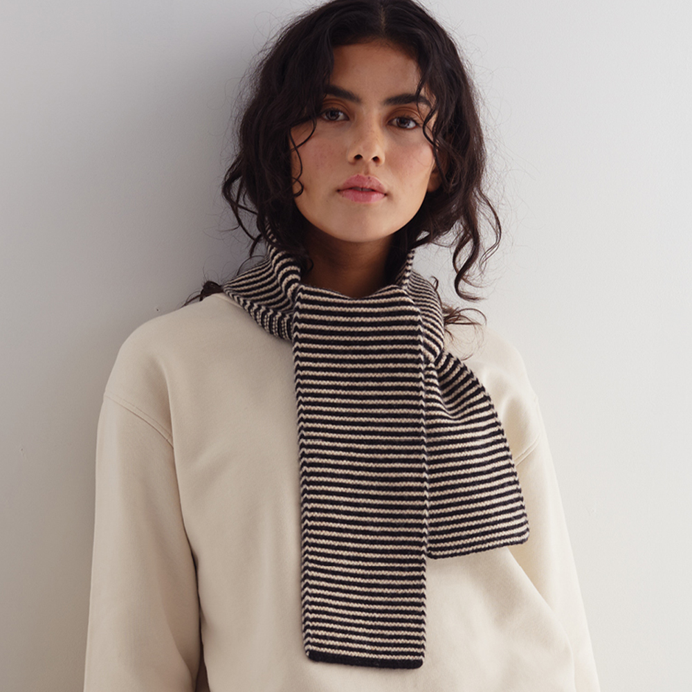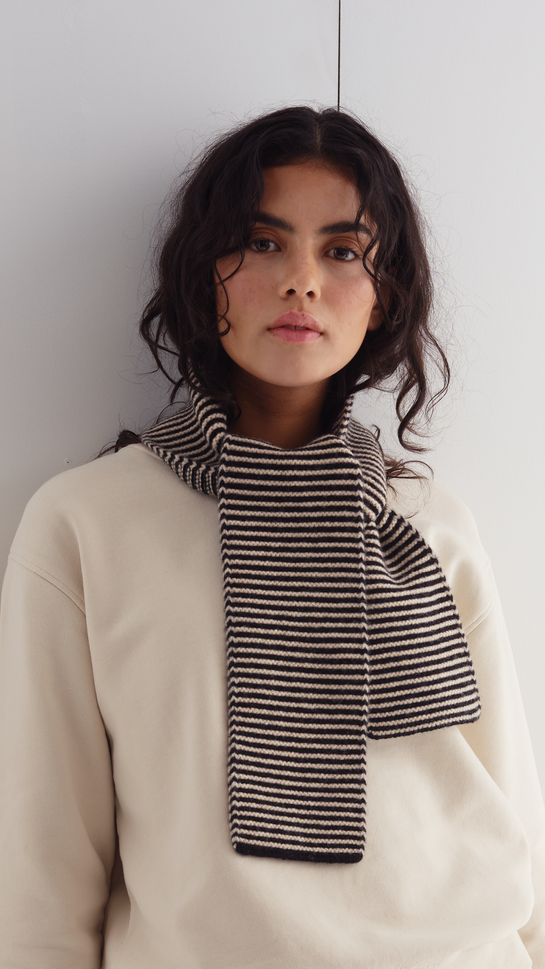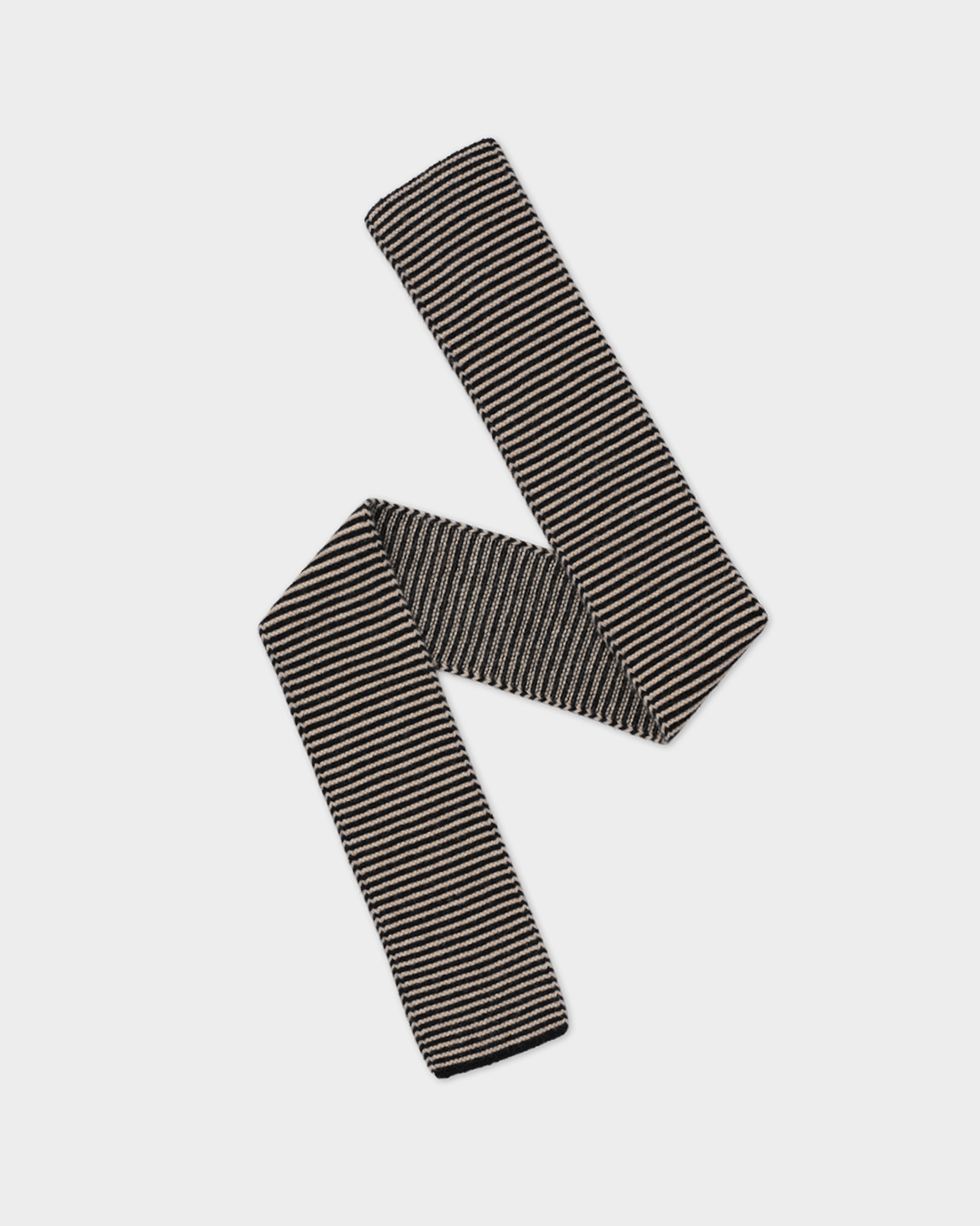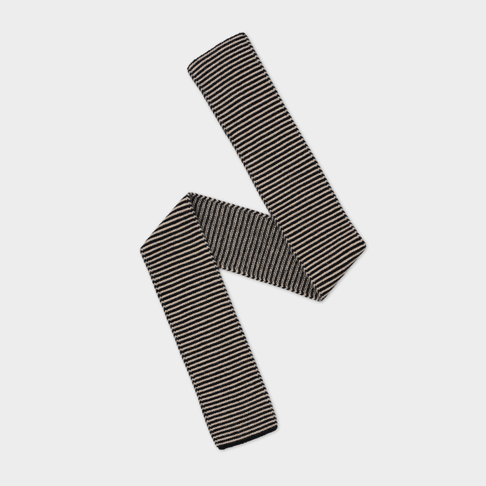 가터스티치로 텍스쳐가 독특한 쁘띠 사이즈의 스트라이프 스카프. 스코틀랜드의 니트웨어 브랜드인 조 고든의 유니섹스 제품