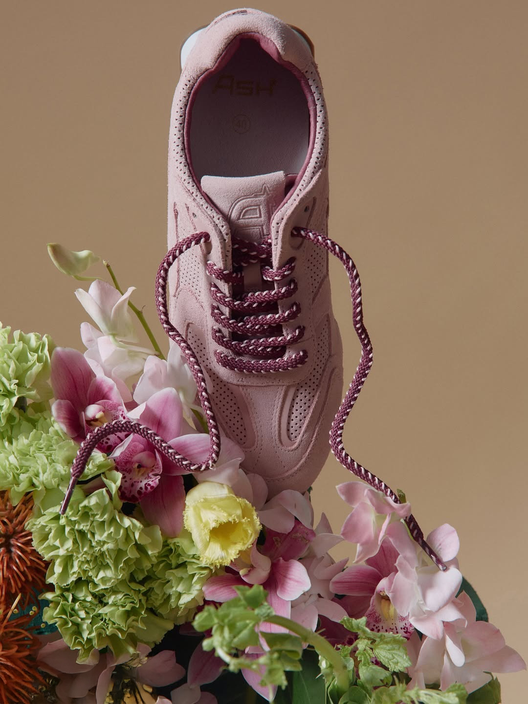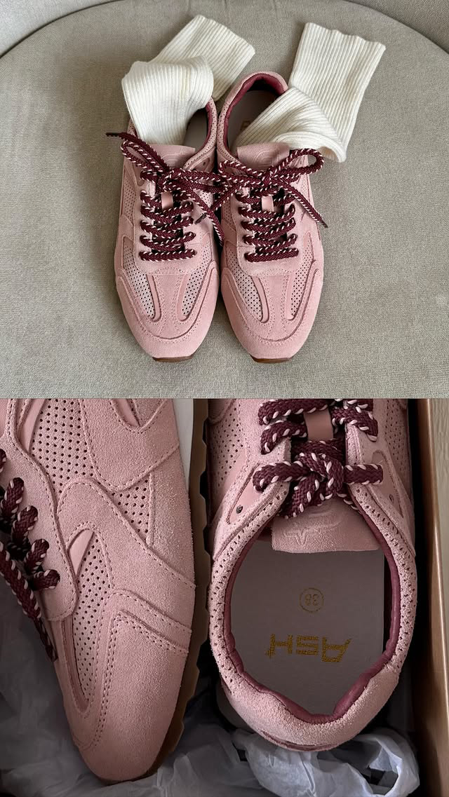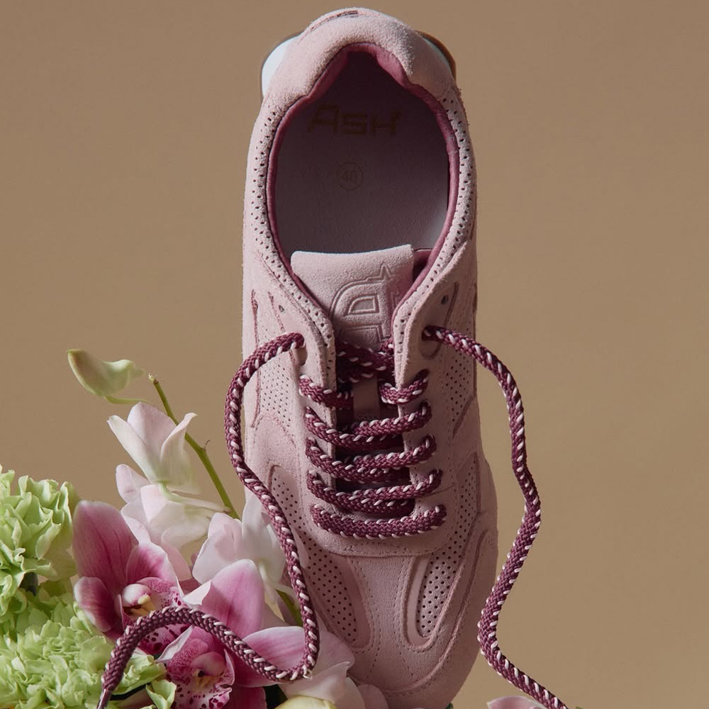 - 사선으로 날렵하게 뻗은 화이트 컬러 아웃솔에 아쉬 로고가 새겨진 브라운 톤의 밑창이 조화를 이루는 스니커즈