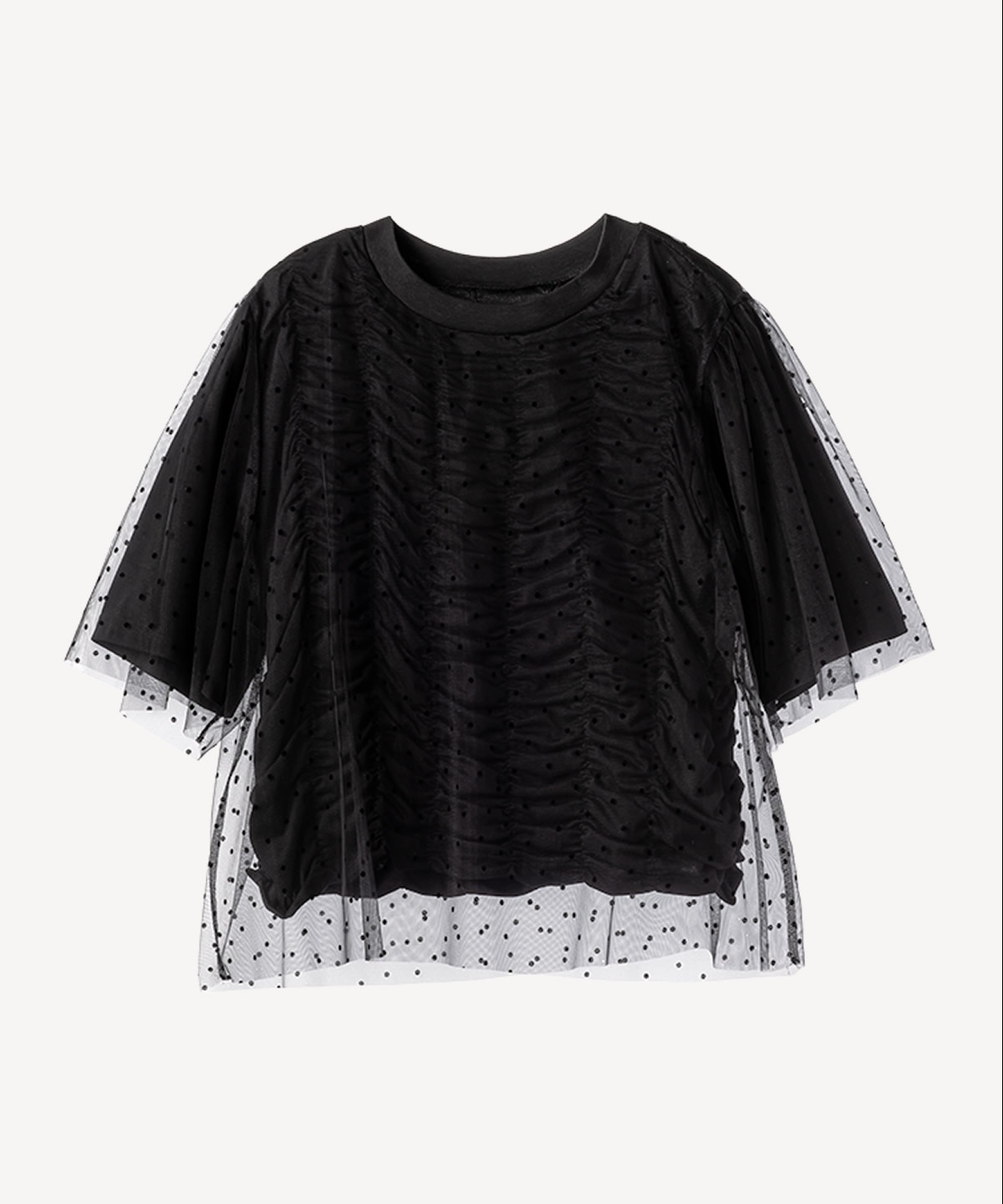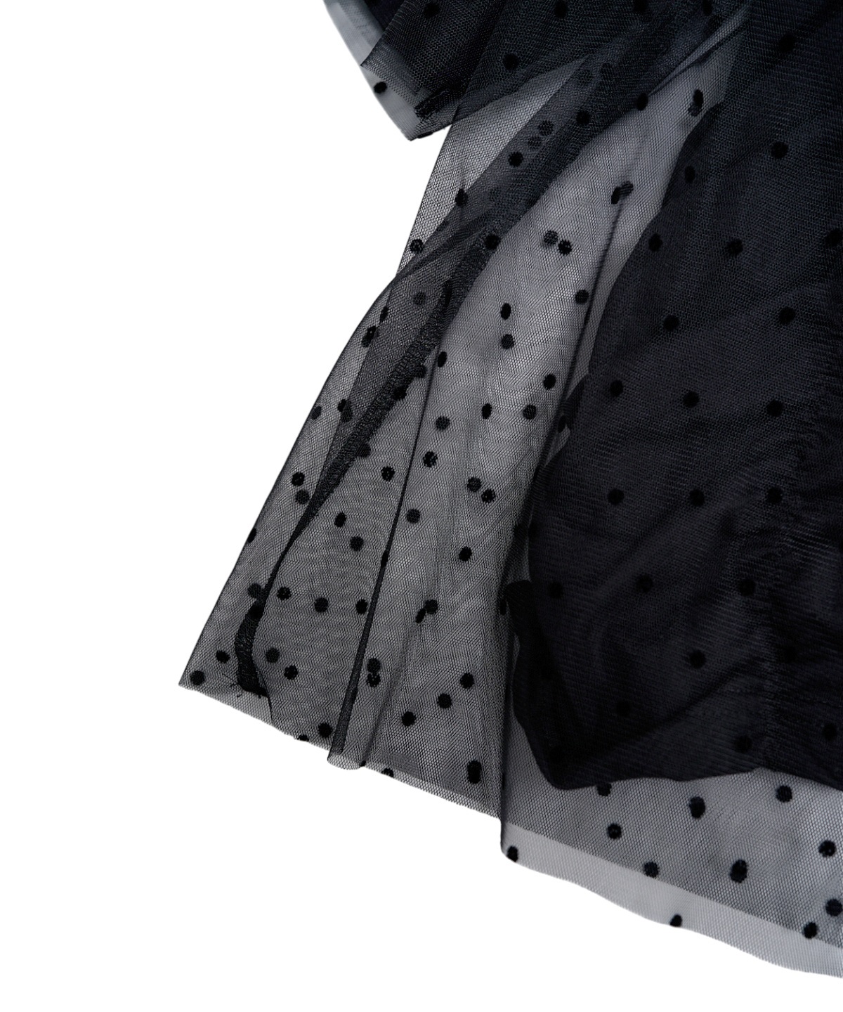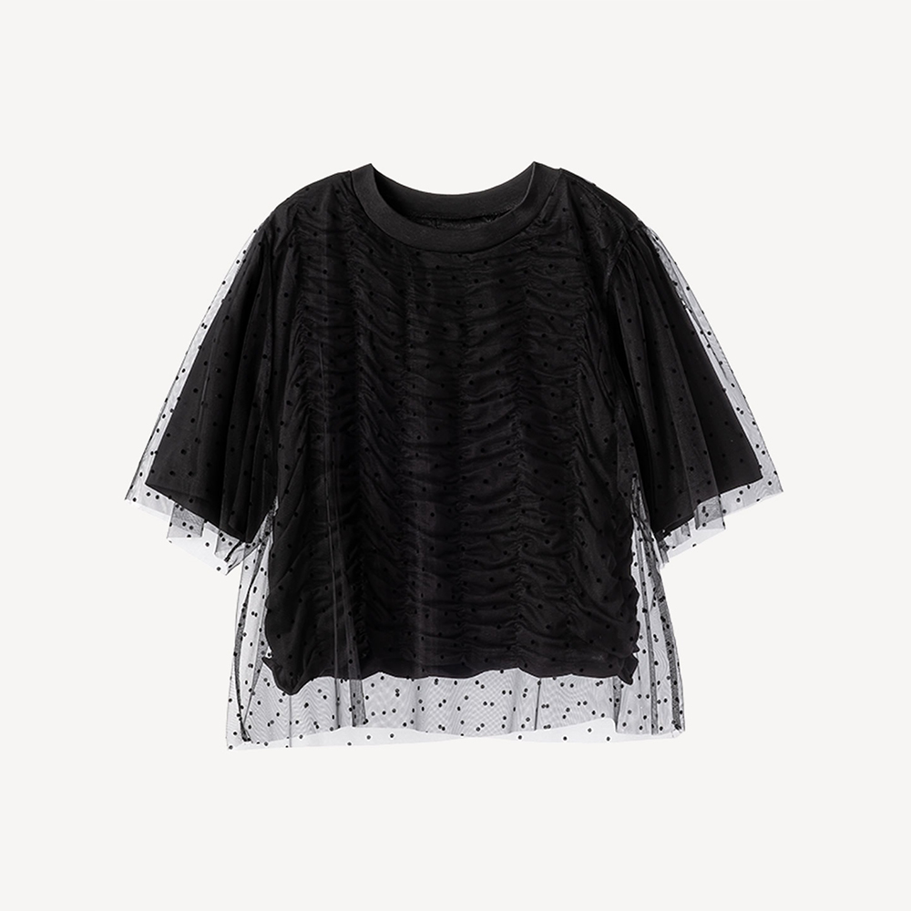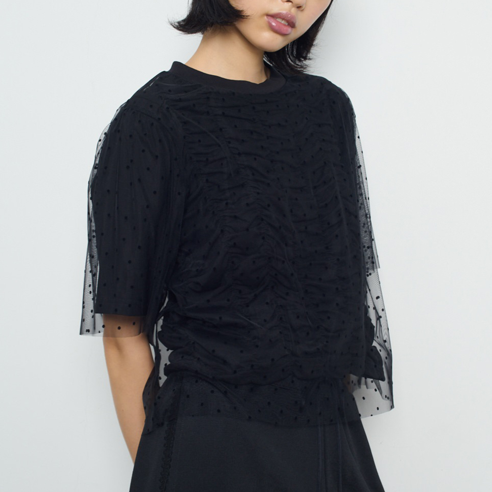 닻에서 영감받은 가로 셔링 반팔 풀오버에 도트 프린트 튤이 펑키하면서도 러블리한 무드의 제품