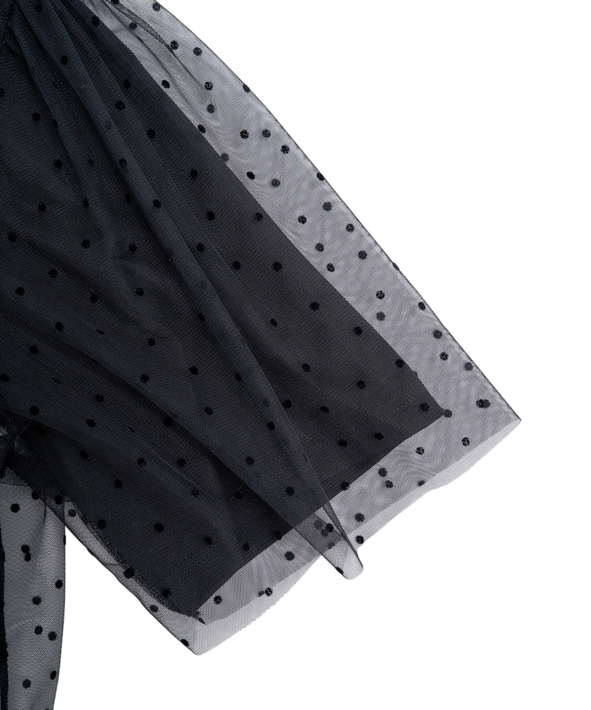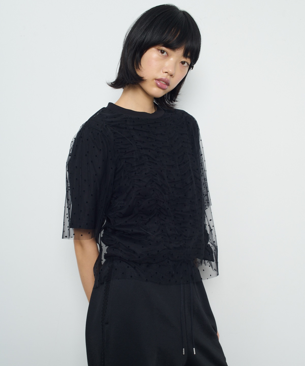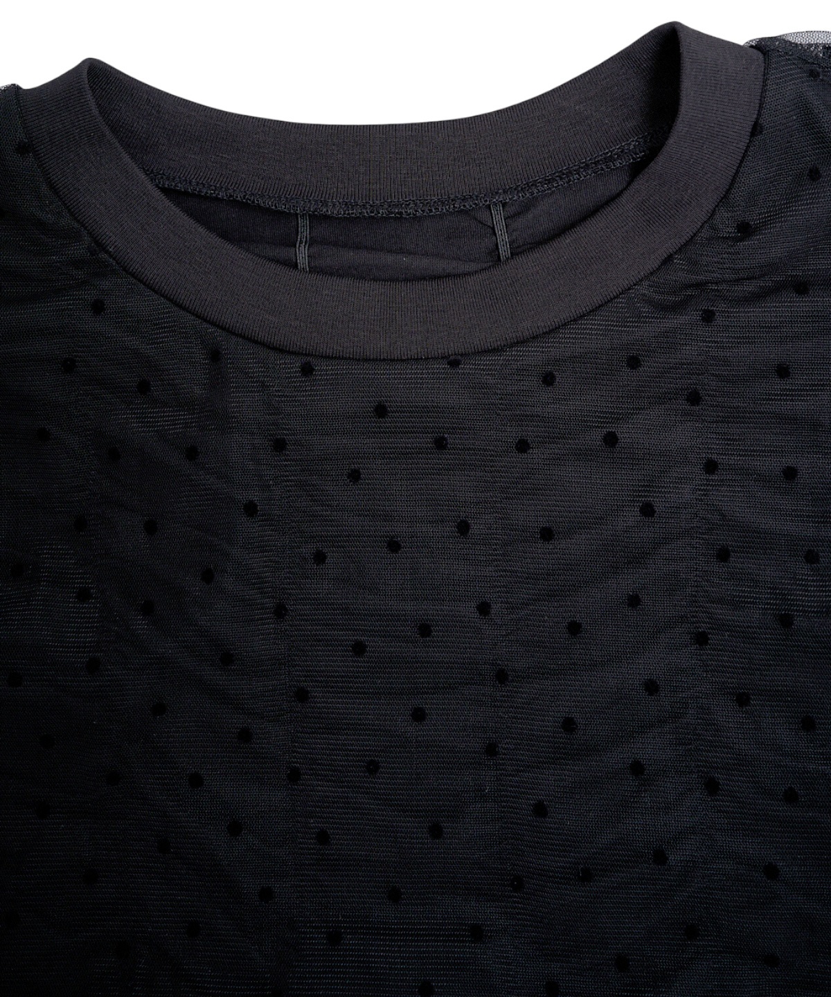 닻에서 영감받은 가로 셔링 반팔 풀오버에 도트 프린트 튤이 펑키하면서도 러블리한 무드의 제품