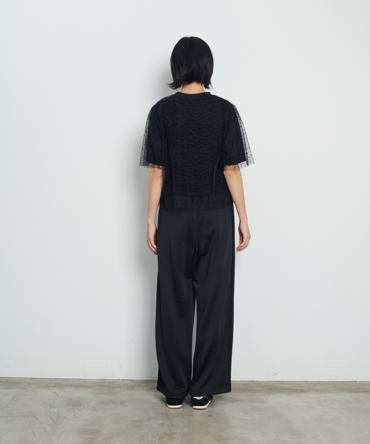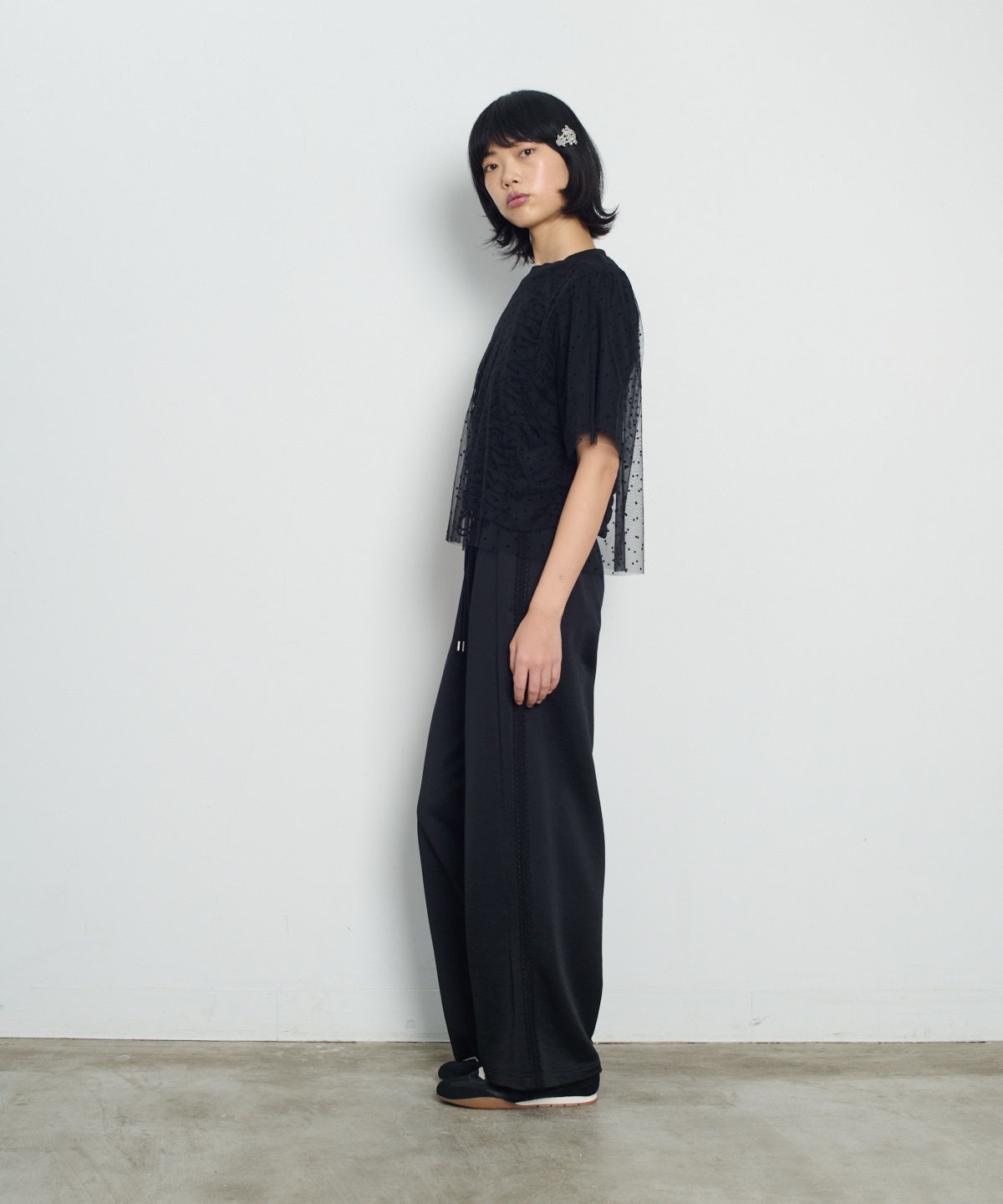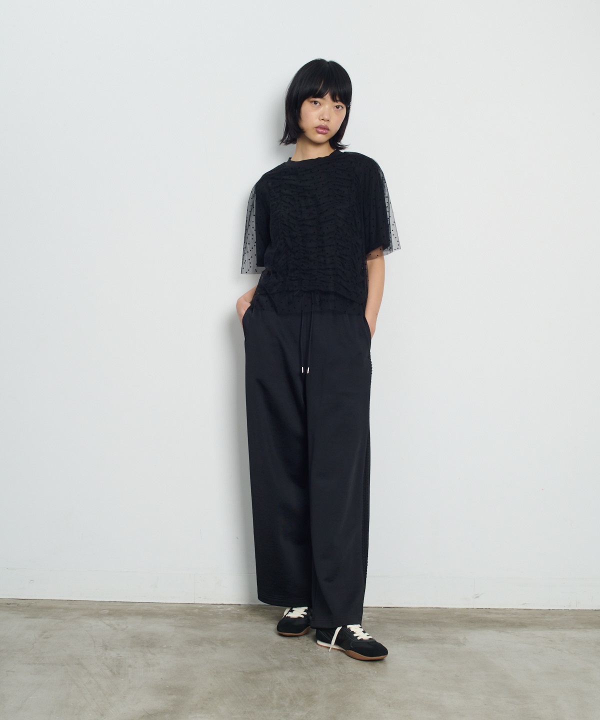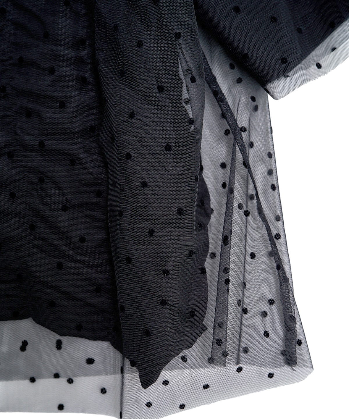 닻에서 영감받은 가로 셔링 반팔 풀오버에 도트 프린트 튤이 펑키하면서도 러블리한 무드의 제품